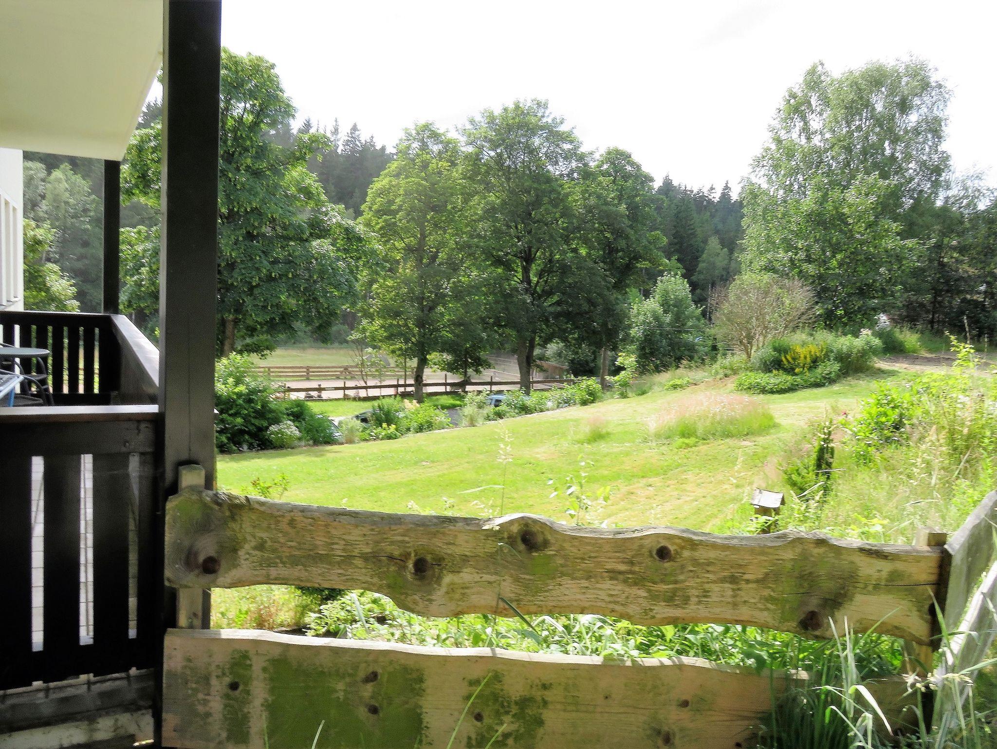 Vom Essbereich gelangt man ebenerdig direkt auf die kleine Terrasse, die über einen Tisch, Stühle mit Auflagen, einen Grill und einen Sonnenschirm verfügt. Von dort hat man über die angrenzende Wiese einen schönen Blick auf das Gelände des Reiterhofs Finkenmühle.