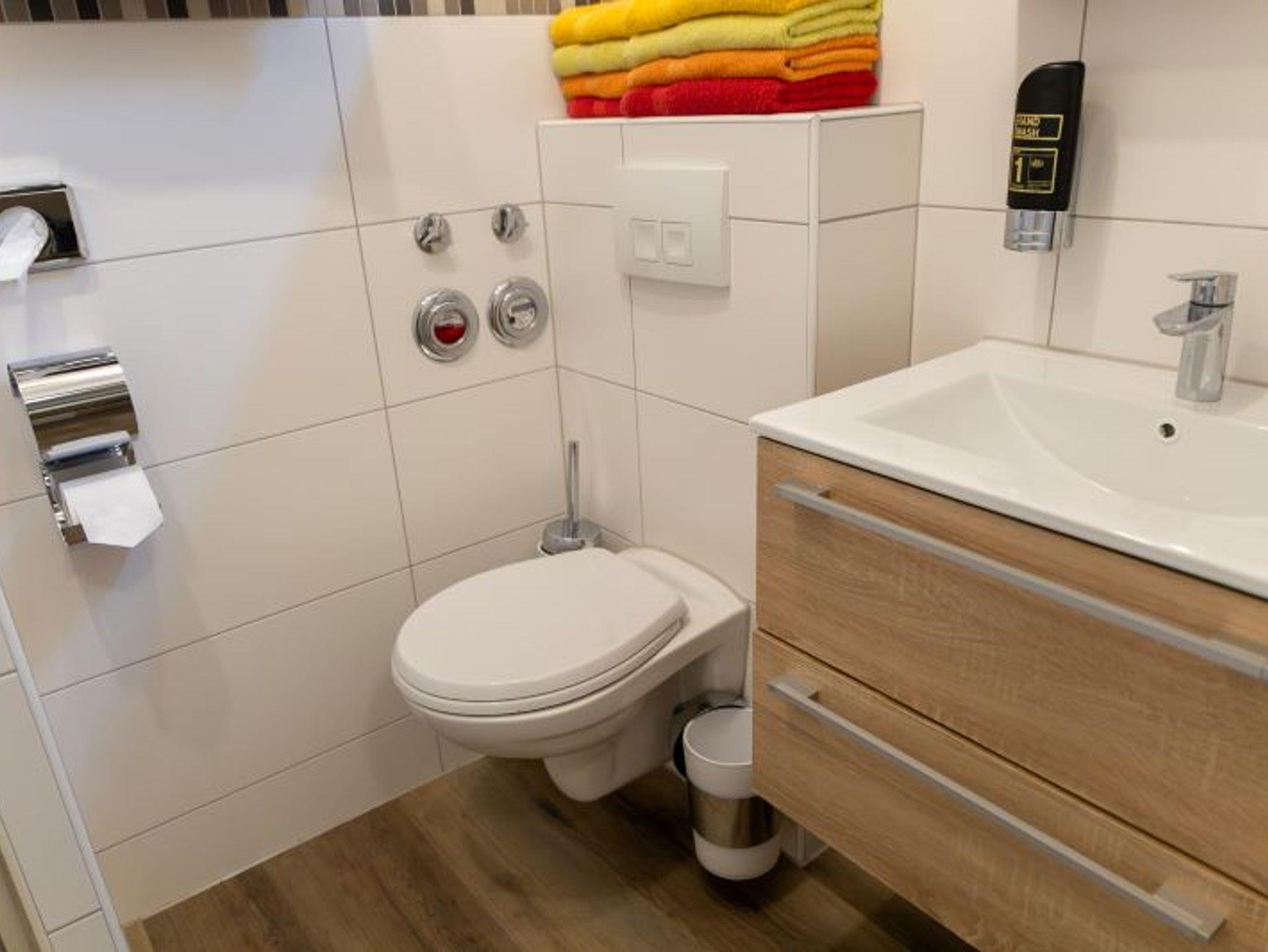 Das Bad verfügt über einen Waschtisch mit beleuchtetem Spiegelschrank, eine Dusche und WC.