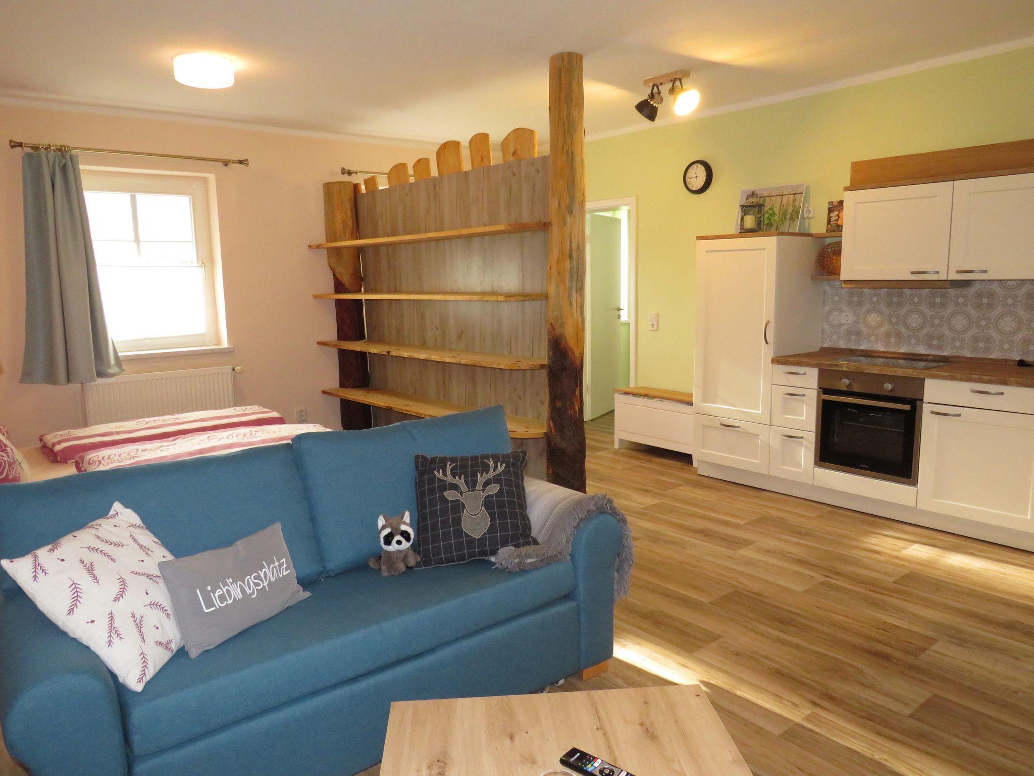 Unsere 45 m² große Ferienwohnung Hirsch verfügt über einen kombinierten Schlaf-, Wohn- und Küchenbereich, Flur und Duschbad. Sie ist mit einem Doppelbett, einer Schlafcouch für 2 Personen, Flatscreen und kostenlosem Wifi ausgestattet. Die Küchenzeile verfügt über einen Herd mit Backofen, einen Geschirrspüler, eine Filterkaffeemaschine, Toaster und Wasserkocher. Bettwäsche und Handtücher sind inklusive.