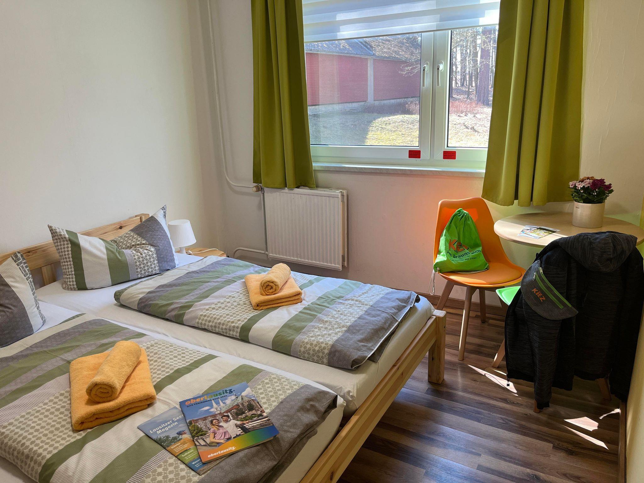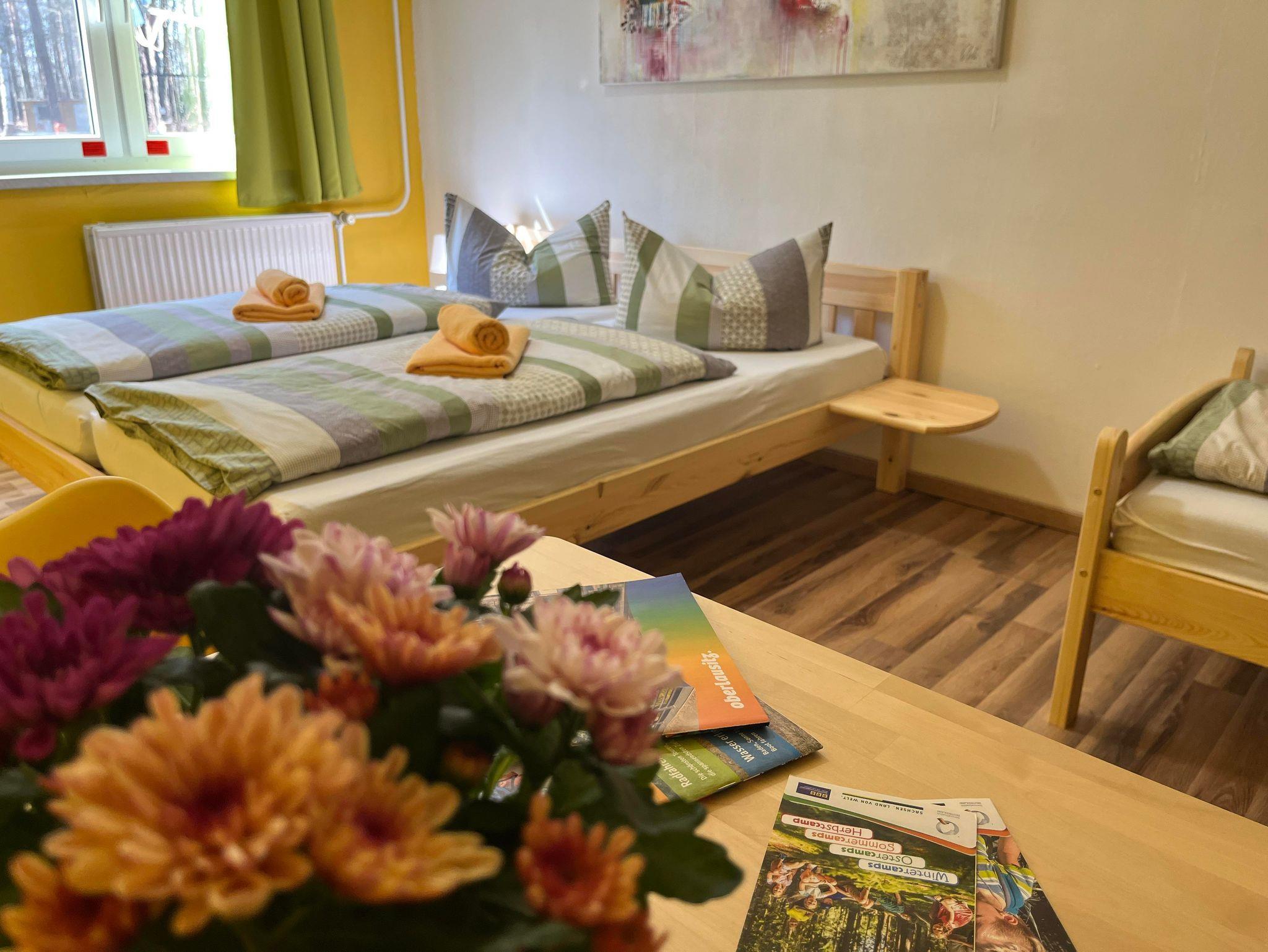 Unsere Familienzimmer ähneln einer kleinen Wohneiheit. Sie verfügen über zwei separate Schlafzimmer, Flur und Bad mit Dusche. Das größere Schlafzimmer ist mit einem Doppelbett und einem Einzelbett, Schrank, Tisch und Stühlen ausgestattet. Im kleinen Schlafzimmer befindet sich ein Doppelbett, Schrank, Tish und Stuhl. Bettwäsche und Handtücher sind inklusive.