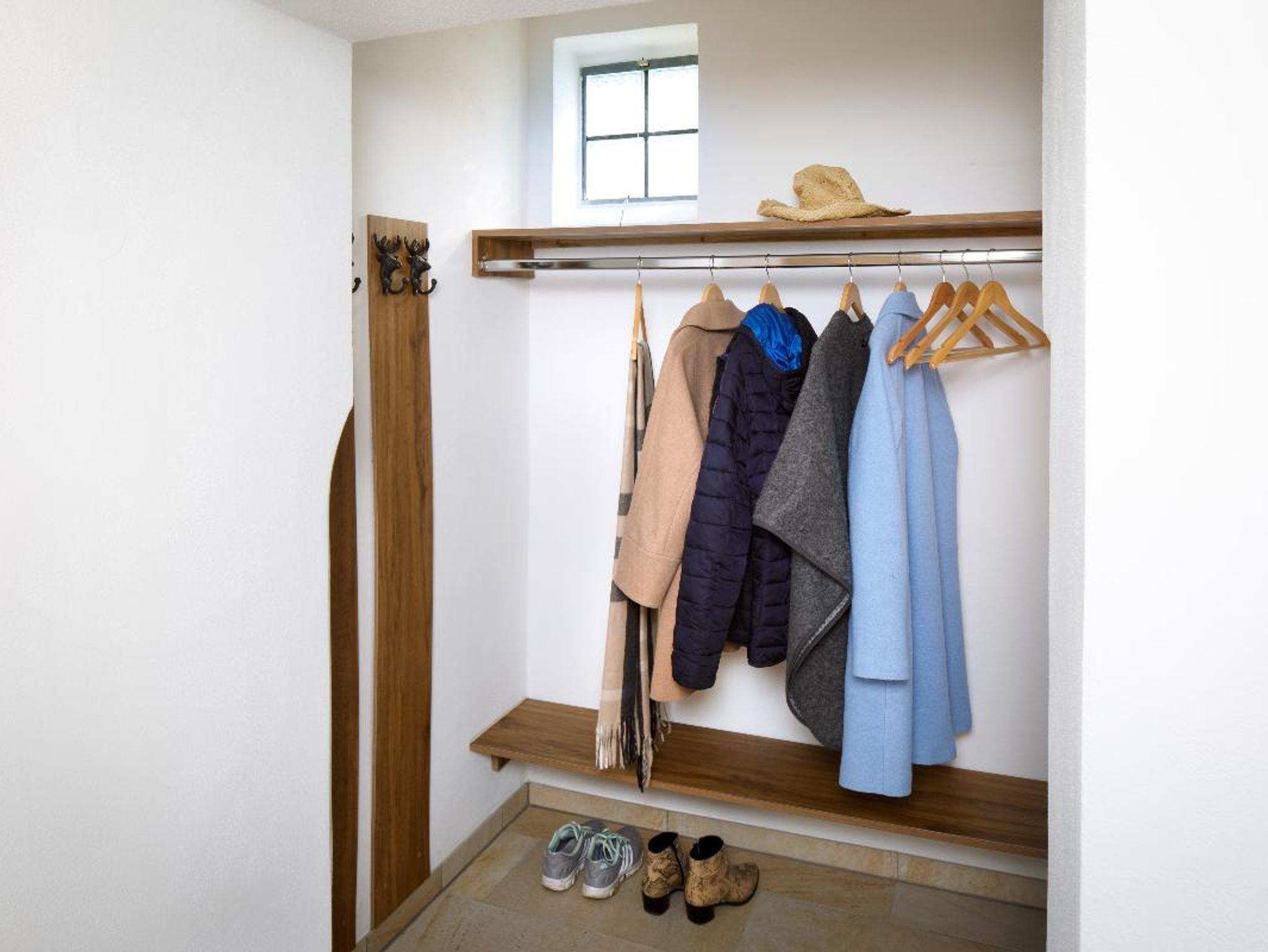 • Eine großzügig gehaltener Garderobenraum schafft Platz für Kleidung, Koffer und Schuhe.