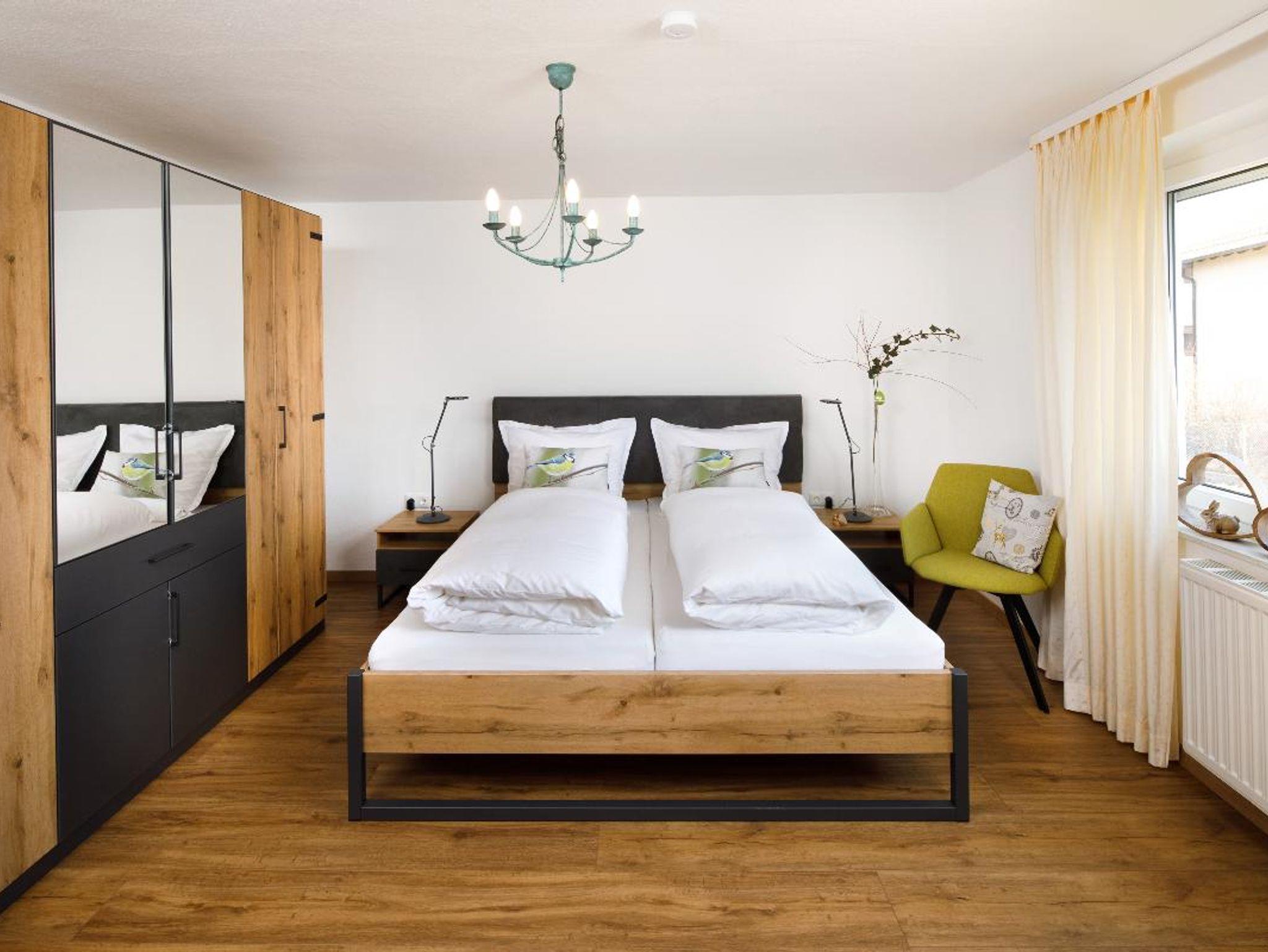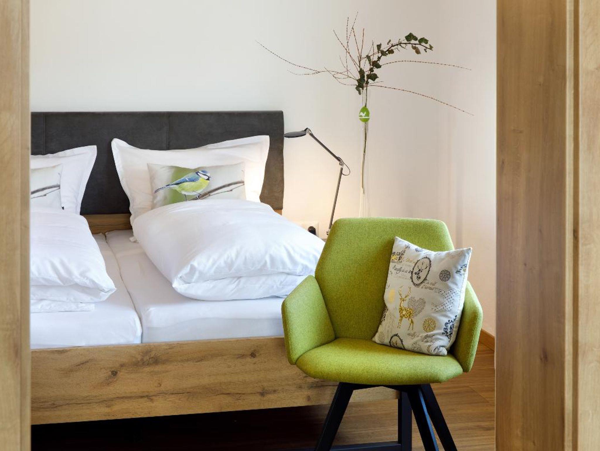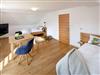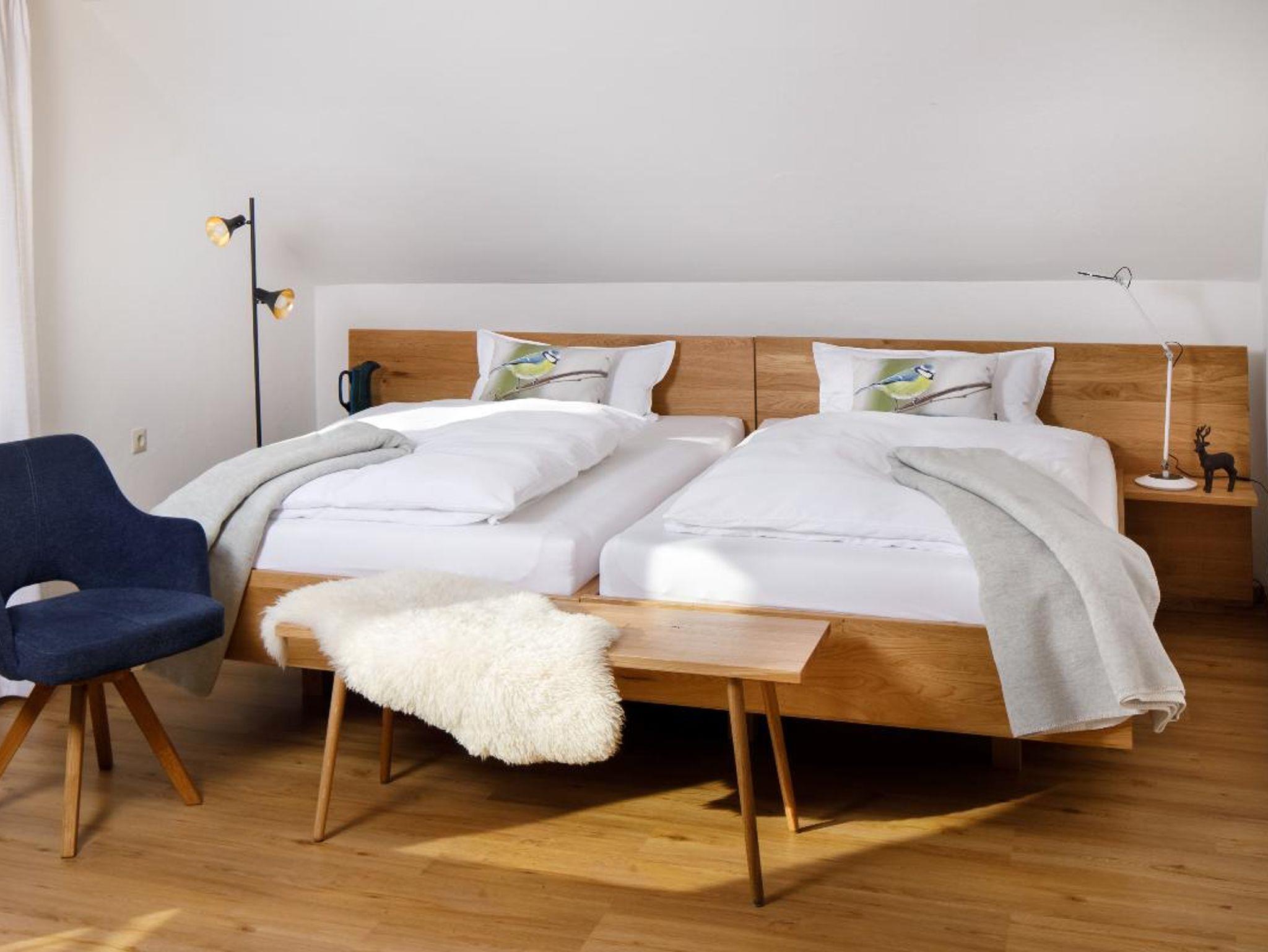 • Chalet - Schlafzimmer mit zwei 120 cm breiten Massiv - Eichenbetten (zum King - Size Bett wandelbar), Tisch, drehbare Relax - Polsterstühle, Flachbild - Fernseher mit Schwenkarm, Radio, WLan