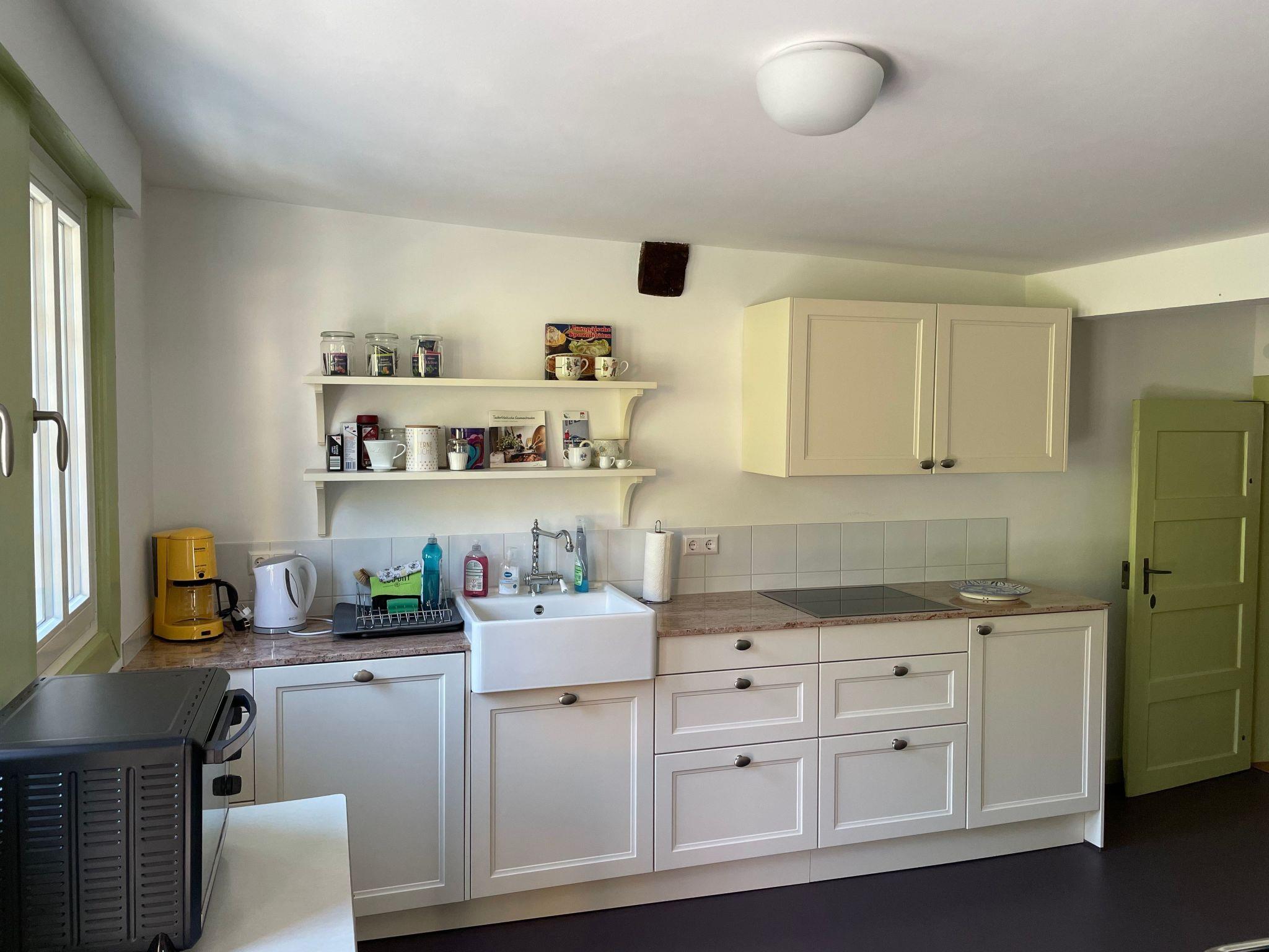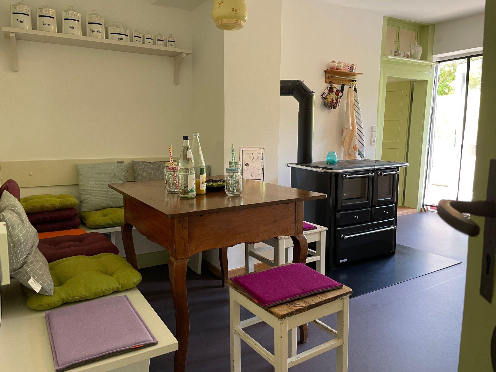 The holiday home with 120 square metres of living space offers space for 6 people, the rooms are on 2 floors. The fully equipped kitchen with dishwasher, fridge, freezer, cooker, oven, kettle, toaster, coffee machine and corner bench with table leaves nothing to be desired. The cosy living and dining room invites you to linger, the rooms are interconnected. From the kitchen there is direct access to the sunny terrace. The holiday home has 3 bedrooms, each with a double bed. Each floor has a bathroom with washbasin, shower and WC. Only the bathrooms in the holiday home are equipped with a radiator. Otherwise, heating is provided by wood-burning stoves in the kitchen and living room.