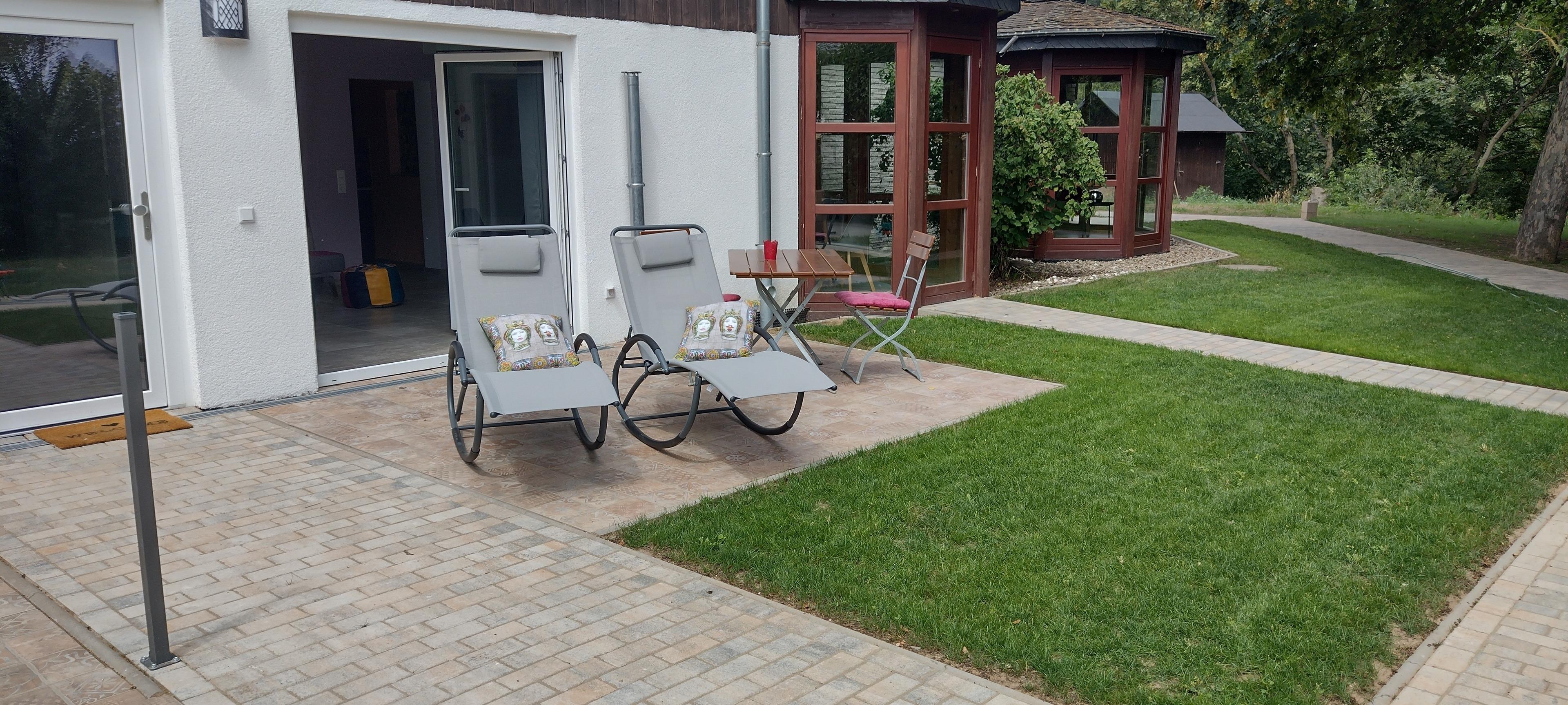Ein eigener Terrassenbereich oder die gemeinsame Sitzgruppe im Garten unter Bäumen mit Blick auf den Rhein wartet auf Sie.
