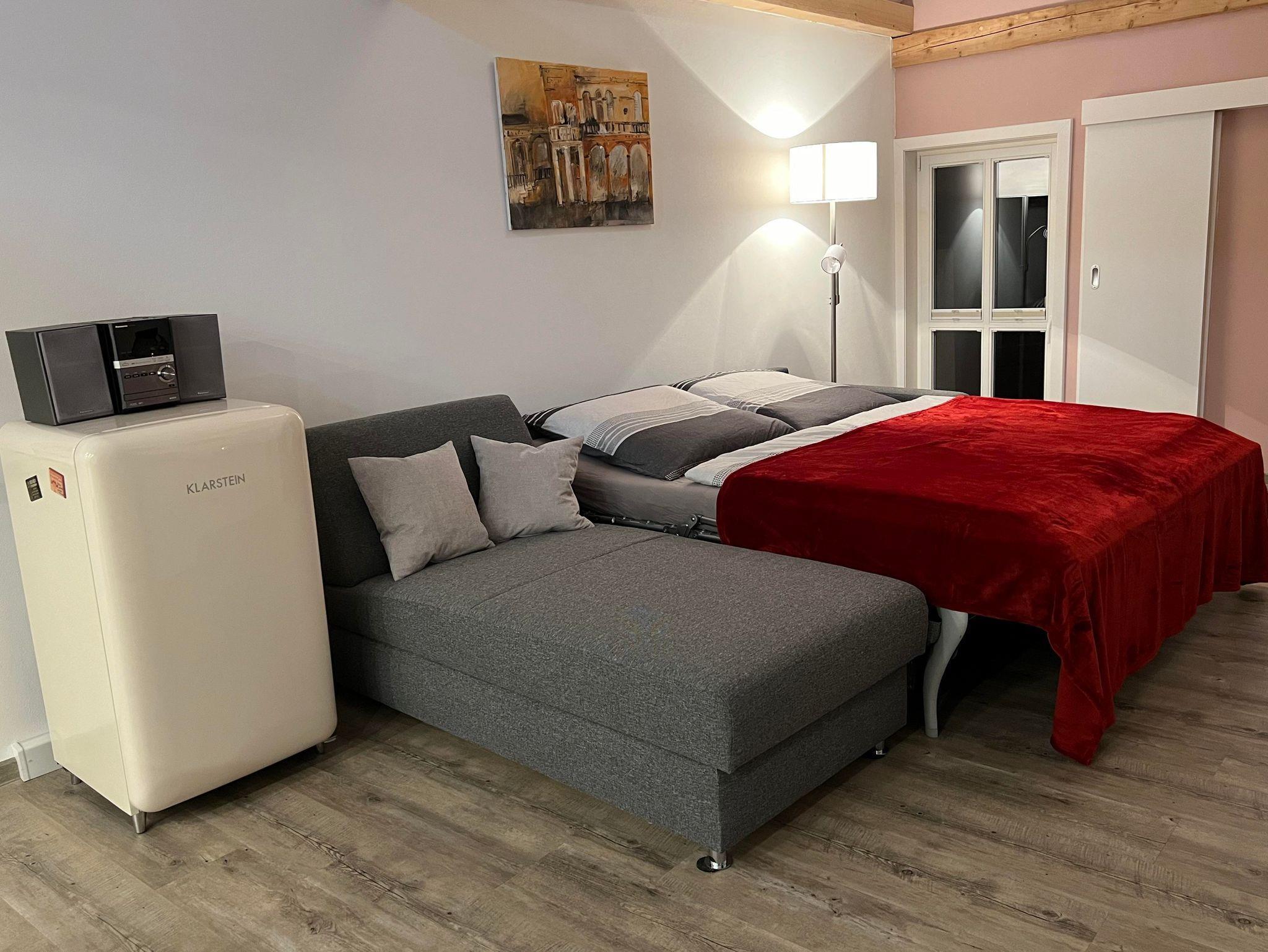 Die Schlafcouch (1,80 x 2m) ist mit einer festen Matratze ausgestattet und sorgt für erholsamen Schlafkomfort während Ihres Aufenthalts.