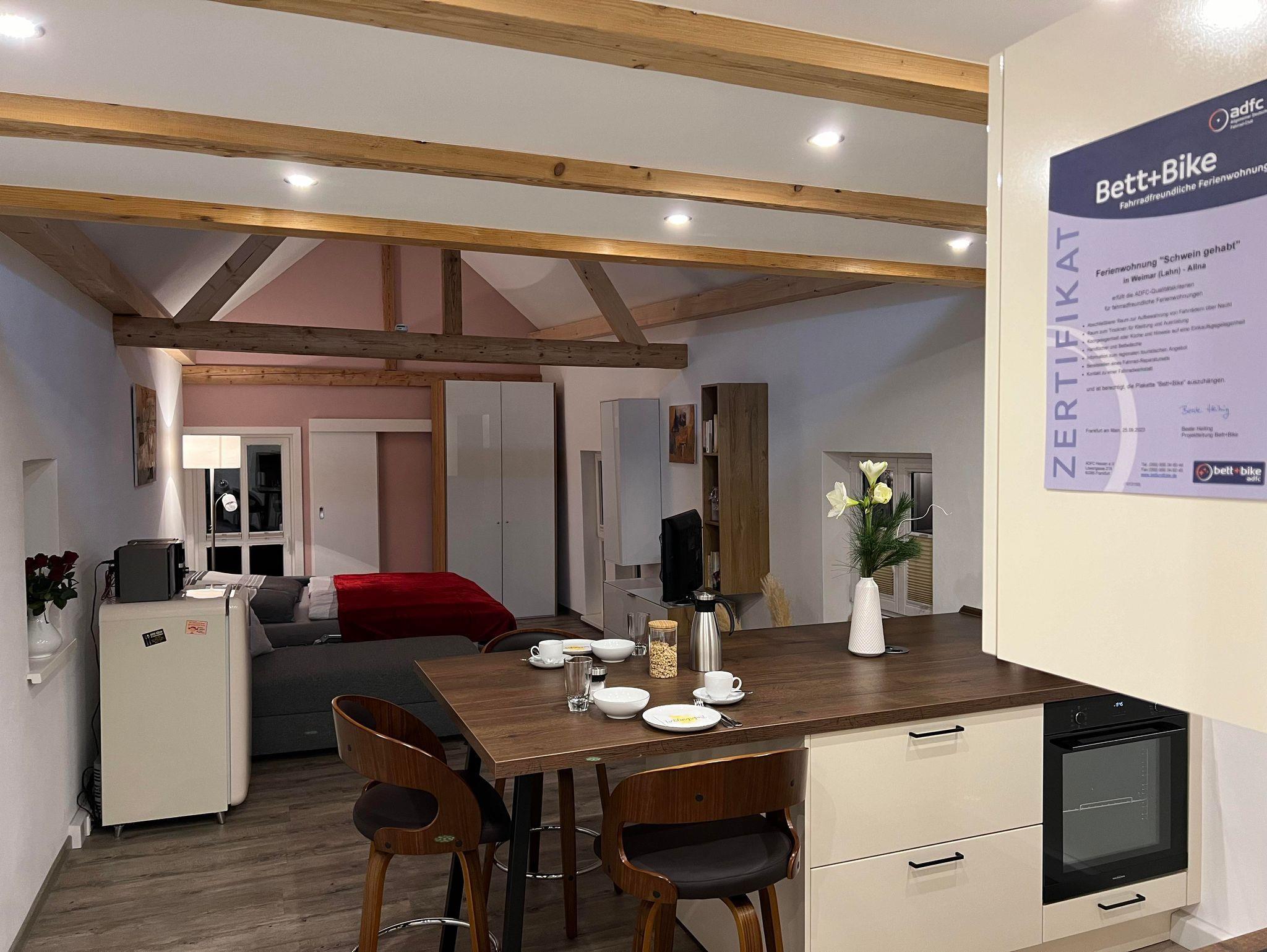 Willkommen in der Ferienwohnung 'Schwein gehabt' – Ihre perfekte Auszeit mit einem Hauch von Landwirtschaft! Dieses liebevoll kernsanierte Stallungsgebäude, umgebaut in ein wunderbares Apartment, bietet Ihnen ein komfortables 1-Zimmer-Apartment mit eigenem Bad sowie einem separaten Waschraum zur Mitbenutzung.