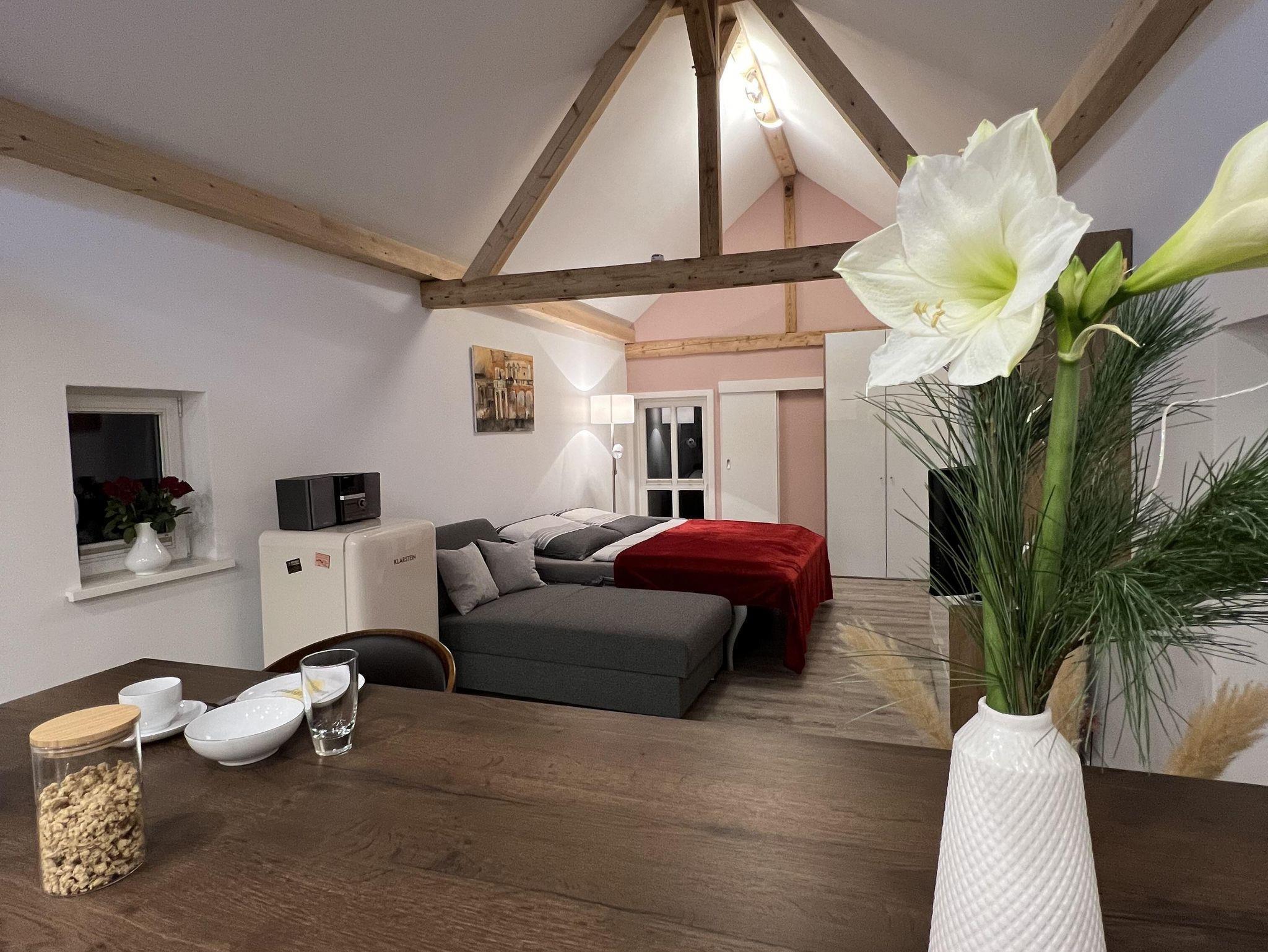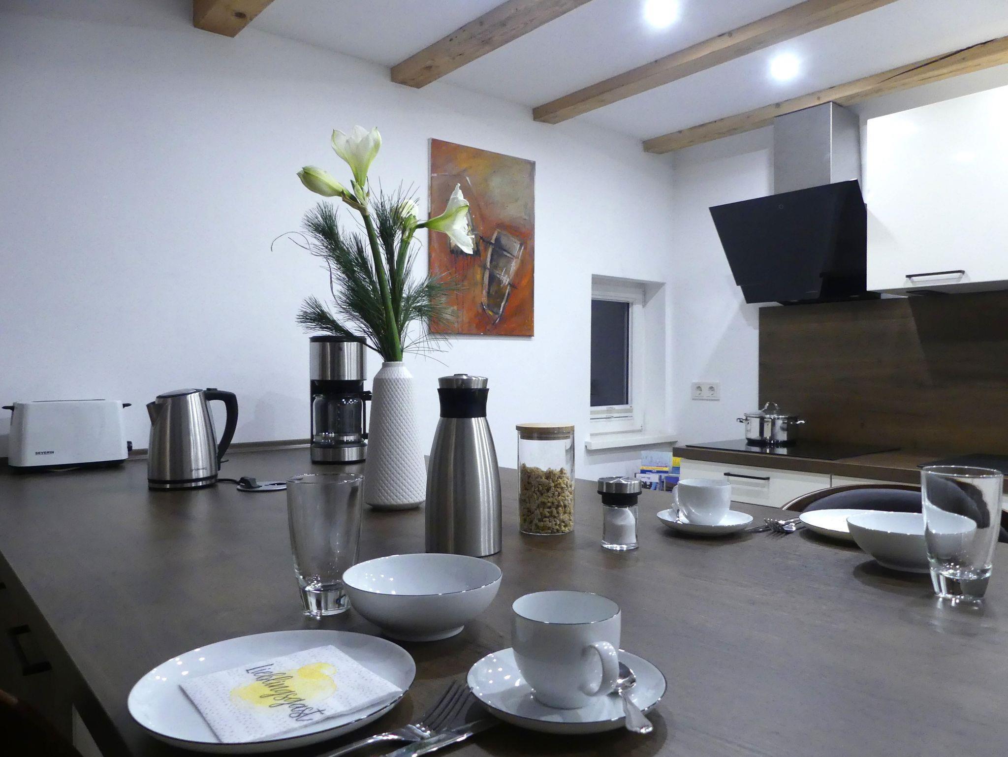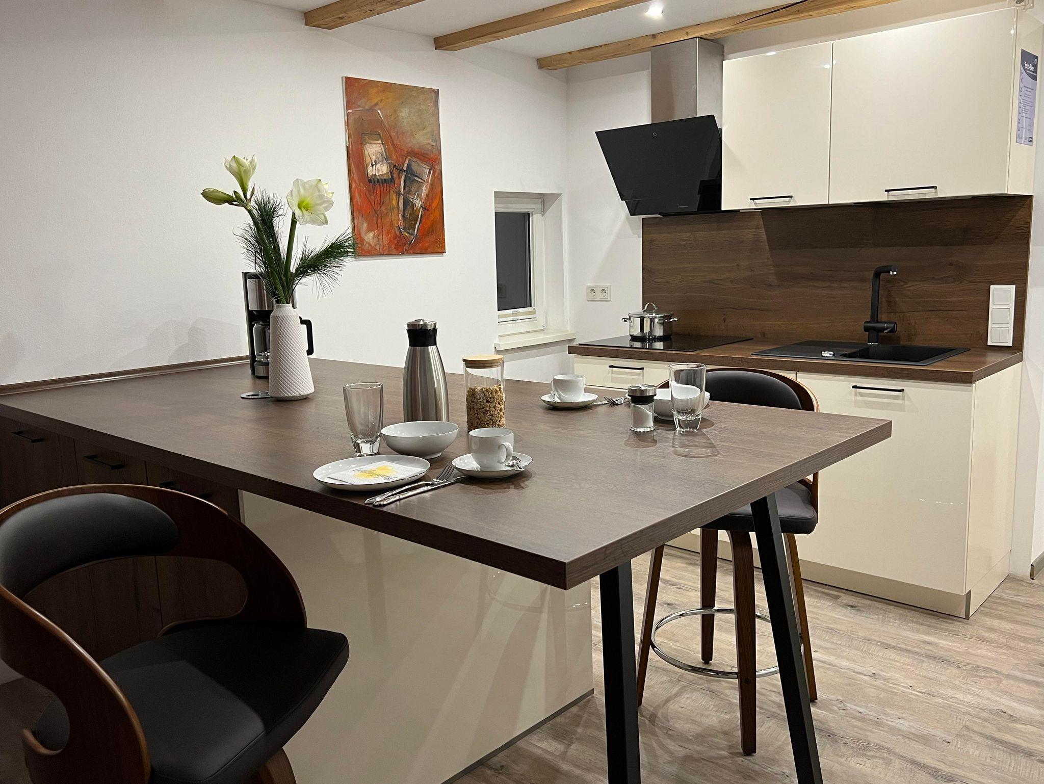 Willkommen in unserer 45 m² großen Wohnung im 1. Stock des ehemaligen Stallungsgebäudes! Hier genießen Sie den Komfort einer voll ausgestatteten Küche, inklusive Backofen, Spülmaschine, Kaffeemaschine, Toaster und Wasserkocher.