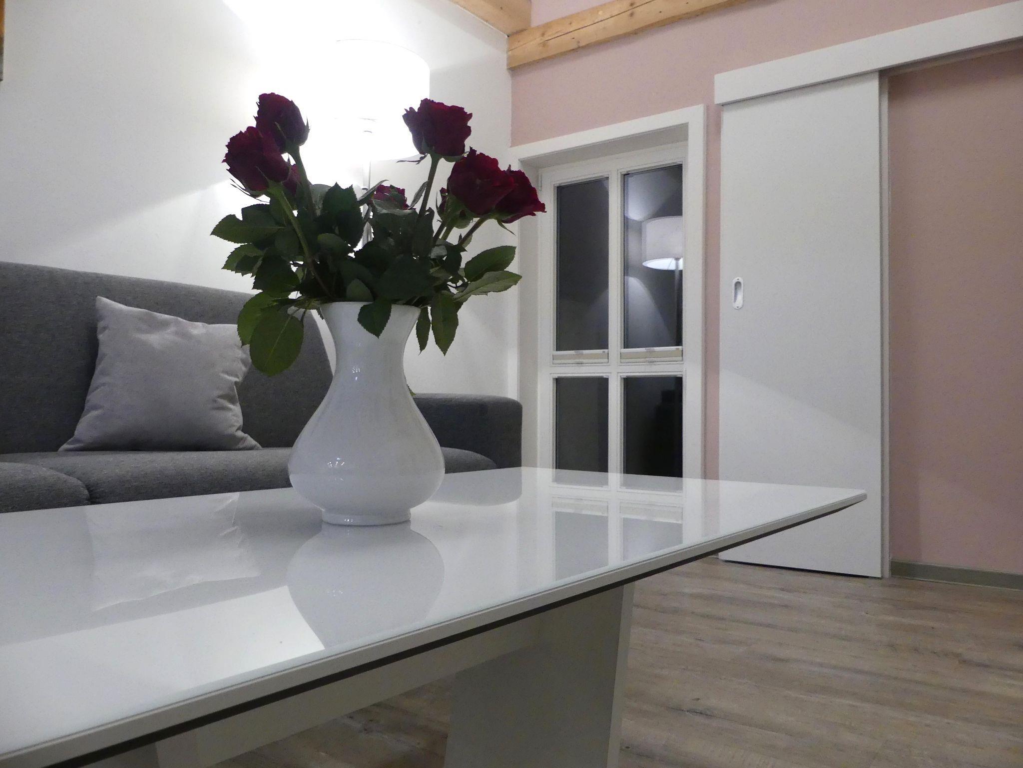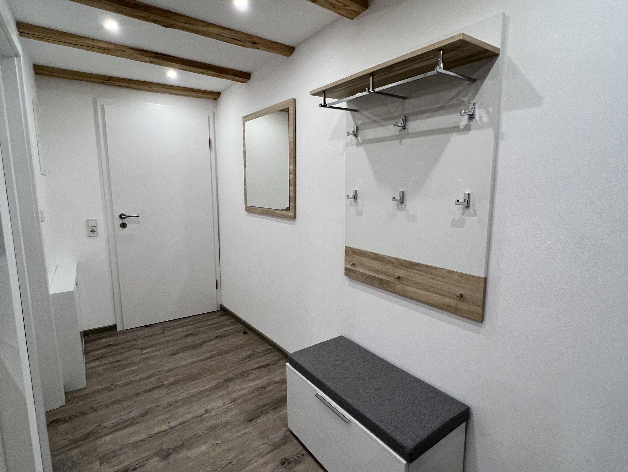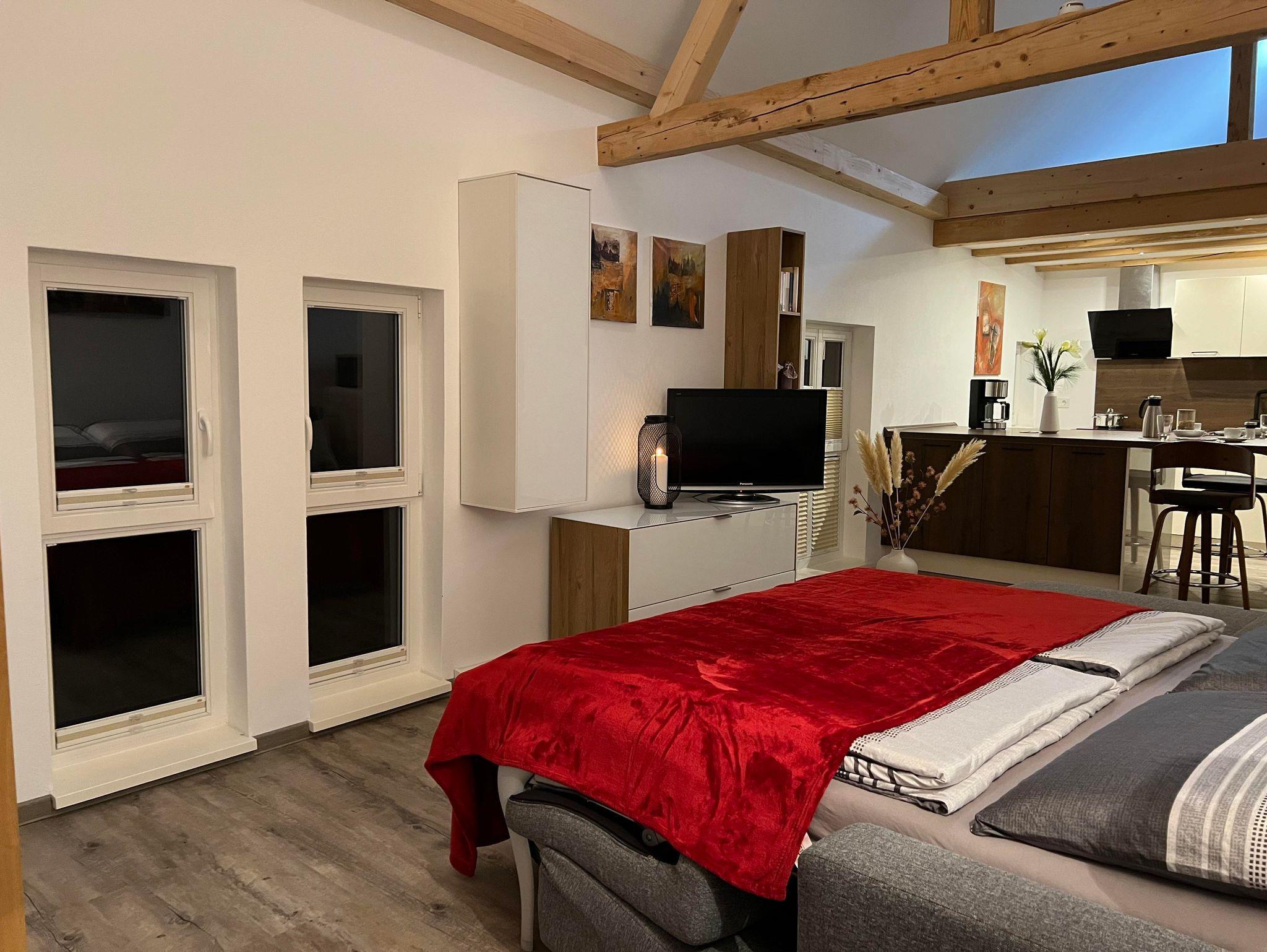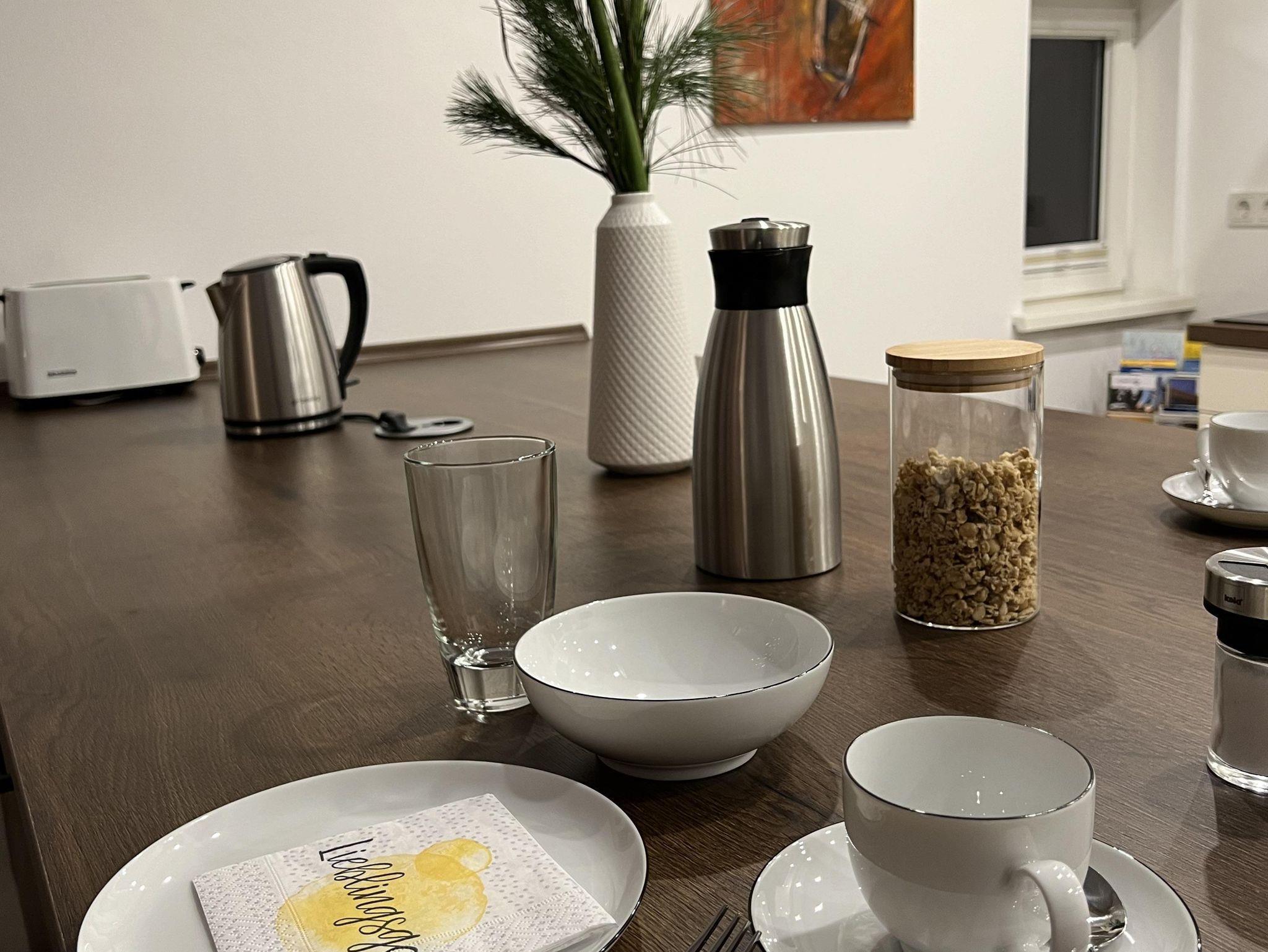 Willkommen in unserer 45 m² großen Wohnung im 1. Stock des ehemaligen Stallungsgebäudes! Hier genießen Sie den Komfort einer voll ausgestatteten Küche, inklusive Backofen, Spülmaschine, Kaffeemaschine, Toaster und Wasserkocher.