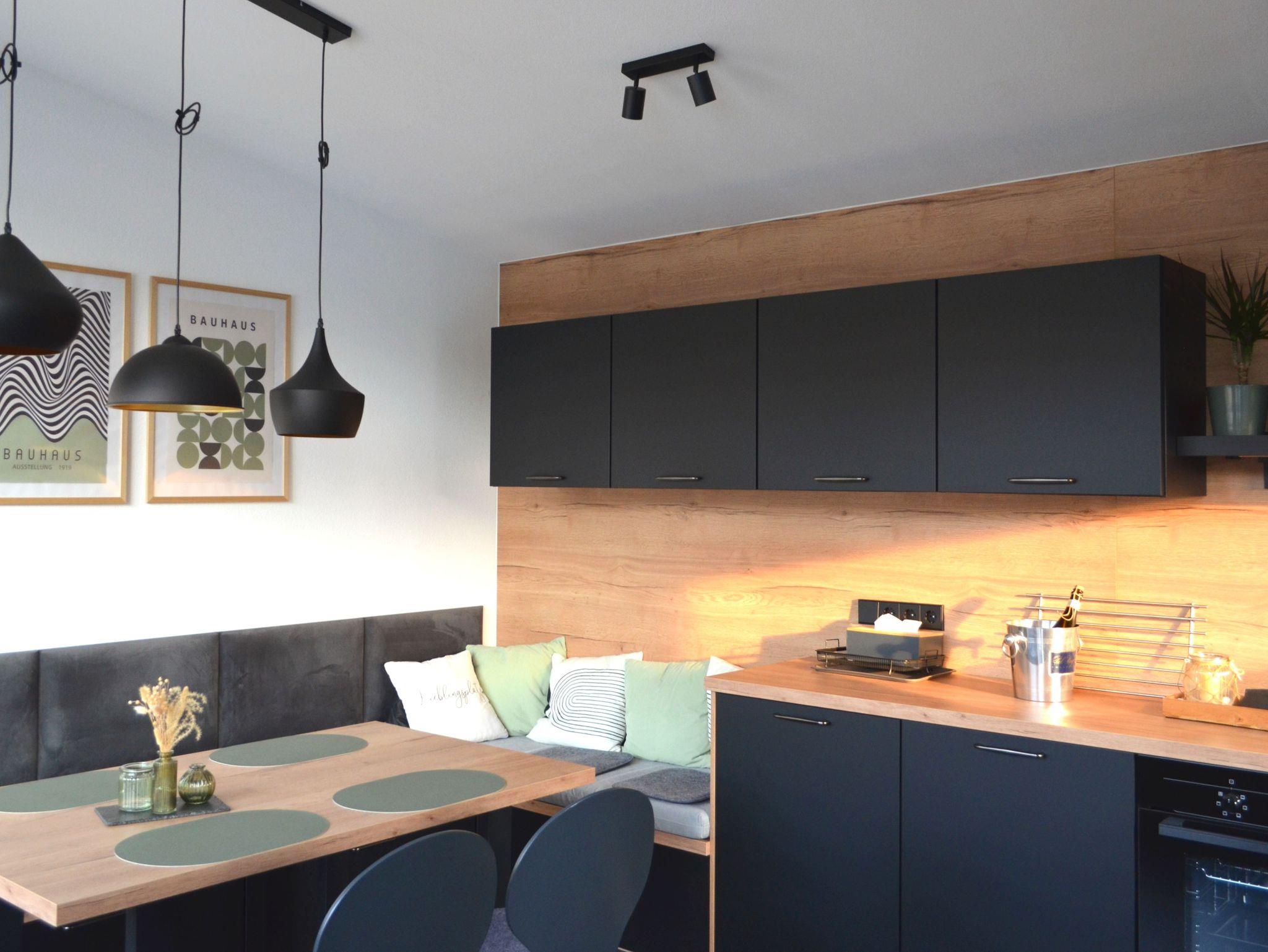 Im 3. Obergeschoss liegt das Herzstück des Turms: eine voll ausgestattete Designerküche mit Bora-Kochfeld, Backofen, Mikrowelle, Spülmaschine, Kühlschrank, Kapsel- & Filterkaffeemaschine, Toaster, Wasserkocher, Eierkocher und Heißluftfritteuse. Der Essplatz mit LAN-Anschluss und das Liegefenster mit Aussicht machen diesen Raum zum Wohlfühlort. Ein großer Smart-TV ergänzt den Wohnkomfort.