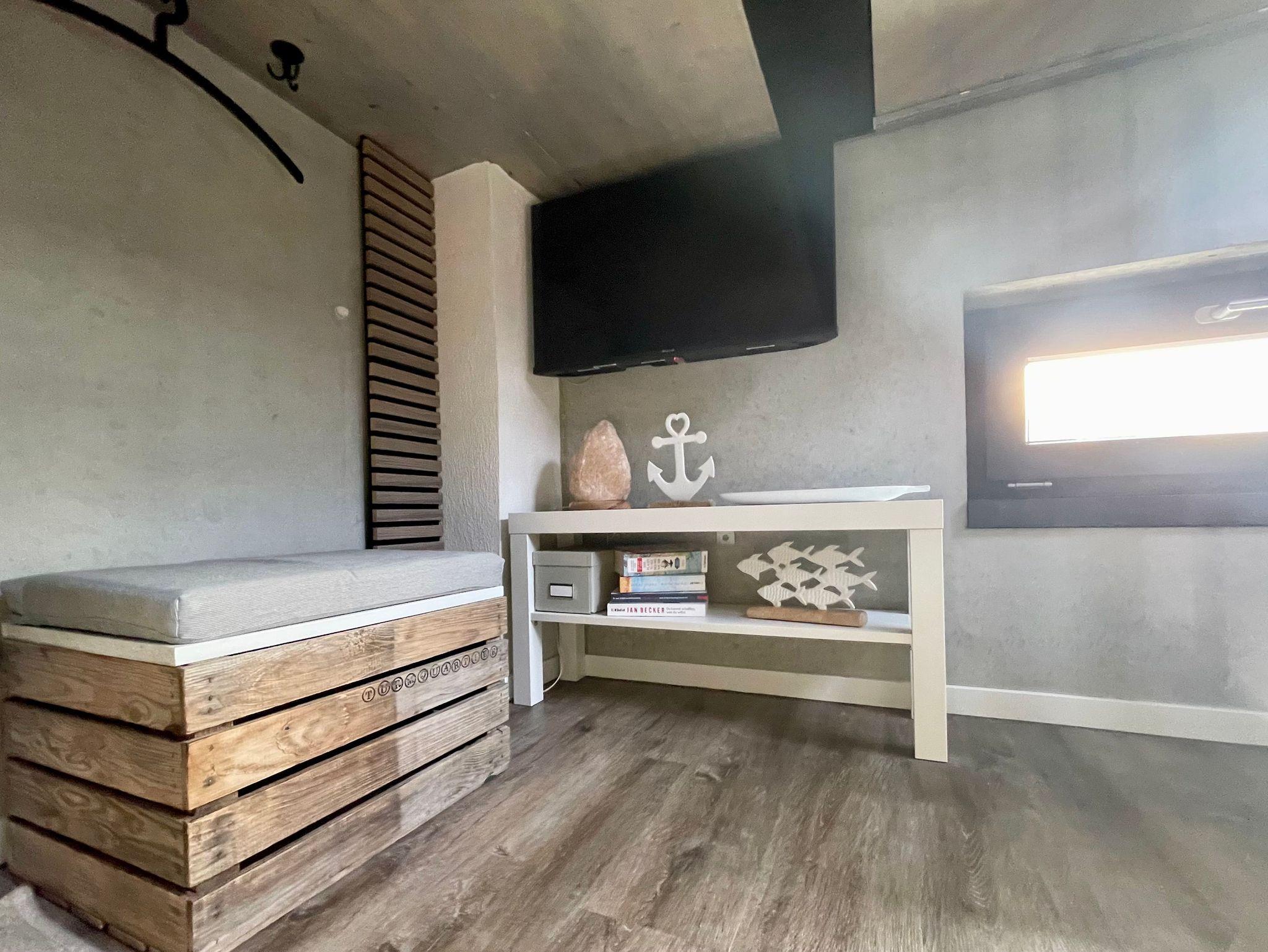 Das 2. Obergeschoss beherbergt die gemütliche Schlafempore mit Queen-Size-Bett, Bettwäsche, Kissen, Smart-TV, Nachtlicht, Verdunkelungsvorhängen und Steckdosen am Kopfende ein Ort zum Entspannen auf 125cm Deckenhöhe.