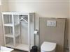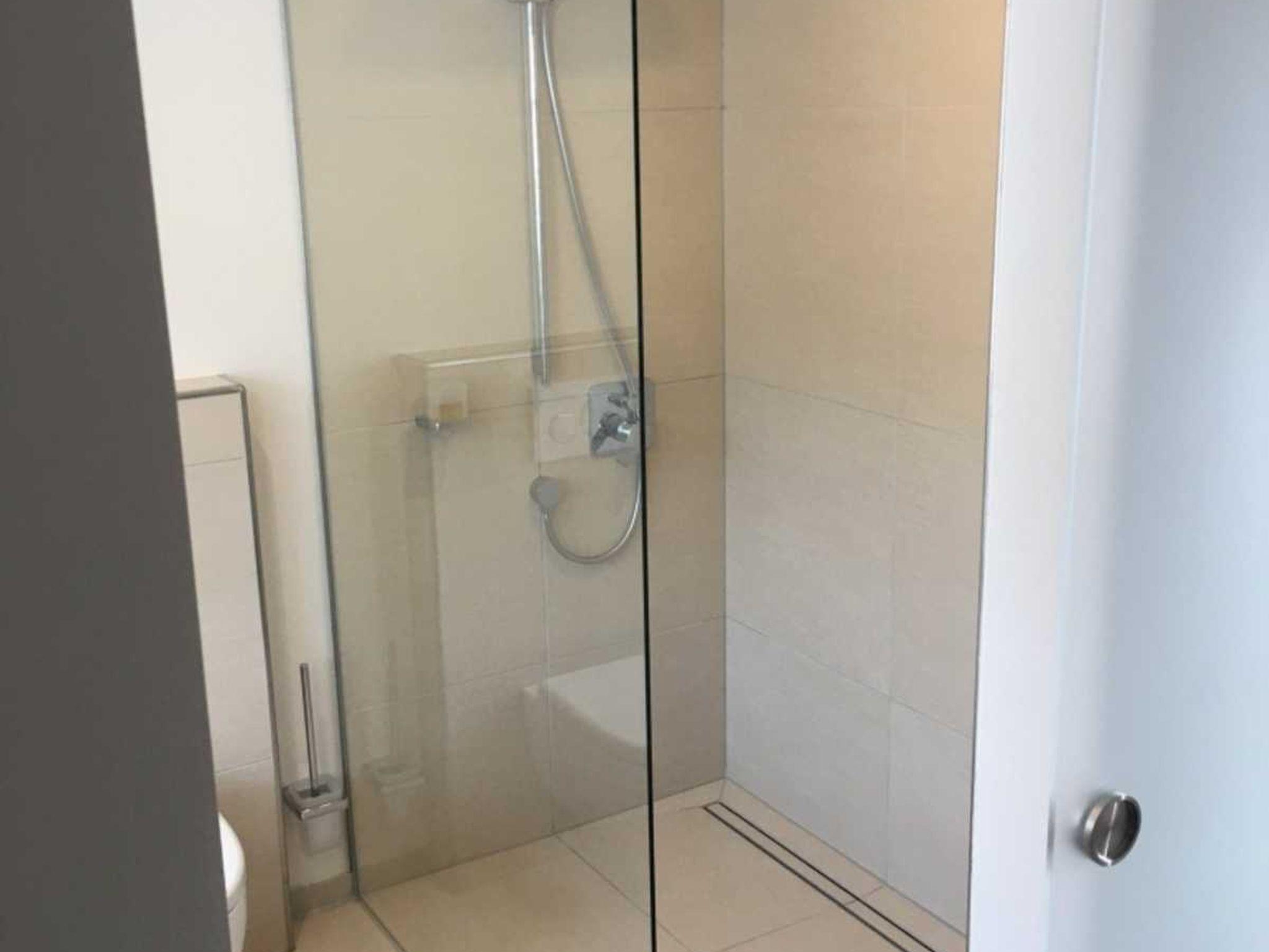 • modernes Duschbad mit hochwertigem Kosmetikspiegel, Handtüchern und Fön