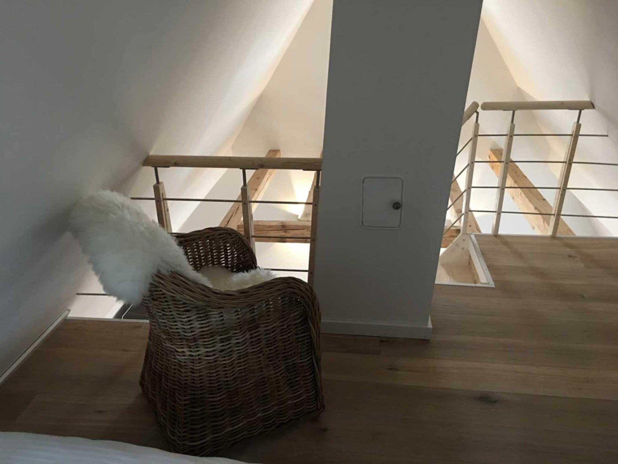 Das Appartement B ist im Obergeschoss gelegen. Die ca. 45 qm Wohnfläche verteilen sich in den Wohn-, Ess- und Kochbereich, Duschbad sowie eine Schlafgalerie. Es ist ausgelegt für 2 bis 4 Personen. Zur Übernachtung der dritten oder vierten Person steht ein hochwertiges Schlafsofa zur Verfügung. Weitere Ausstattung: