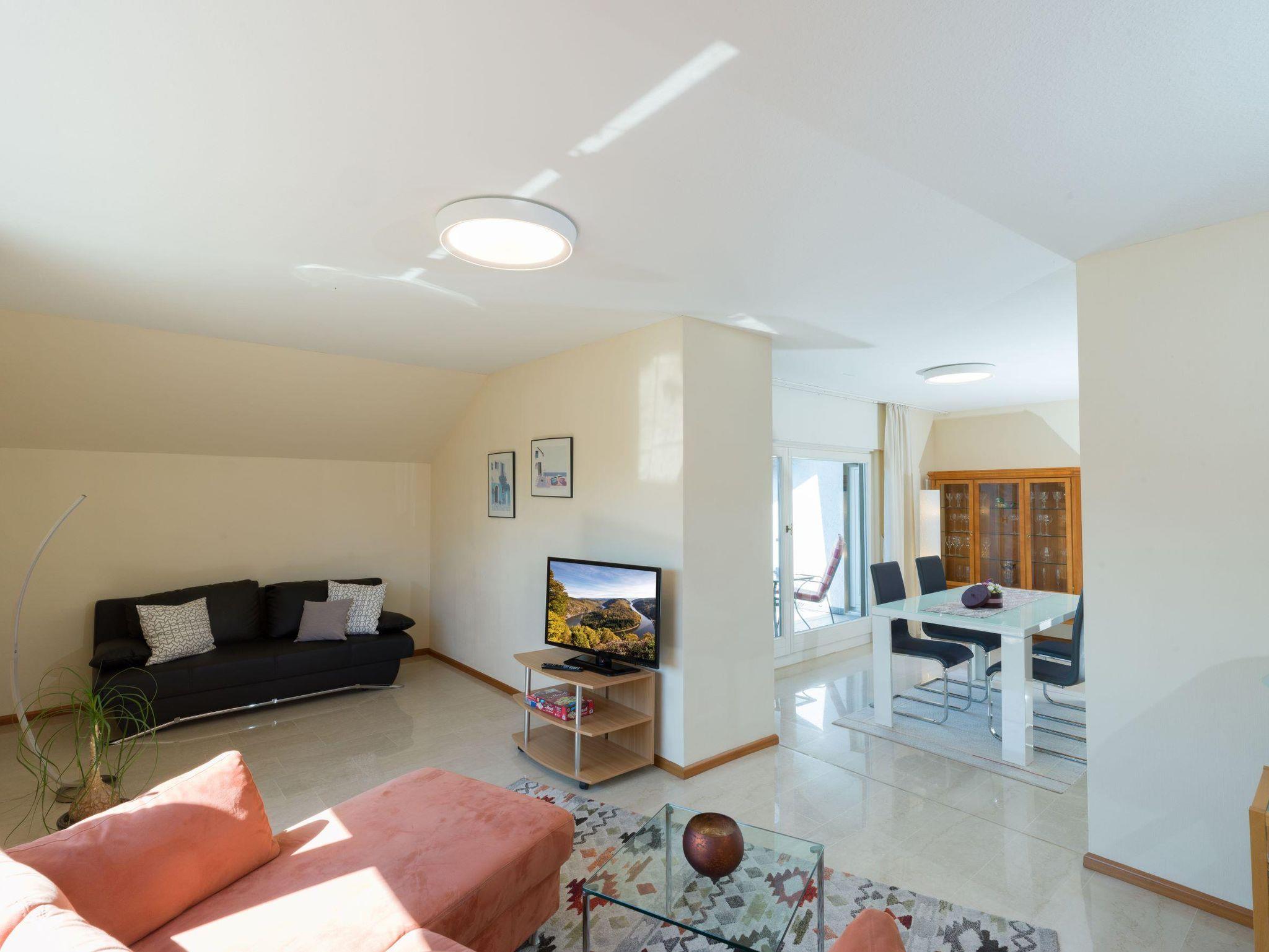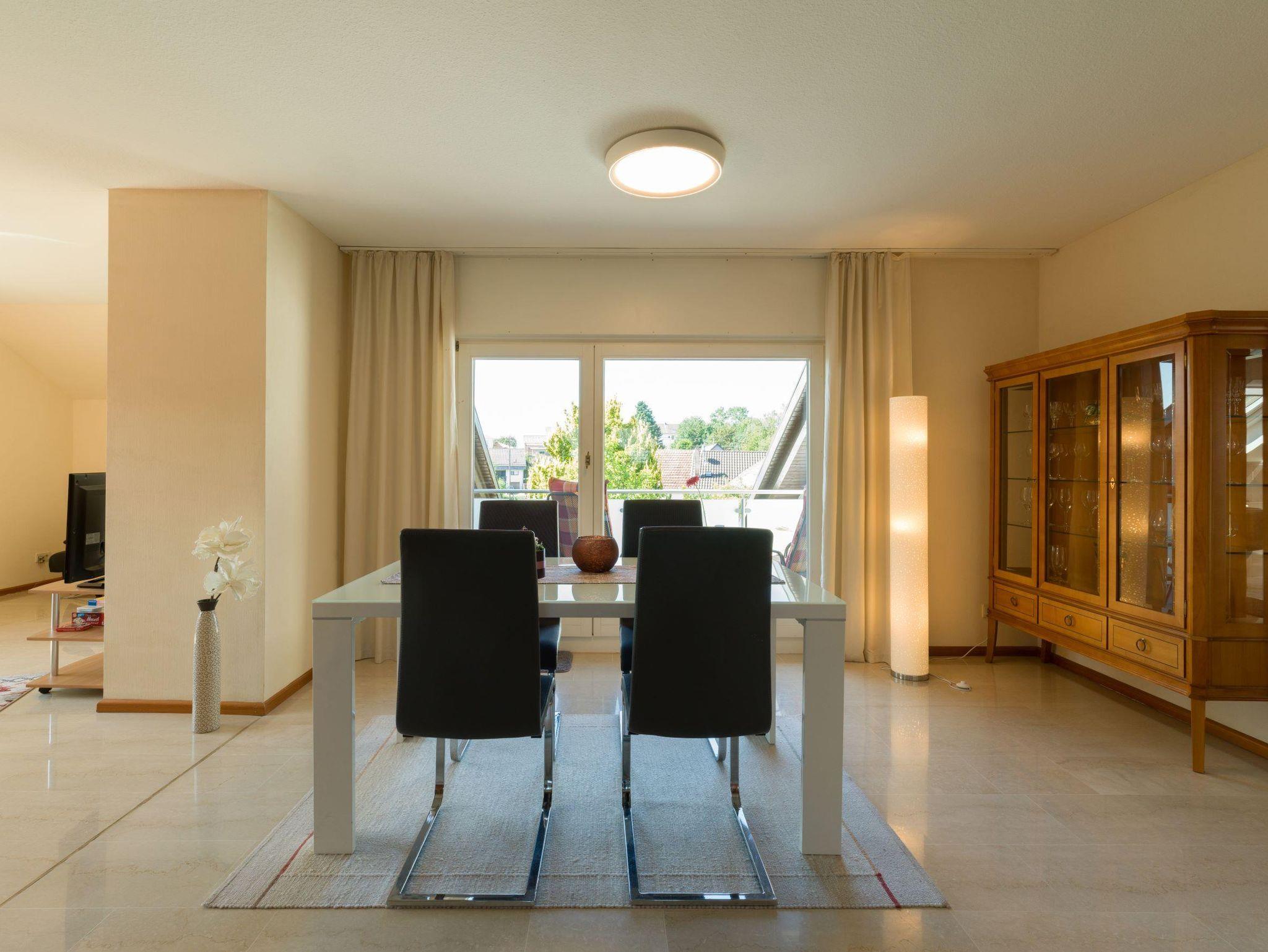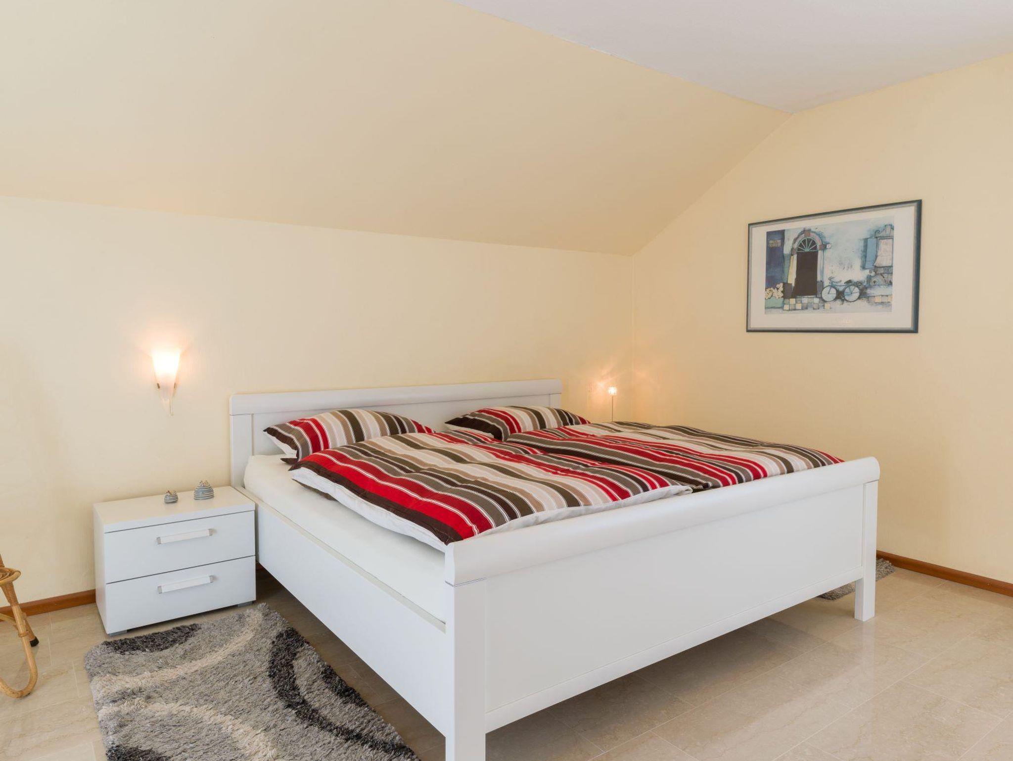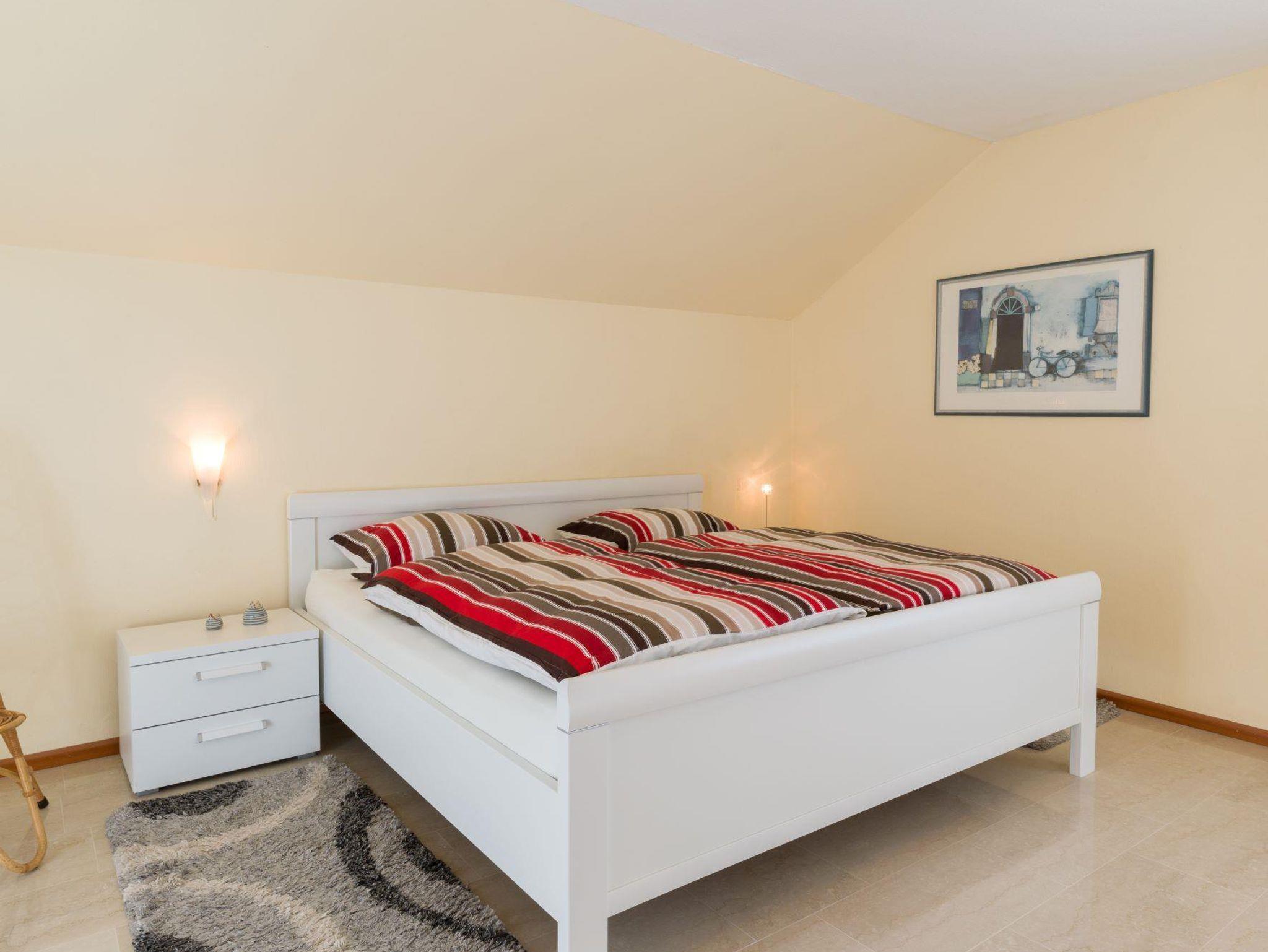 Großzügige, sonnendurchflutete DTV klassifizierte 4 Sterne Ferienwohnung auf 80 qm mit offener Küche-Ess-/Wohnbereich (TV, WLAN) und Dachterrasse bietet Ihnen das perfekte Urlaubsambiente. Ein neu möbliertes Schlafzimmer mit Doppelbett 2,00 x 2,00 m und eine Schlafcouch 1,40 m x 2,00 m (auf der eine dritte Person für 20€ pro Person/Nacht übernachten kann) garantieren erholsamen Schlaf. Neben einem Bad mit Dusche, Badewanne, Bidet und WC bietet die Ferienwohnung ein zusätzliches Gäste-WC. In der Wohnung befindet sich ein Abstellraum sowie eine großzügige Dachterrasse mit Gartenmöbeln. Die Dachterrasse ist zugänglich vom Schlaf- und Esszimmer.