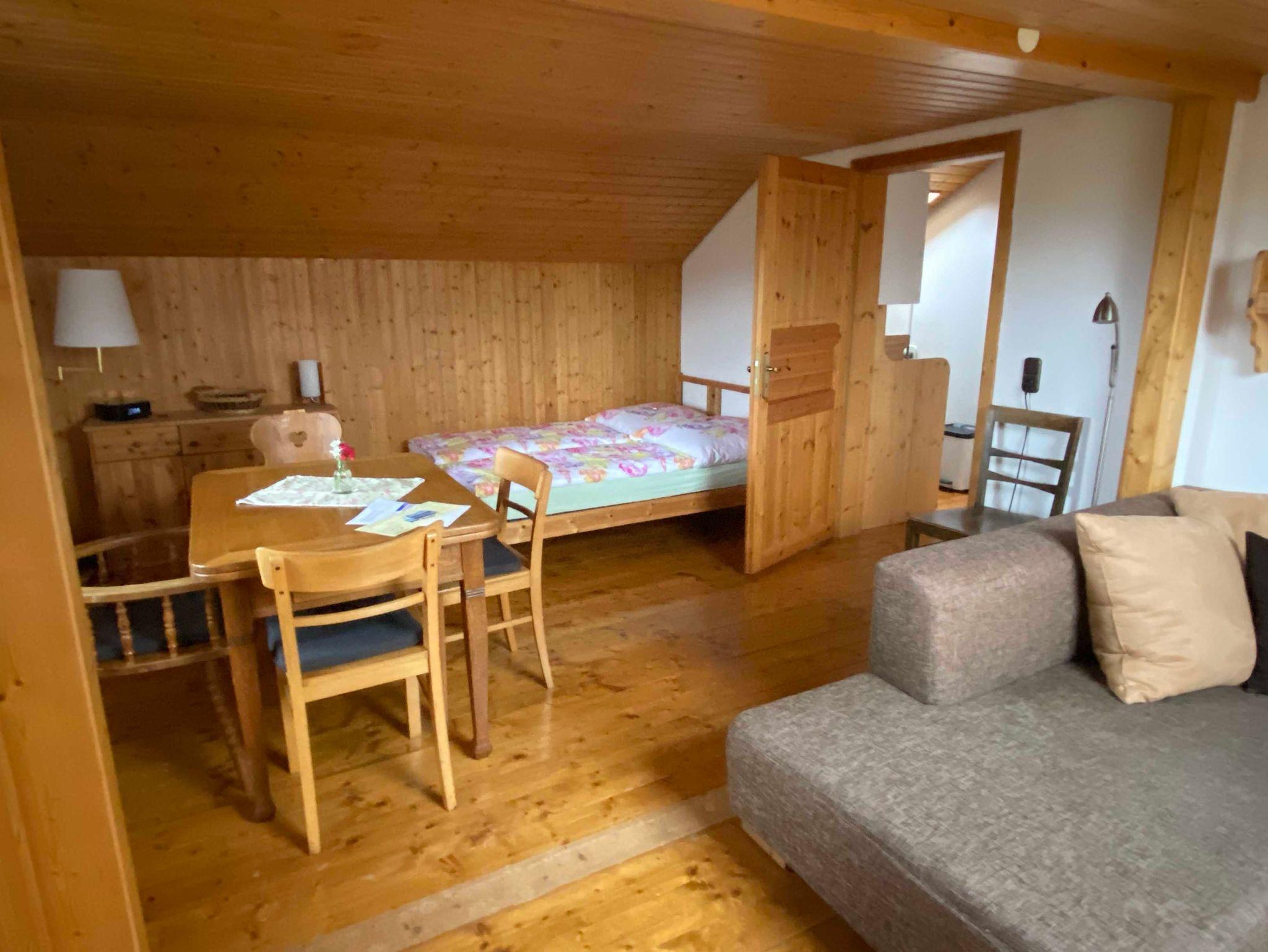 Ferienwohnung im Dachgeschoss, bestehend aus einem kombinierten Wohn-/Schlafraum mit einem 140x200 cm Schlafsofa und einem 140x200 cm Doppelbett. Weiter sind im Zimmer ein Tisch für 4-6 Personen, ein Sessel, ein Wandschrank und ein Flachbildfernseher mit Sat-TV.