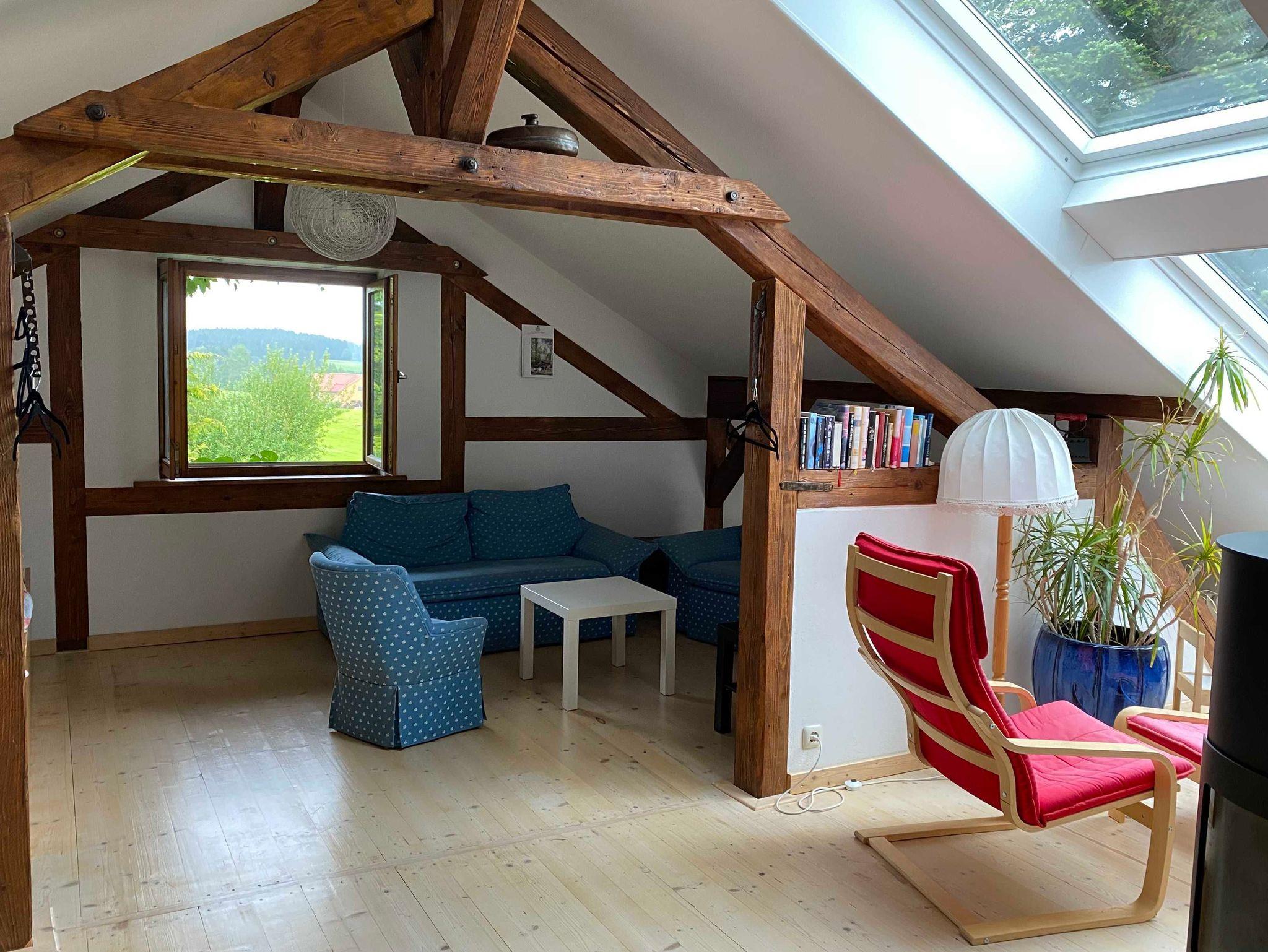 Dachgeschoss FeWo, 2017 Fertigstellung, ein großer Raum mit freiliegenden Balken, großen Dachfenstern und einem romantischen Kaminofen. Durch elektronische Rollos und guter Isolation auch im Hochsommer nicht zu heiß.