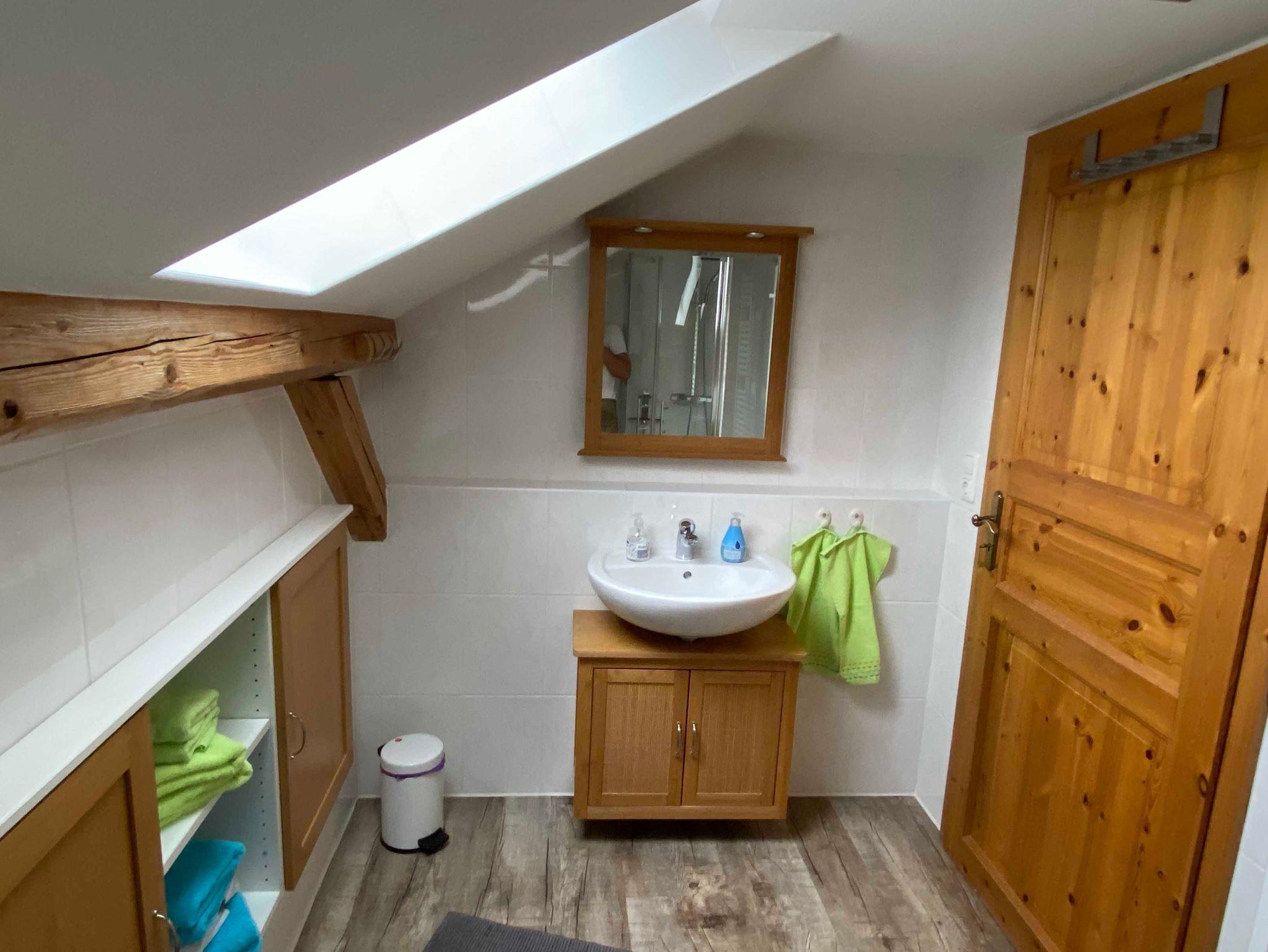 Das Bad ist mit einer ebenerdigen Dusche, einem großen Wandschrank, einem Waschtisch und natürlich einem WC ausgestattet.