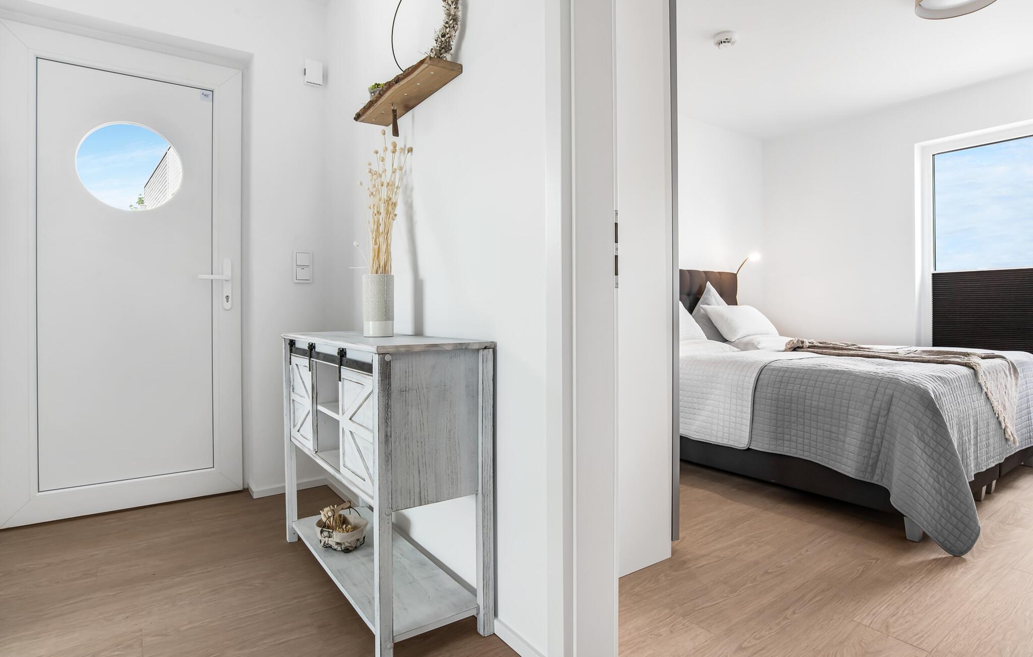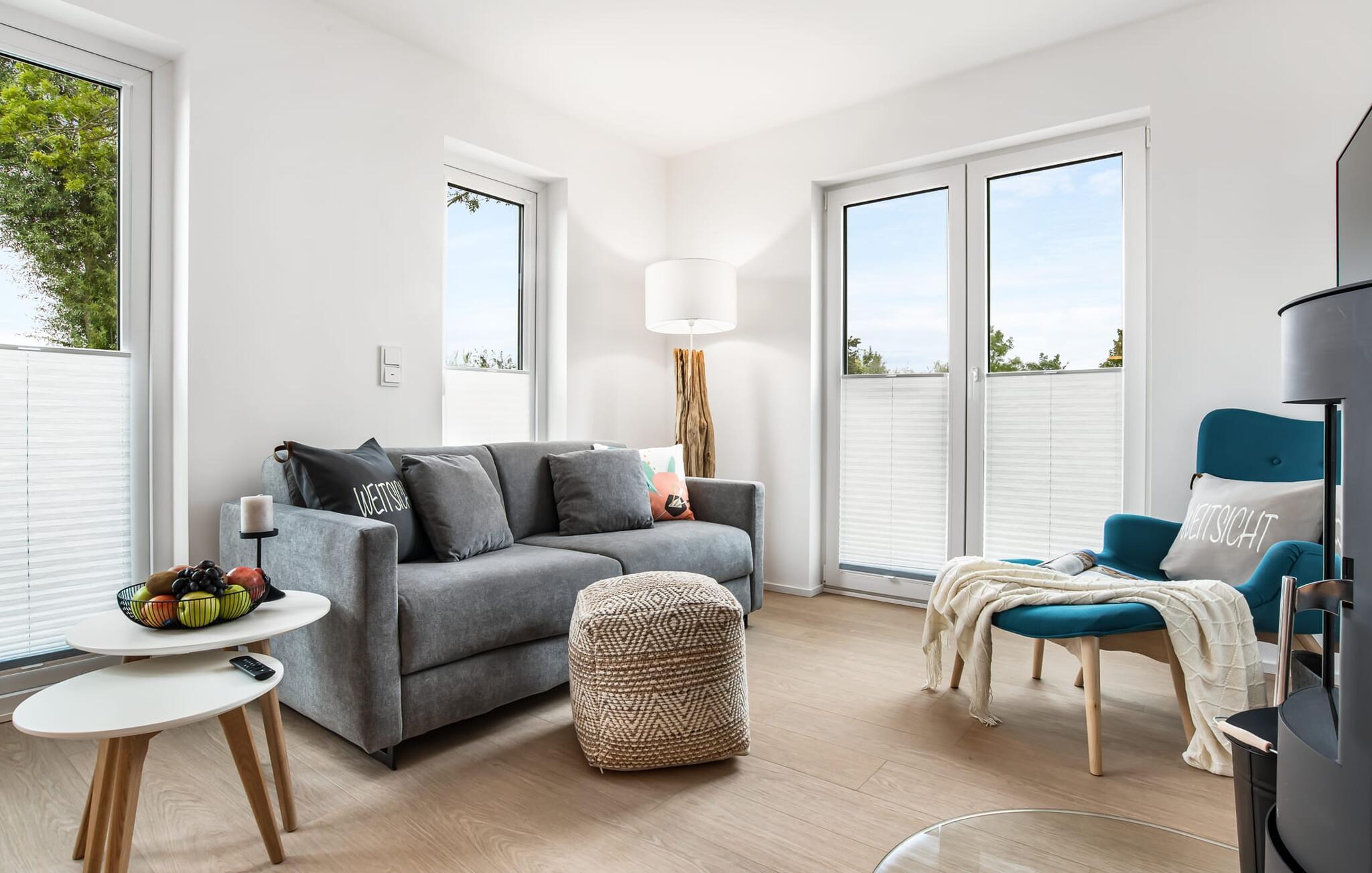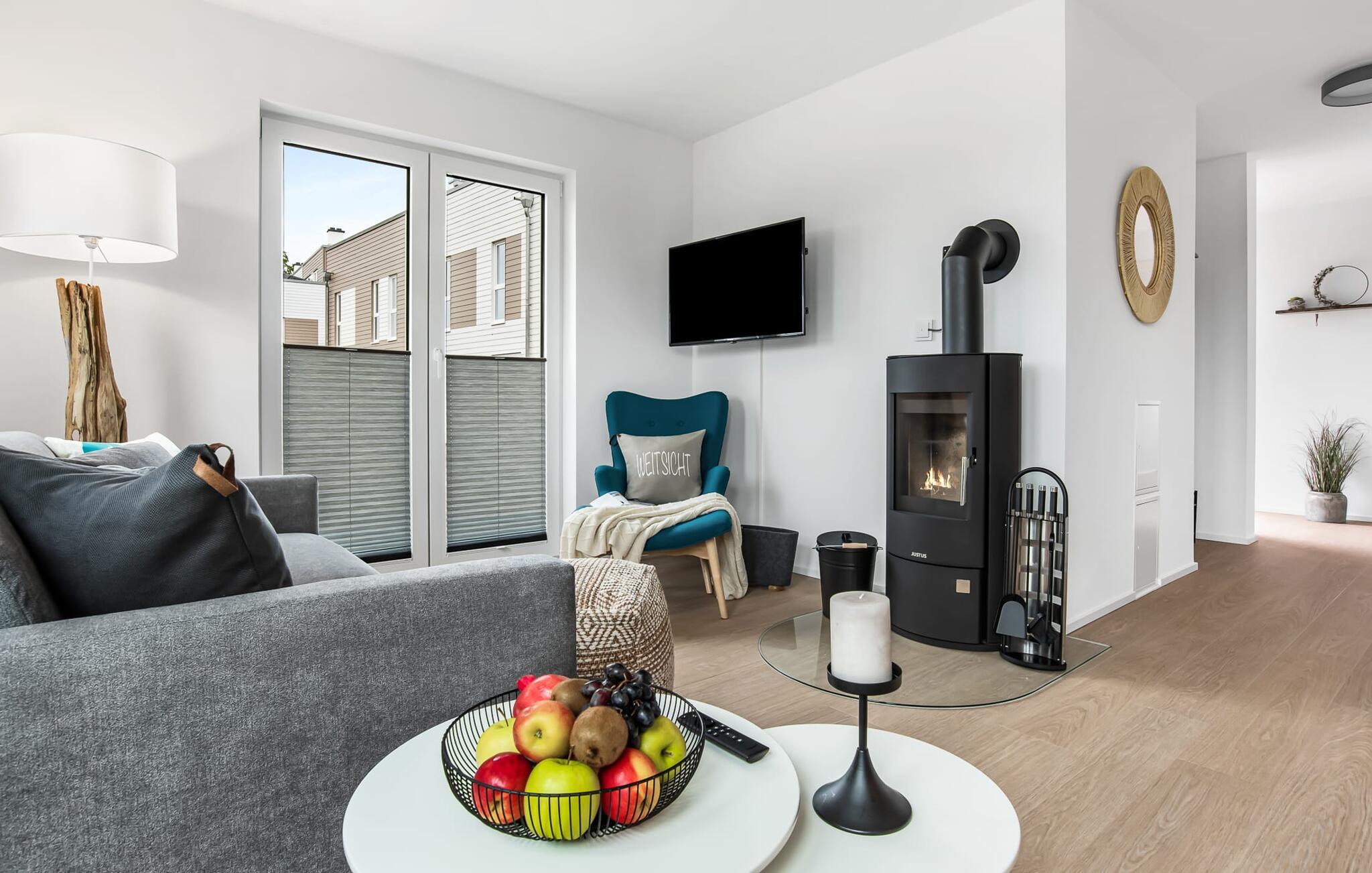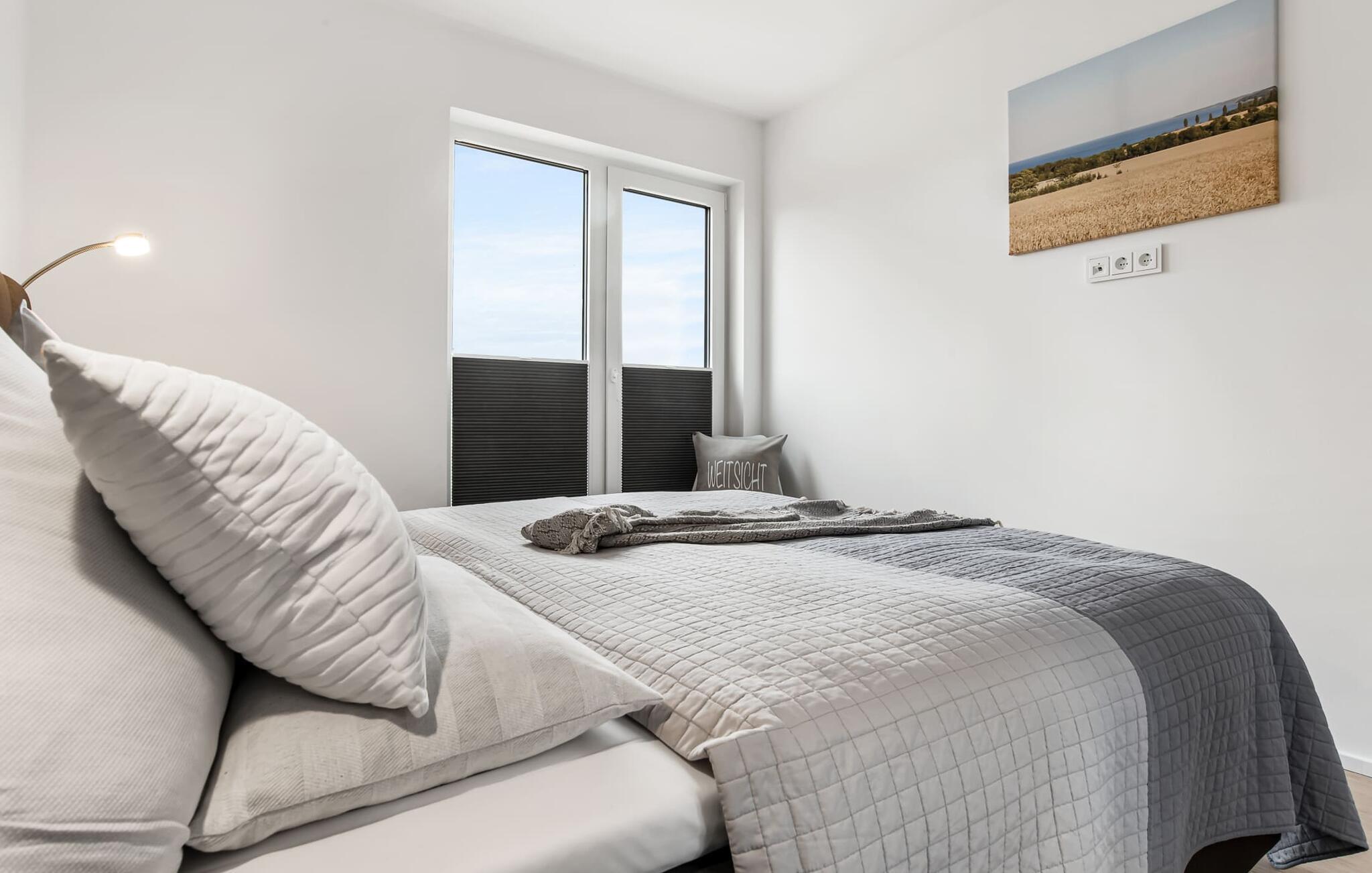 WEITSICHT er en maritim og delvist bæredygtigt indrettet ferielejlighed i stueetagen, der lever op til sit navn: Den imponerer med sin fantastiske beliggenhed med direkte udsigt over Østersøen og de naturbevarende strandenge og marker. Fra terrassen kan I nyde roen og fremsynet i fulde drag. Den naturlige sandstrand Weidefelder med kiosk, restaurant, strandstole og forskellige muligheder for vandsport kan nås på få hundrede meter. Firbenede venner kan også slippe dampen ud på hundestranden bagerst. I umiddelbar nærhed er der også den fantasifuldt designede Adventure Golf minigolfbane og lystbådehavnen i OstseeResort Olpenitz med forskellige indkøbsmuligheder. Resortets beliggenhed direkte mellem mundingen af Slime og Østersøen og tæt på den smukke by Kappeln byder også på en bred vifte af udflugtsmuligheder med båd, cykel eller til fods. Hjertet i lejligheden, som er lavet med højkvalitets og økologisk bæredygtige materialer, er den åbne, lysfyldte stue/spisestue. Vinduesfronten fra gulv til loft giver en unik udsigt over naturen. Det integrerede køkken er perfekt udstyret. Det gør det sjovt at lave mad sammen. Skulle vejret nogensinde blive nordisk, inviterer opholdsområdet til afslapning. Pejsen skaber hygge med sin knitrende ild. Direkte fra opholdsstuen kommer man ind på den rummelige terrasse med syd-vest orientering. Dette tilbyder afslappende timer væk fra stress og jag i resten af feriestedet ved Østersøen. Mod bagsiden med udsigt til de naturbeskyttede strandenge, marker og havet kan I nyde FREMSYNET. Møblerne af høj kvalitet på terrassen inviterer jer til at grille og slappe af. To soveværelser er tilgængelige for en afslappende nat. Den ene er udstyret med en dobbeltseng, den anden med to enkeltsenge. Med nogle få enkle trin kan sofaen i stuen forvandles til en ekstra soveplads. En baby er også velkommen (rejseseng og høj stol til rådighed). Bruserummet med gulvvarme, brusebad på gulvniveau (inklusive regnbruser) og en infrarød sauna sikrer afslappende wellness-øjeblikke. Vaskemaskinen er også placeret der. Hvis I ankommer i bil, kan I ideelt set parkere den direkte foran huset på jeres egen parkeringsplads. Ejerne af WEITSICHT planter et træ for hver reservation i Mara-Serengeti i Kenya (Afrika) gennem det selvstiftede "Sports4Trees"-initiativ. Vores yndlingssted: udsigten fra spisebordet ind i det store naturbevarende strandenge. Bemærk venligst: OstseeResort Olpenitz er meget populært, og der bygges fortsat i parken. Ikke desto mindre kan I se frem til en 5-stjernet standard og et førsteklasses ophold. Byggeaktiviteterne kommer ikke til at forstyrre jer på ferien, og derfor gives der ikke yderligere afslag i prisen.