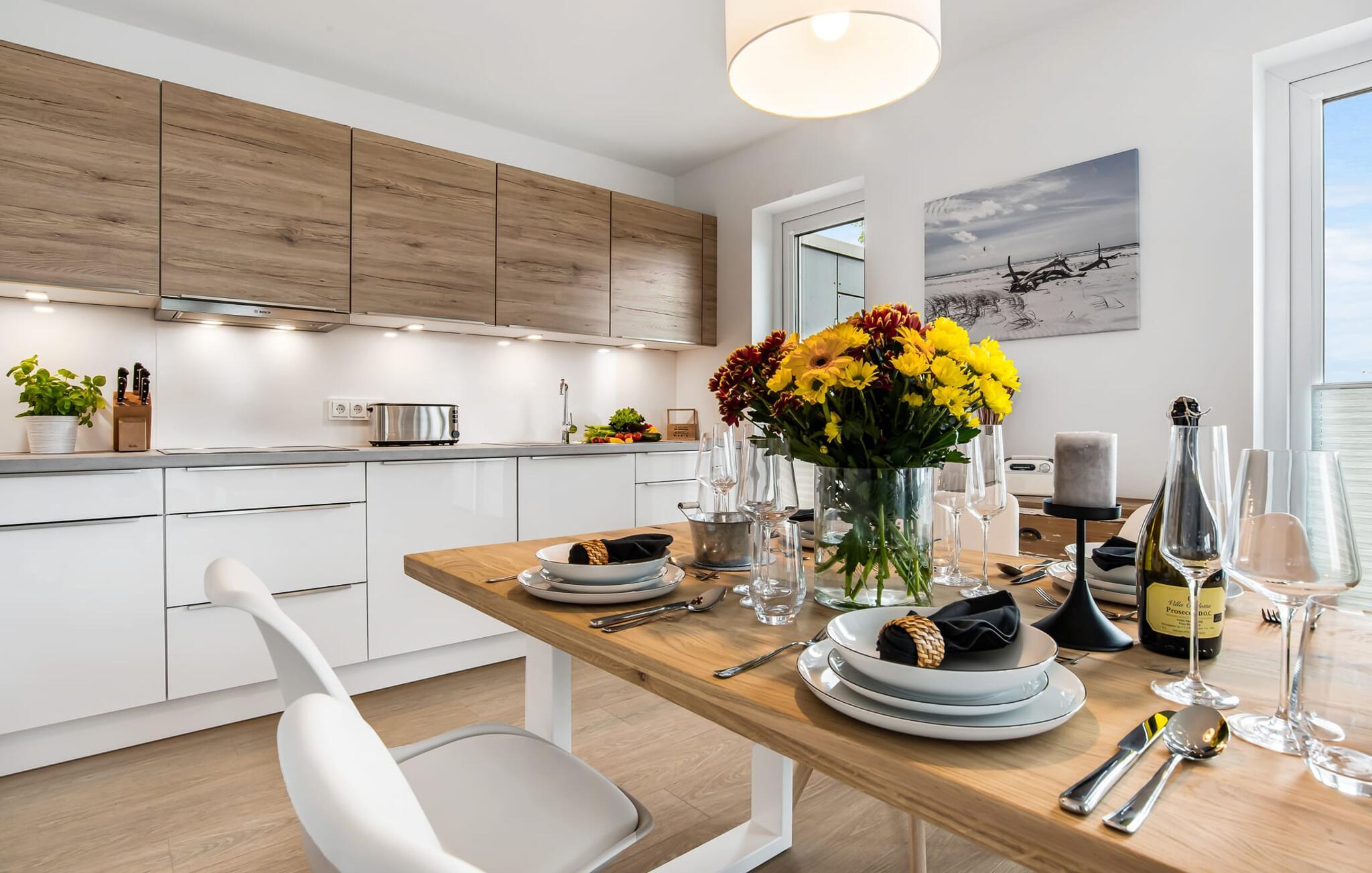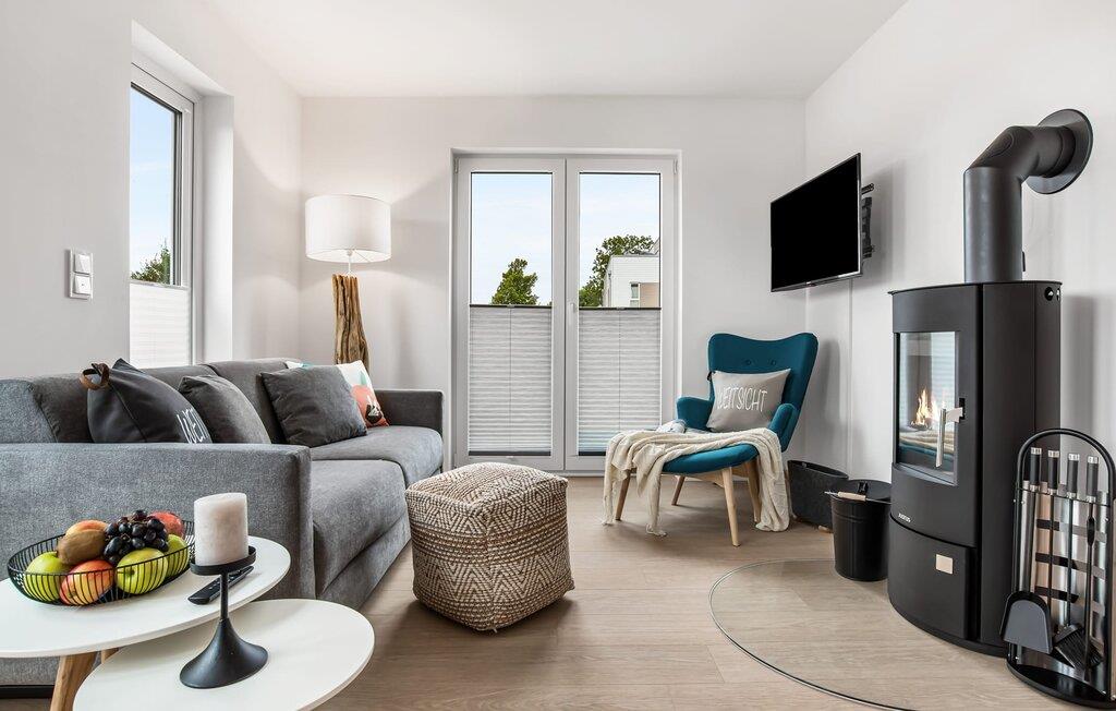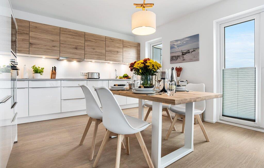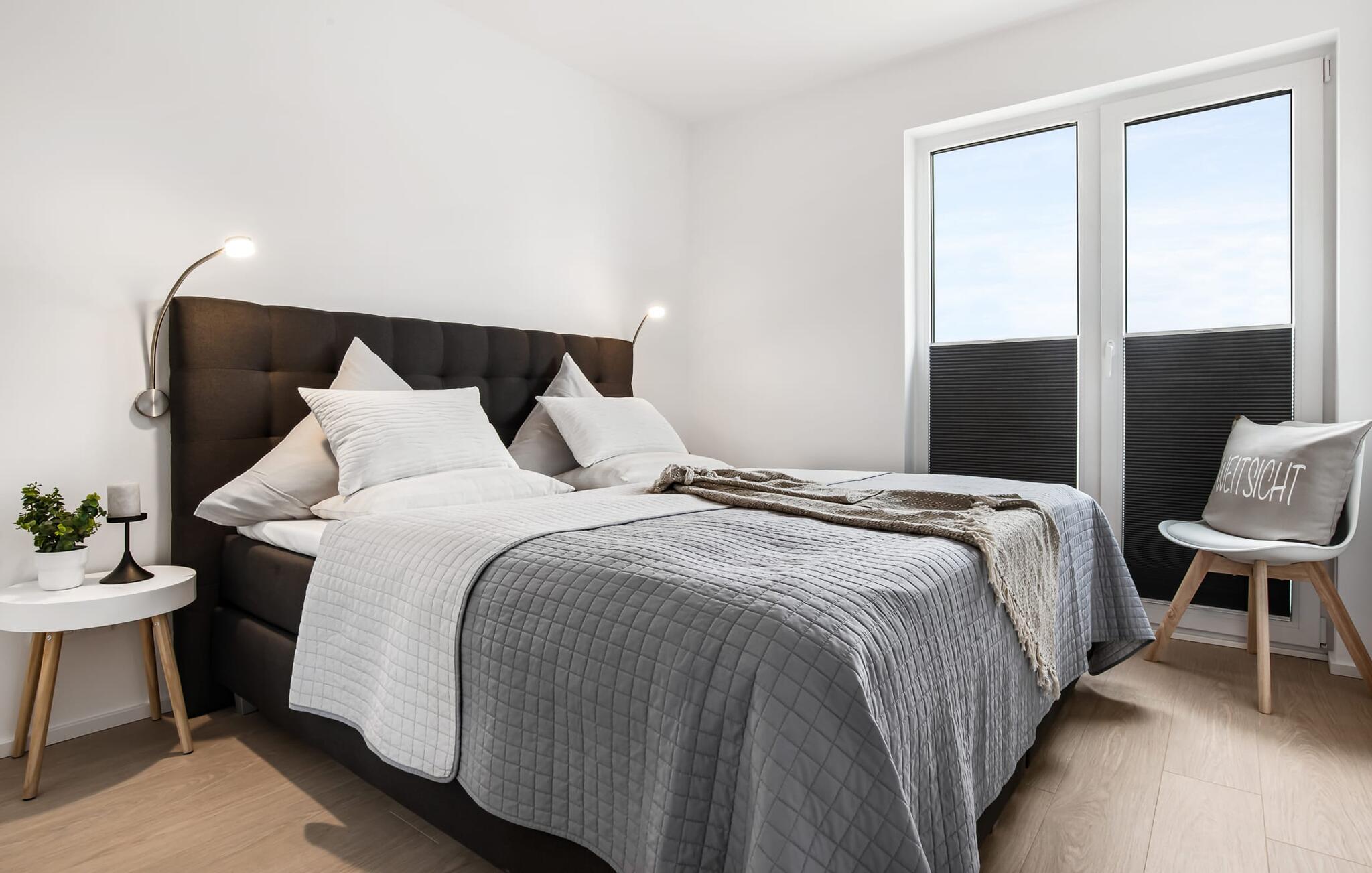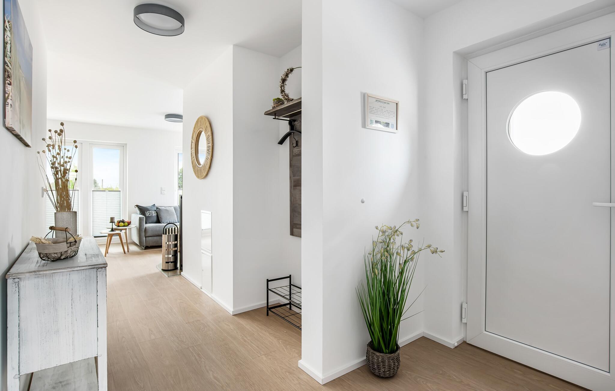 WEITSICHT er en maritim og delvist bæredygtigt indrettet ferielejlighed i stueetagen, der lever op til sit navn: Den imponerer med sin fantastiske beliggenhed med direkte udsigt over Østersøen og de naturbevarende strandenge og marker. Fra terrassen kan I nyde roen og fremsynet i fulde drag. Den naturlige sandstrand Weidefelder med kiosk, restaurant, strandstole og forskellige muligheder for vandsport kan nås på få hundrede meter. Firbenede venner kan også slippe dampen ud på hundestranden bagerst. I umiddelbar nærhed er der også den fantasifuldt designede Adventure Golf minigolfbane og lystbådehavnen i OstseeResort Olpenitz med forskellige indkøbsmuligheder. Resortets beliggenhed direkte mellem mundingen af Slime og Østersøen og tæt på den smukke by Kappeln byder også på en bred vifte af udflugtsmuligheder med båd, cykel eller til fods. Hjertet i lejligheden, som er lavet med højkvalitets og økologisk bæredygtige materialer, er den åbne, lysfyldte stue/spisestue. Vinduesfronten fra gulv til loft giver en unik udsigt over naturen. Det integrerede køkken er perfekt udstyret. Det gør det sjovt at lave mad sammen. Skulle vejret nogensinde blive nordisk, inviterer opholdsområdet til afslapning. Pejsen skaber hygge med sin knitrende ild. Direkte fra opholdsstuen kommer man ind på den rummelige terrasse med syd-vest orientering. Dette tilbyder afslappende timer væk fra stress og jag i resten af feriestedet ved Østersøen. Mod bagsiden med udsigt til de naturbeskyttede strandenge, marker og havet kan I nyde FREMSYNET. Møblerne af høj kvalitet på terrassen inviterer jer til at grille og slappe af. To soveværelser er tilgængelige for en afslappende nat. Den ene er udstyret med en dobbeltseng, den anden med to enkeltsenge. Med nogle få enkle trin kan sofaen i stuen forvandles til en ekstra soveplads. En baby er også velkommen (rejseseng og høj stol til rådighed). Bruserummet med gulvvarme, brusebad på gulvniveau (inklusive regnbruser) og en infrarød sauna sikrer afslappende wellness-øjeblikke. Vaskemaskinen er også placeret der. Hvis I ankommer i bil, kan I ideelt set parkere den direkte foran huset på jeres egen parkeringsplads. Ejerne af WEITSICHT planter et træ for hver reservation i Mara-Serengeti i Kenya (Afrika) gennem det selvstiftede "Sports4Trees"-initiativ. Vores yndlingssted: udsigten fra spisebordet ind i det store naturbevarende strandenge. Bemærk venligst: OstseeResort Olpenitz er meget populært, og der bygges fortsat i parken. Ikke desto mindre kan I se frem til en 5-stjernet standard og et førsteklasses ophold. Byggeaktiviteterne kommer ikke til at forstyrre jer på ferien, og derfor gives der ikke yderligere afslag i prisen.