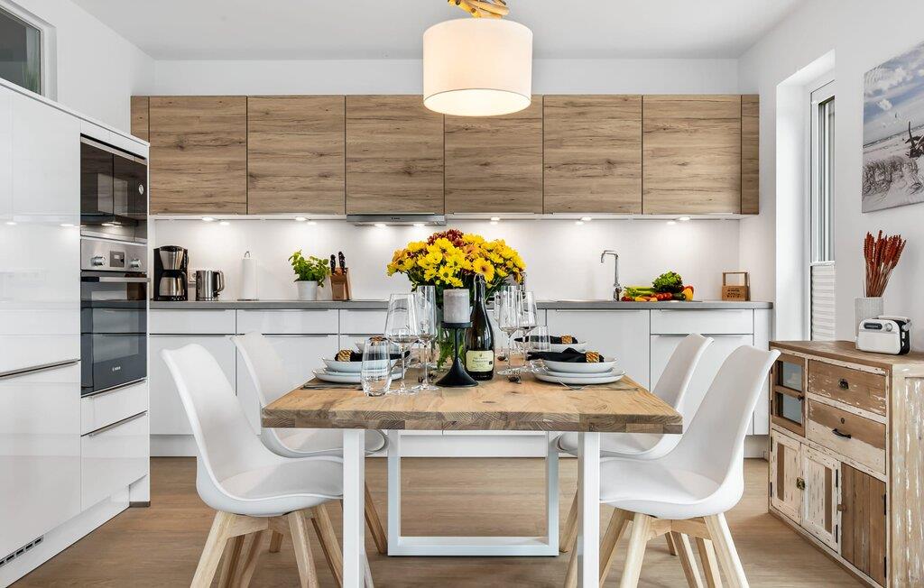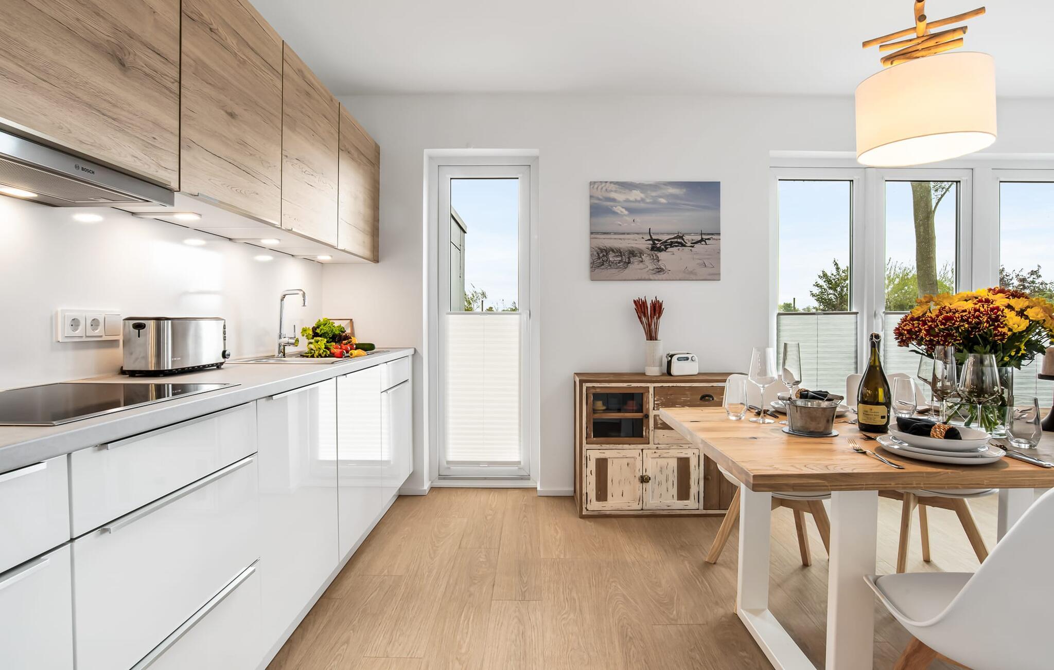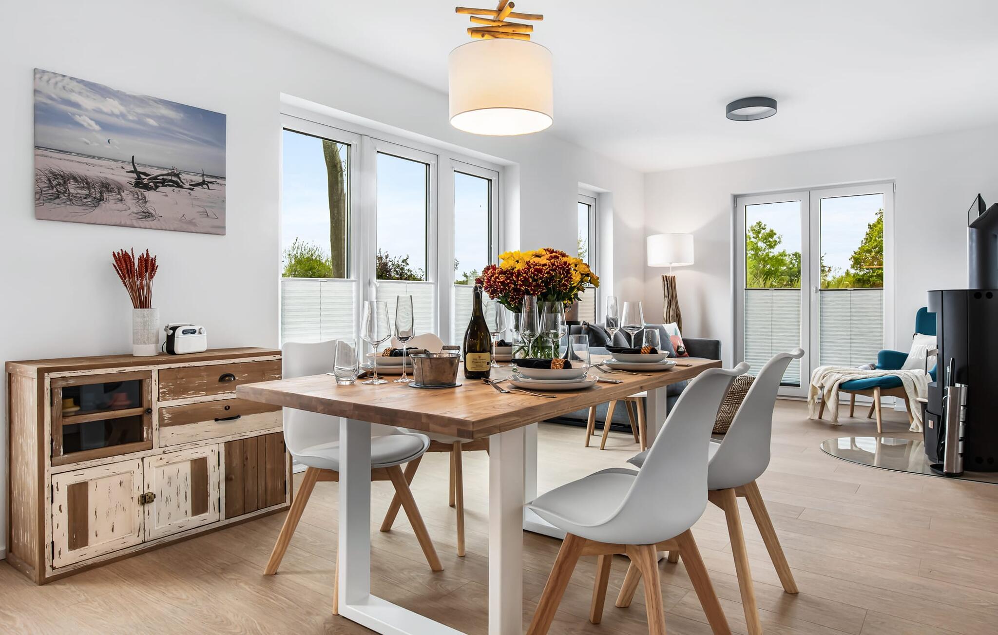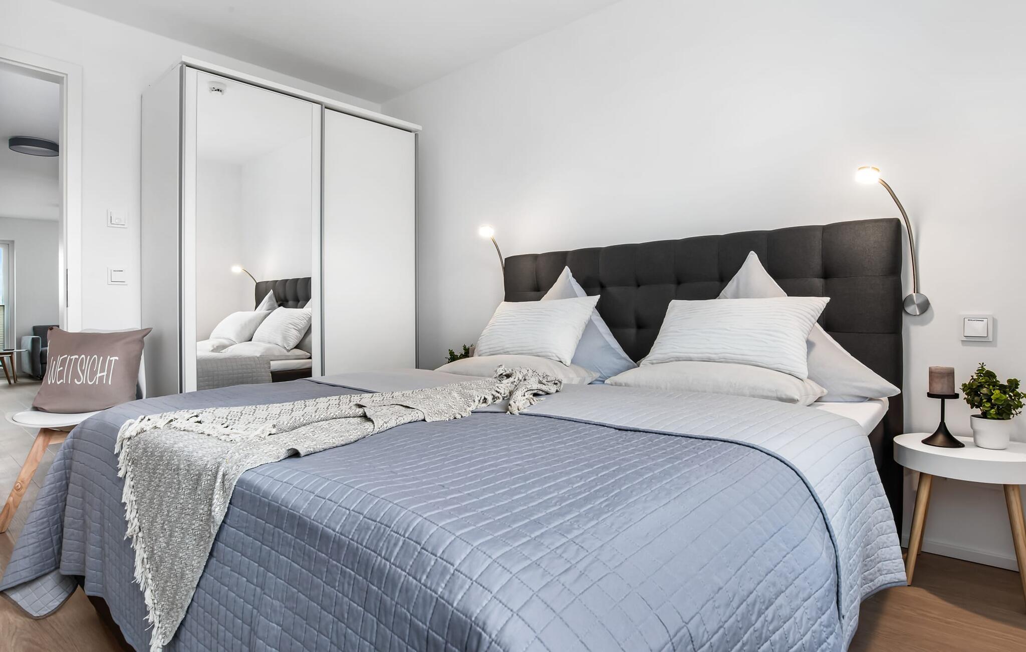 WEITSICHT er en maritim og delvist bæredygtigt indrettet ferielejlighed i stueetagen, der lever op til sit navn: Den imponerer med sin fantastiske beliggenhed med direkte udsigt over Østersøen og de naturbevarende strandenge og marker. Fra terrassen kan I nyde roen og fremsynet i fulde drag. Den naturlige sandstrand Weidefelder med kiosk, restaurant, strandstole og forskellige muligheder for vandsport kan nås på få hundrede meter. Firbenede venner kan også slippe dampen ud på hundestranden bagerst. I umiddelbar nærhed er der også den fantasifuldt designede Adventure Golf minigolfbane og lystbådehavnen i OstseeResort Olpenitz med forskellige indkøbsmuligheder. Resortets beliggenhed direkte mellem mundingen af Slime og Østersøen og tæt på den smukke by Kappeln byder også på en bred vifte af udflugtsmuligheder med båd, cykel eller til fods. Hjertet i lejligheden, som er lavet med højkvalitets og økologisk bæredygtige materialer, er den åbne, lysfyldte stue/spisestue. Vinduesfronten fra gulv til loft giver en unik udsigt over naturen. Det integrerede køkken er perfekt udstyret. Det gør det sjovt at lave mad sammen. Skulle vejret nogensinde blive nordisk, inviterer opholdsområdet til afslapning. Pejsen skaber hygge med sin knitrende ild. Direkte fra opholdsstuen kommer man ind på den rummelige terrasse med syd-vest orientering. Dette tilbyder afslappende timer væk fra stress og jag i resten af feriestedet ved Østersøen. Mod bagsiden med udsigt til de naturbeskyttede strandenge, marker og havet kan I nyde FREMSYNET. Møblerne af høj kvalitet på terrassen inviterer jer til at grille og slappe af. To soveværelser er tilgængelige for en afslappende nat. Den ene er udstyret med en dobbeltseng, den anden med to enkeltsenge. Med nogle få enkle trin kan sofaen i stuen forvandles til en ekstra soveplads. En baby er også velkommen (rejseseng og høj stol til rådighed). Bruserummet med gulvvarme, brusebad på gulvniveau (inklusive regnbruser) og en infrarød sauna sikrer afslappende wellness-øjeblikke. Vaskemaskinen er også placeret der. Hvis I ankommer i bil, kan I ideelt set parkere den direkte foran huset på jeres egen parkeringsplads. Ejerne af WEITSICHT planter et træ for hver reservation i Mara-Serengeti i Kenya (Afrika) gennem det selvstiftede "Sports4Trees"-initiativ. Vores yndlingssted: udsigten fra spisebordet ind i det store naturbevarende strandenge. Bemærk venligst: OstseeResort Olpenitz er meget populært, og der bygges fortsat i parken. Ikke desto mindre kan I se frem til en 5-stjernet standard og et førsteklasses ophold. Byggeaktiviteterne kommer ikke til at forstyrre jer på ferien, og derfor gives der ikke yderligere afslag i prisen.