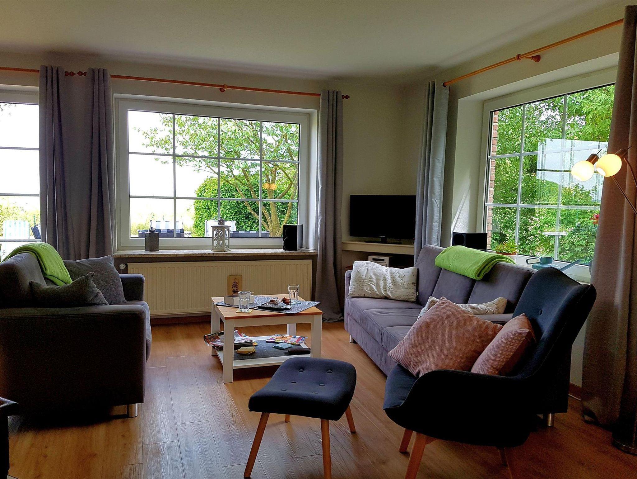 Das Ferienhaus Weltblick liegt in dem kleinen beschaulichen Dorf Welt - 5 km vom Eidersperrwerk entfernt Richtung Sankt Peter Ording. Hier finden Sie Ruhe und viel Natur. Das freistehende Einfamilienhaus (120qm) ist ausgelegt für für zu 6 Personen und 1 Kleinkind. Vom Wohnzimmer aus haben Sie einen freien Blick bis zum Horizont über Wiesen und Weiden. Der Garten mit 1.200qm Rasenfläche, einer Außenterrasse mit Sitzgruppe, Grill, Sonnenschirm und Sonnenliegen bieten genug Platz zum Entspannen und Wohlfühlen. Neben den 3 Schlafräumen, einem Vollbad, einem Gäste-WC, Küche und Hauswirtschaftsraum, genießen Sie das modern eingerichtete Wohnzimmer mit großer Fensterfront, offener Küche, Sitztresen und Ausgang zur Terrasse.