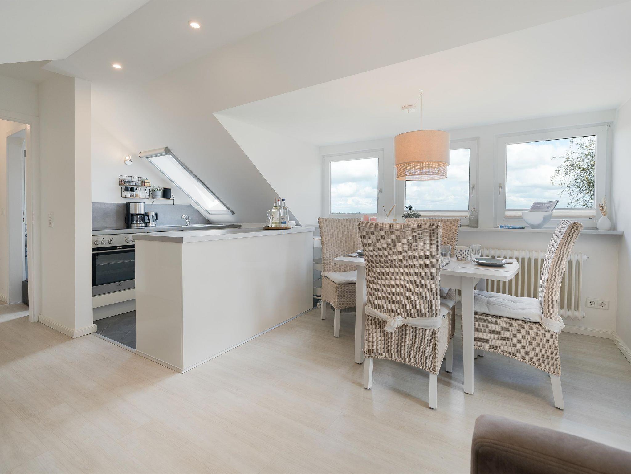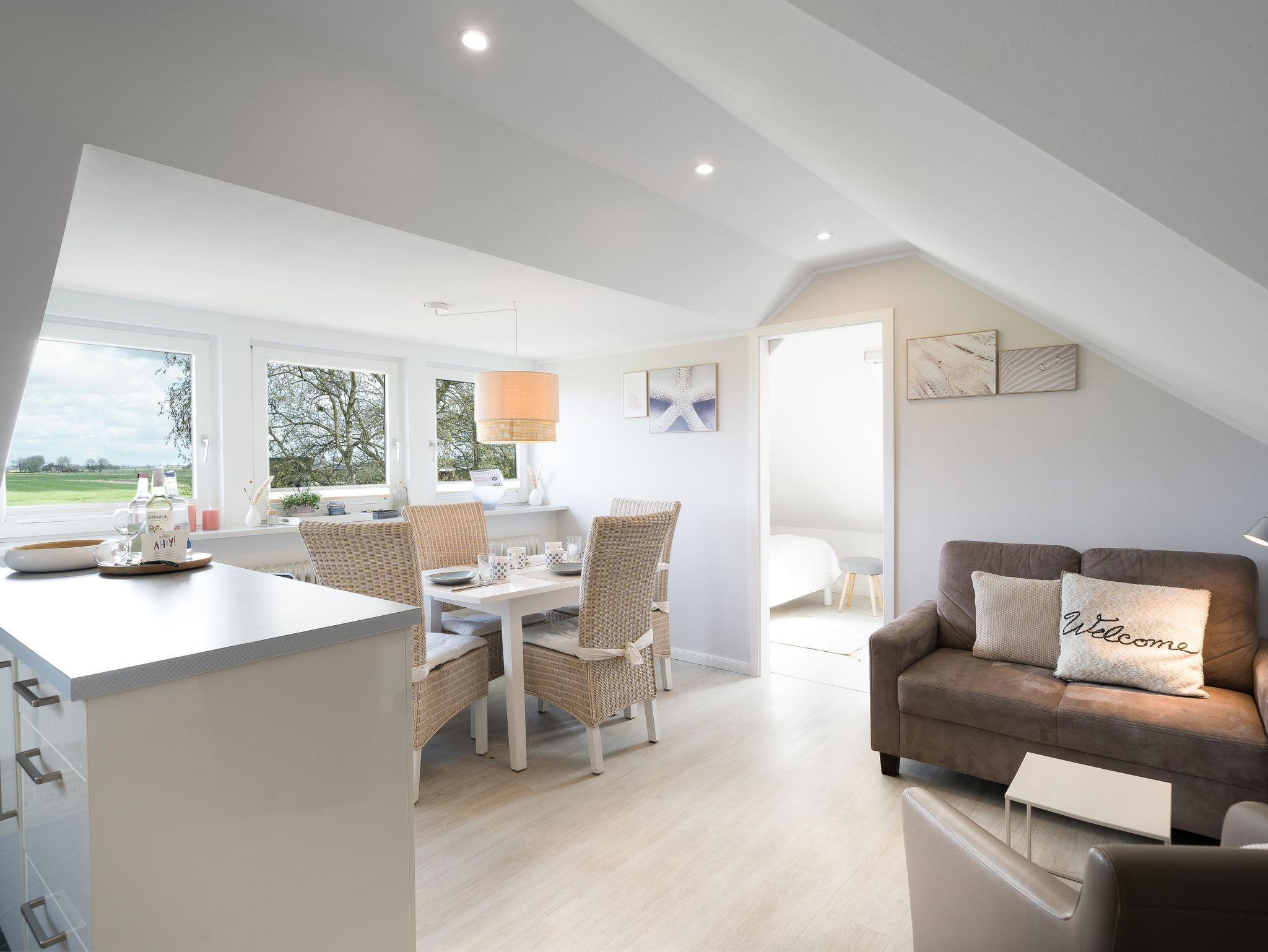Im Obergeschoß des Hus inne Sünn empfängt Sie die Storchennest- eine 53qm große, hell und freundlich vollständig entkernte, wärmeisolierte und komplett neu gestaltete Wohnung. Die Fensterfront im Essbereich bietet eine wunderbare Aussicht über die Eiderstedter Marsch und lässt Sie mit seinem Weitblick auf Gedanken fern ab vom Alltag kommen. Die Wohnung verfügt über 2 Schlafzimmer (mit spezieller Verdunklung).