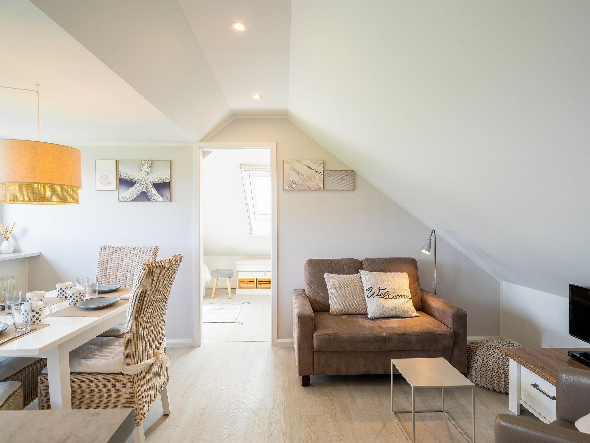 Der gemütliche Essbereich bietet Platz für 4 Personen. Im hellen Wohnbereich befinden sich ein Flachbild-Fernseher und eine gemütliche Couchgarnitur.