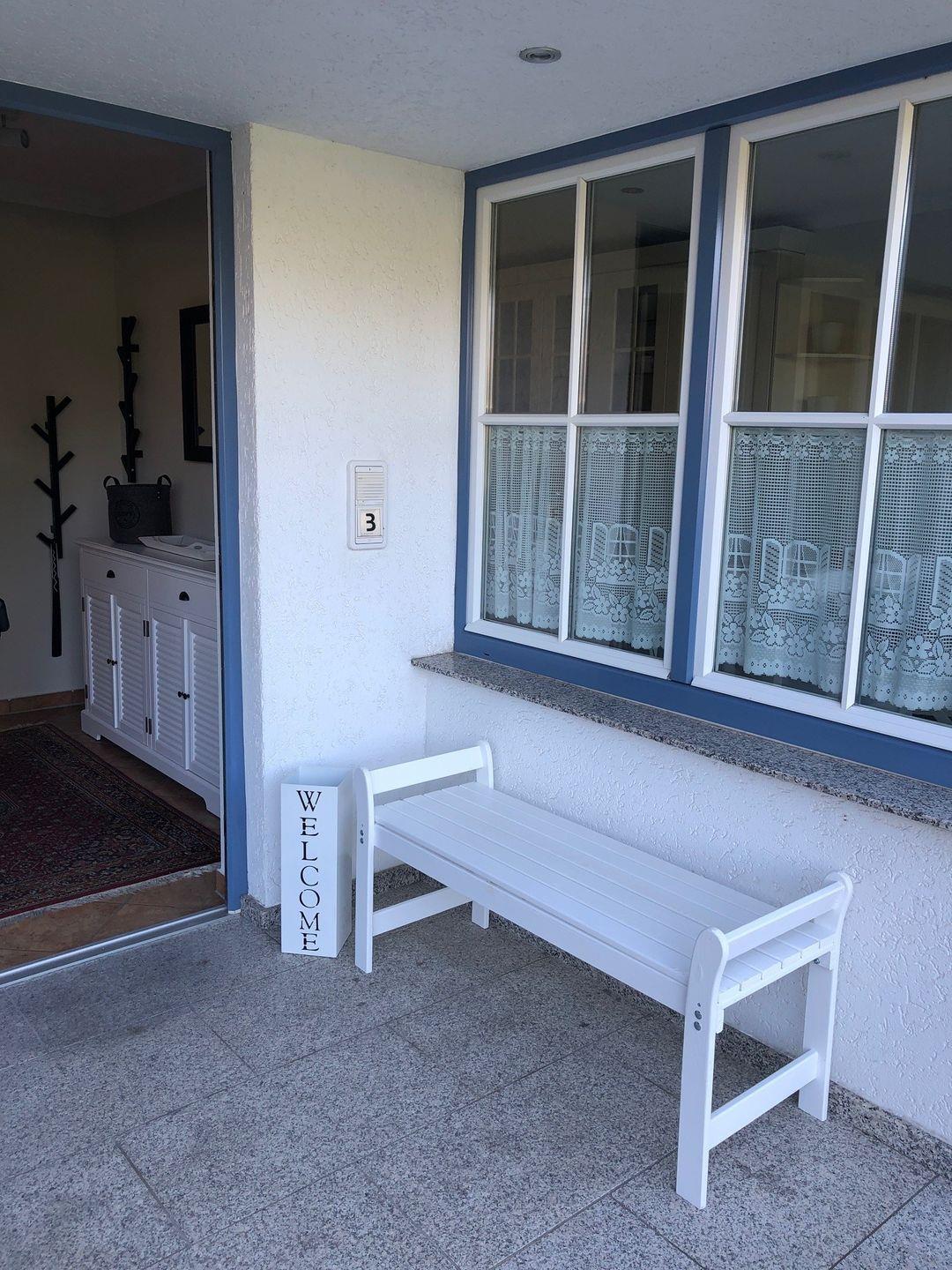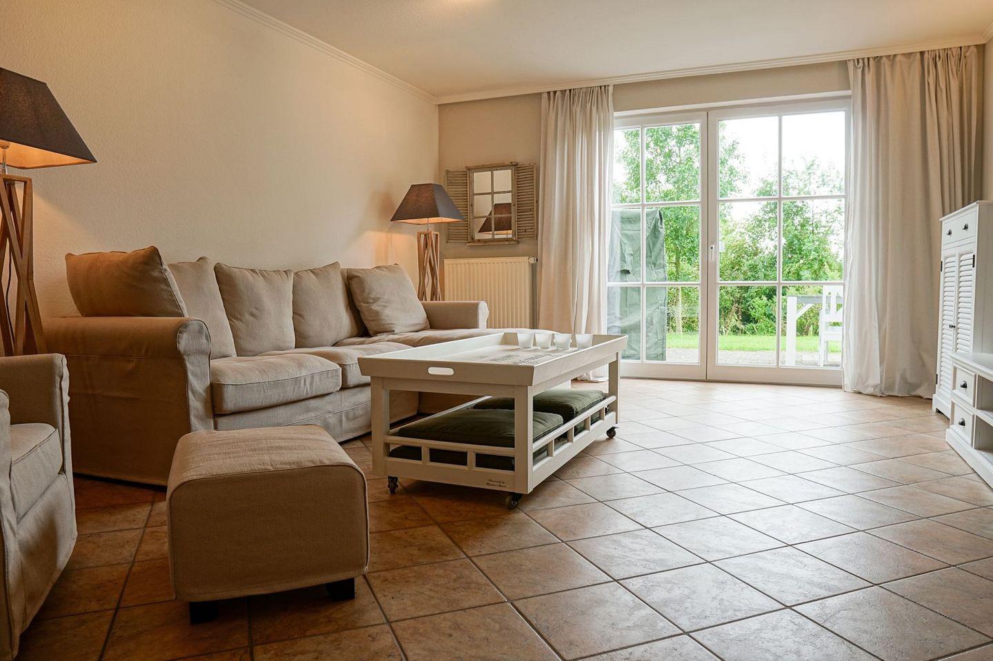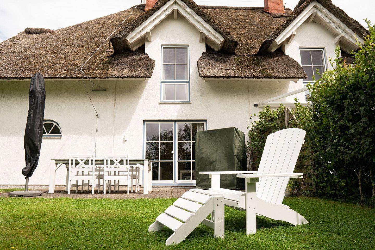 Die Terrasse verfügt über Gartenmöbel und eigenem Strandkorb.