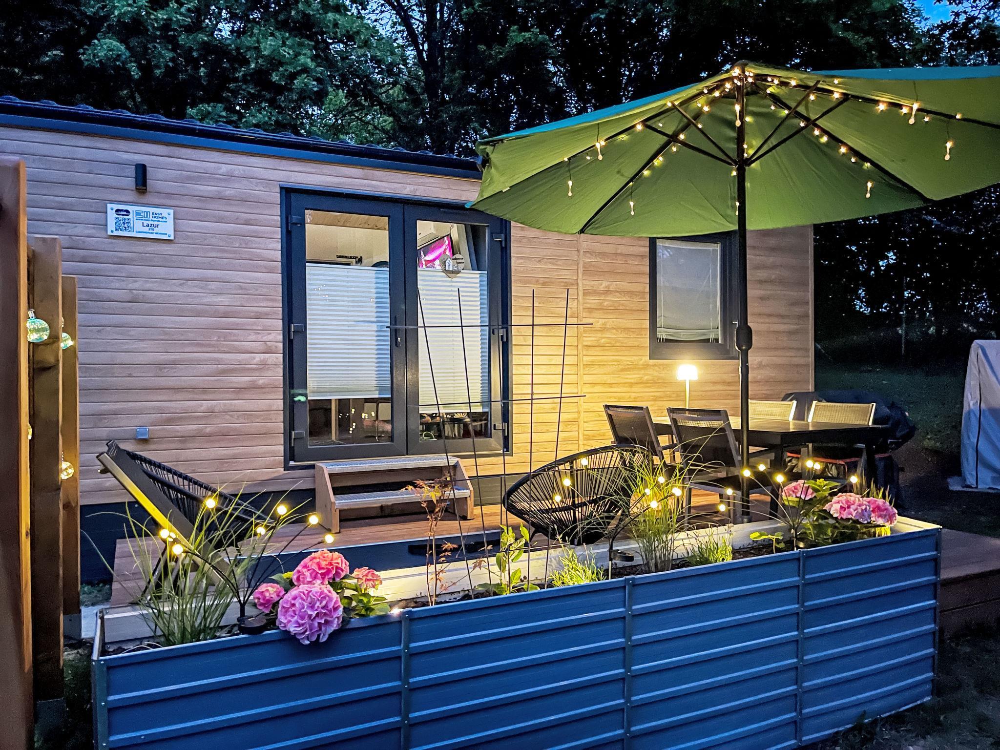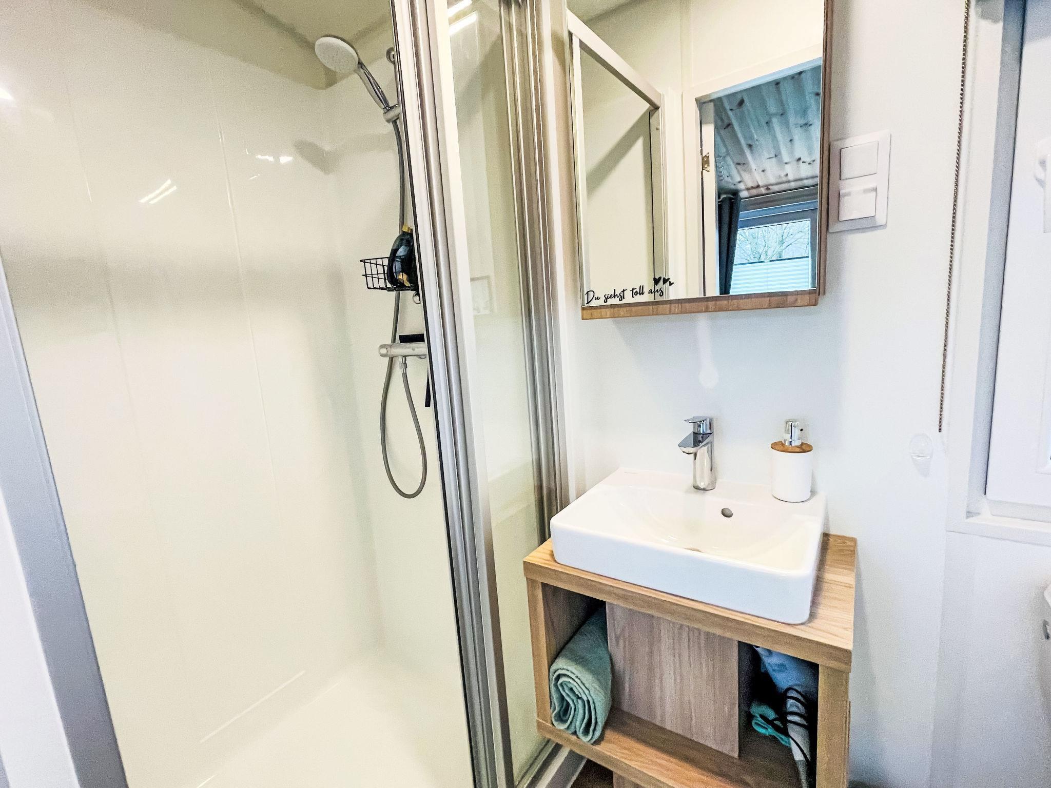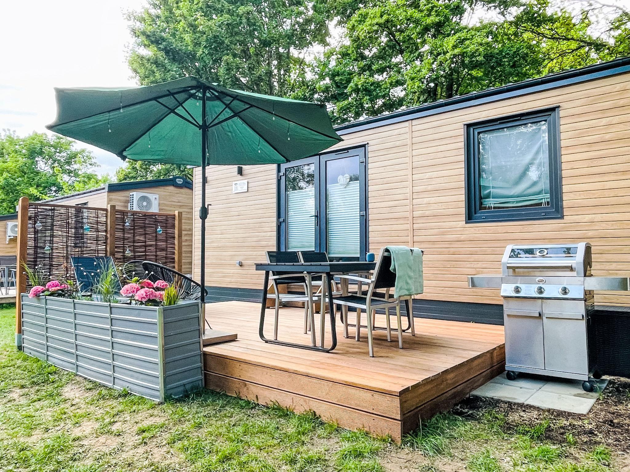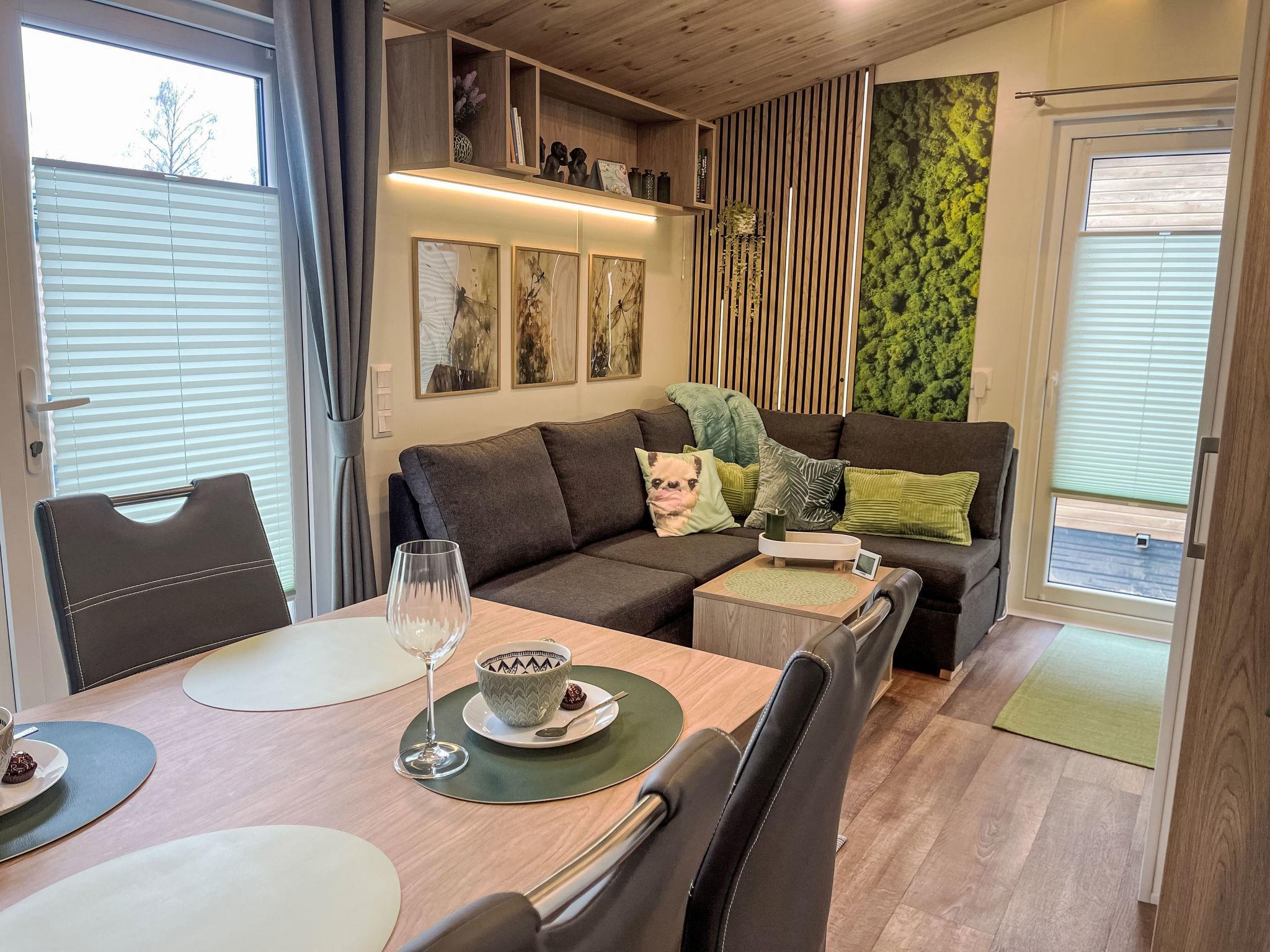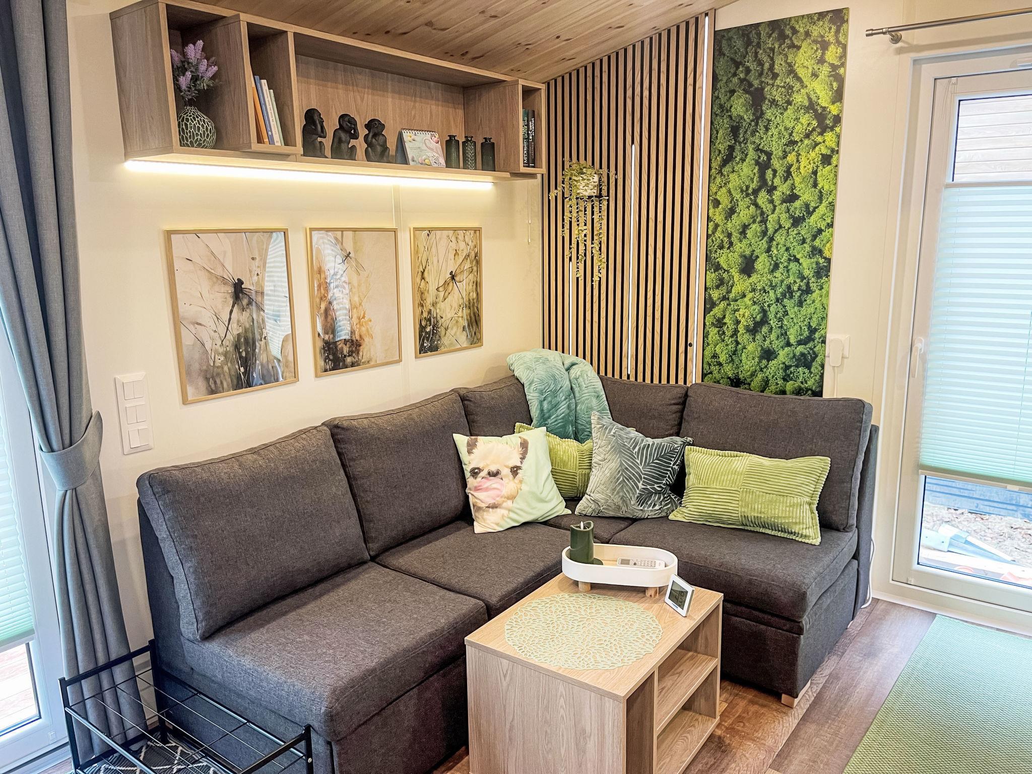 "Tiny Haus Tiny Moments", 3-room mobile home 31 m2. Cosy furnishings: living/dining room with 1 sofabed, dining table and satellite TV (flat screen). Exit to the terrace. 1 room with 1 double bed (160 cm, length 200 cm), satellite TV. 1 room with 2 beds (80 cm, length 200 cm), satellite TV. Kitchenette (oven, dishwasher, 2 induction hot plates, toaster, kettle, electric coffee machine). Shower/WC. Electric heating, air-conditioning. Terrace. Terrace furniture, barbecue (portable). Facilities: mosquito net. Please note: non-smokers only. Note: The Wi-Fi connection may be limited depending on capacity.