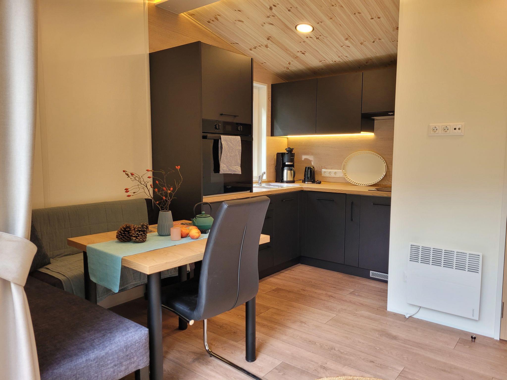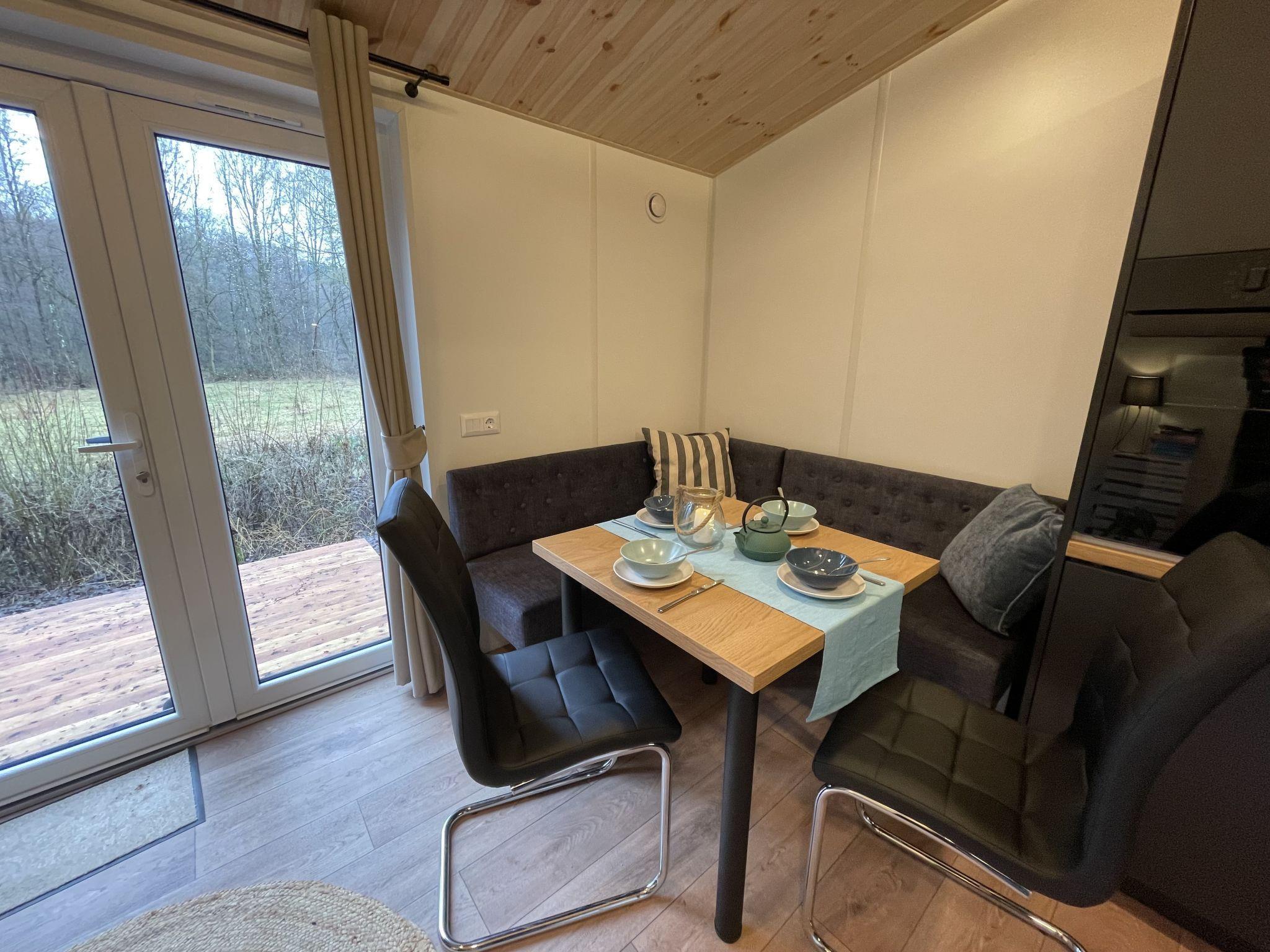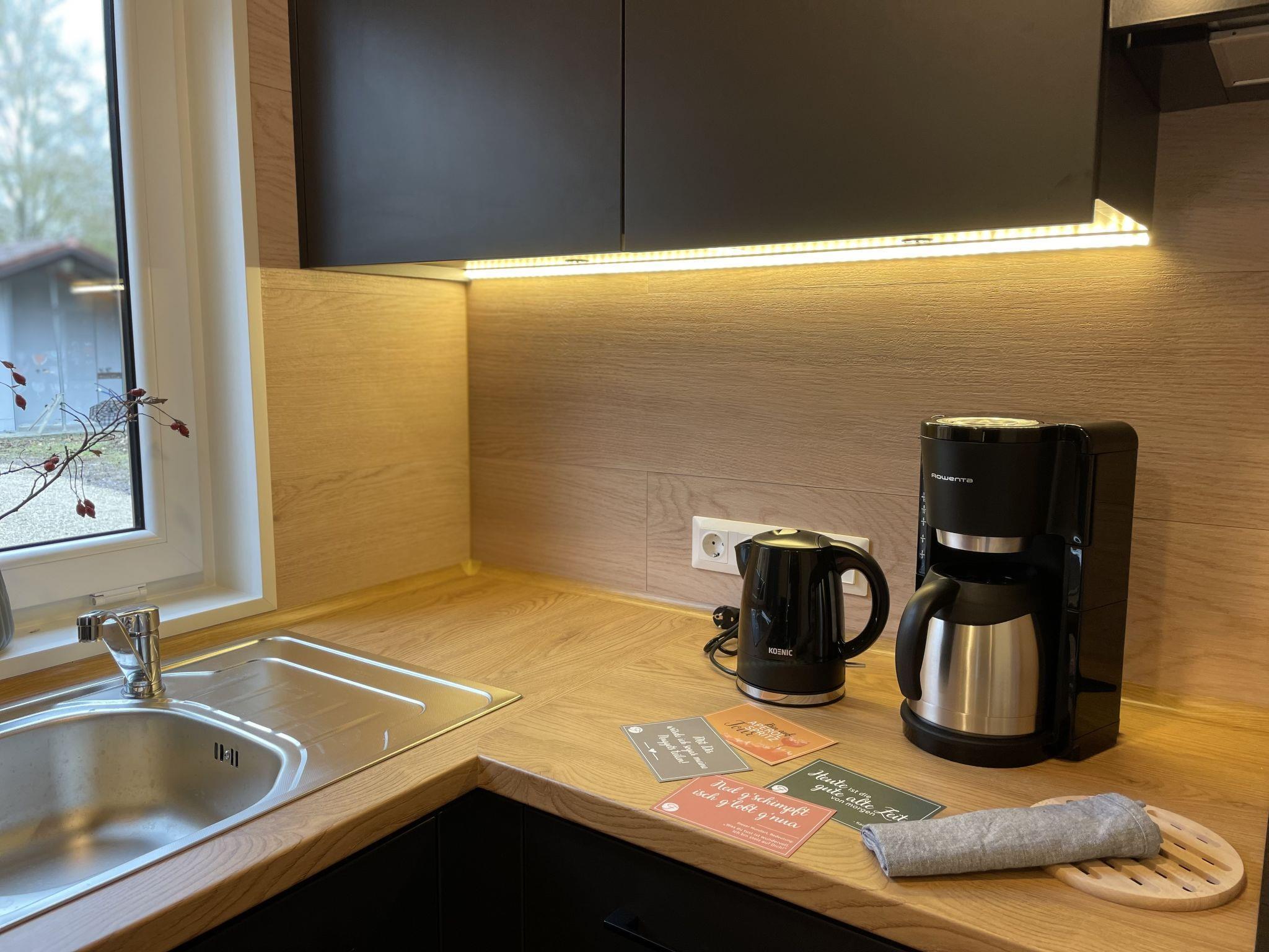 "Tiny Haus Soul & Lake", 3-room mobile home 29 m2. Cosy furnishings: living/dining room with dining table and satellite TV (flat screen). Exit to the terrace. 1 room with 1 double bed (140 cm, length 200 cm). 1 room with 2 beds (80 cm, length 200 cm). Kitchenette (oven, dishwasher, 2 induction hot plates, kettle, electric coffee machine). Shower/WC. Terrace. Terrace furniture, electric barbecue (portable). Facilities: Internet (WiFi, free). Please note: non-smokers only. Smoke alarm, fire extinguisher. The house is right next to DE8834.200.5. Note: The WiFi connection may be limited depending on capacity.
