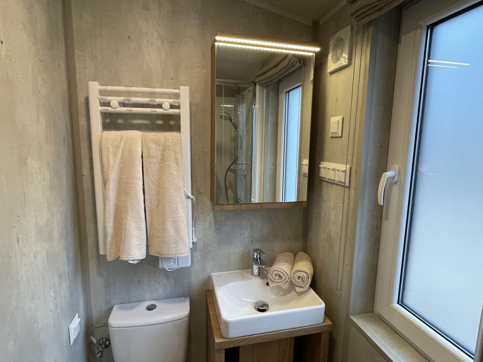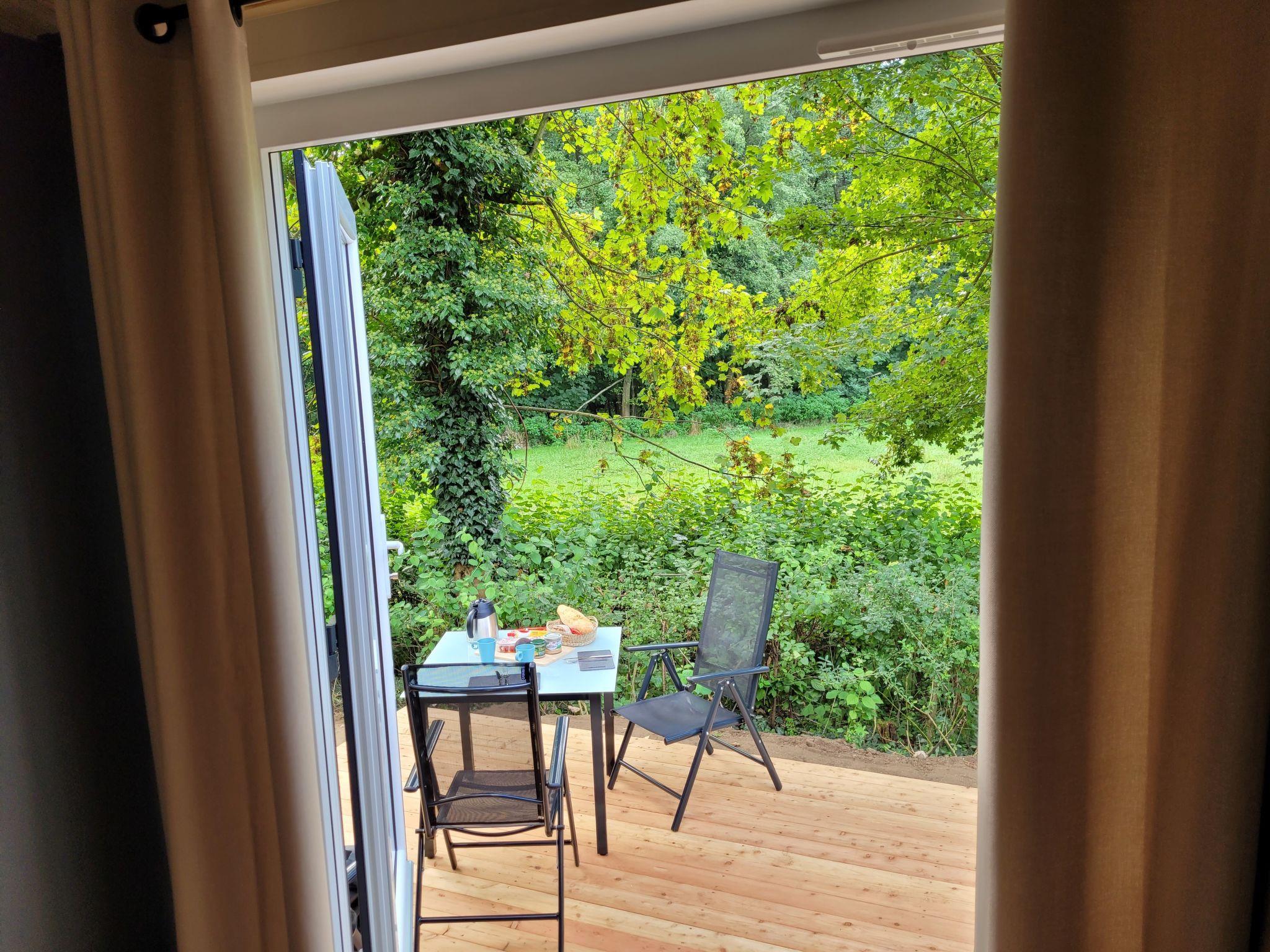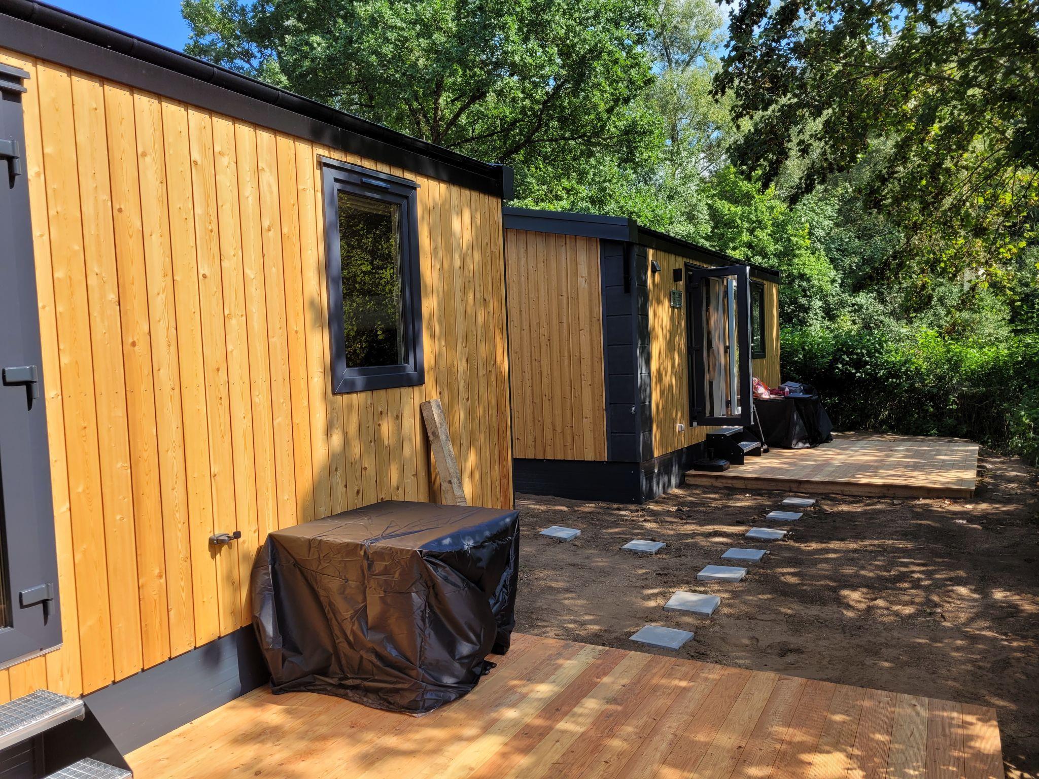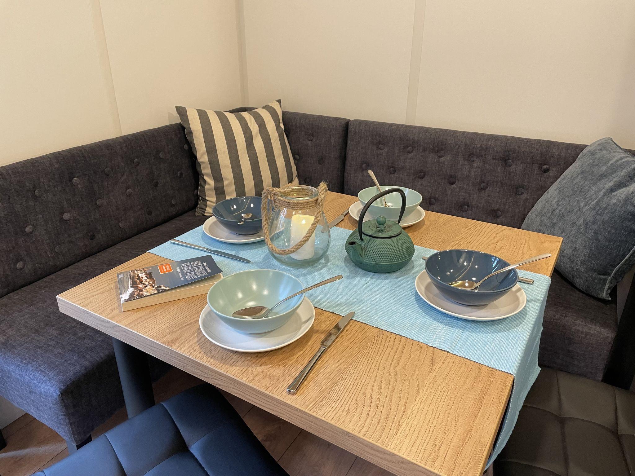 "Tiny Haus Soul & Lake", 3-room mobile home 29 m2. Cosy furnishings: living/dining room with dining table and satellite TV (flat screen). Exit to the terrace. 1 room with 1 double bed (140 cm, length 200 cm). 1 room with 2 beds (80 cm, length 200 cm). Kitchenette (oven, dishwasher, 2 induction hot plates, kettle, electric coffee machine). Shower/WC. Terrace. Terrace furniture, electric barbecue (portable). Facilities: Internet (WiFi, free). Please note: non-smokers only. Smoke alarm, fire extinguisher. The house is right next to DE8834.200.5. Note: The WiFi connection may be limited depending on capacity.