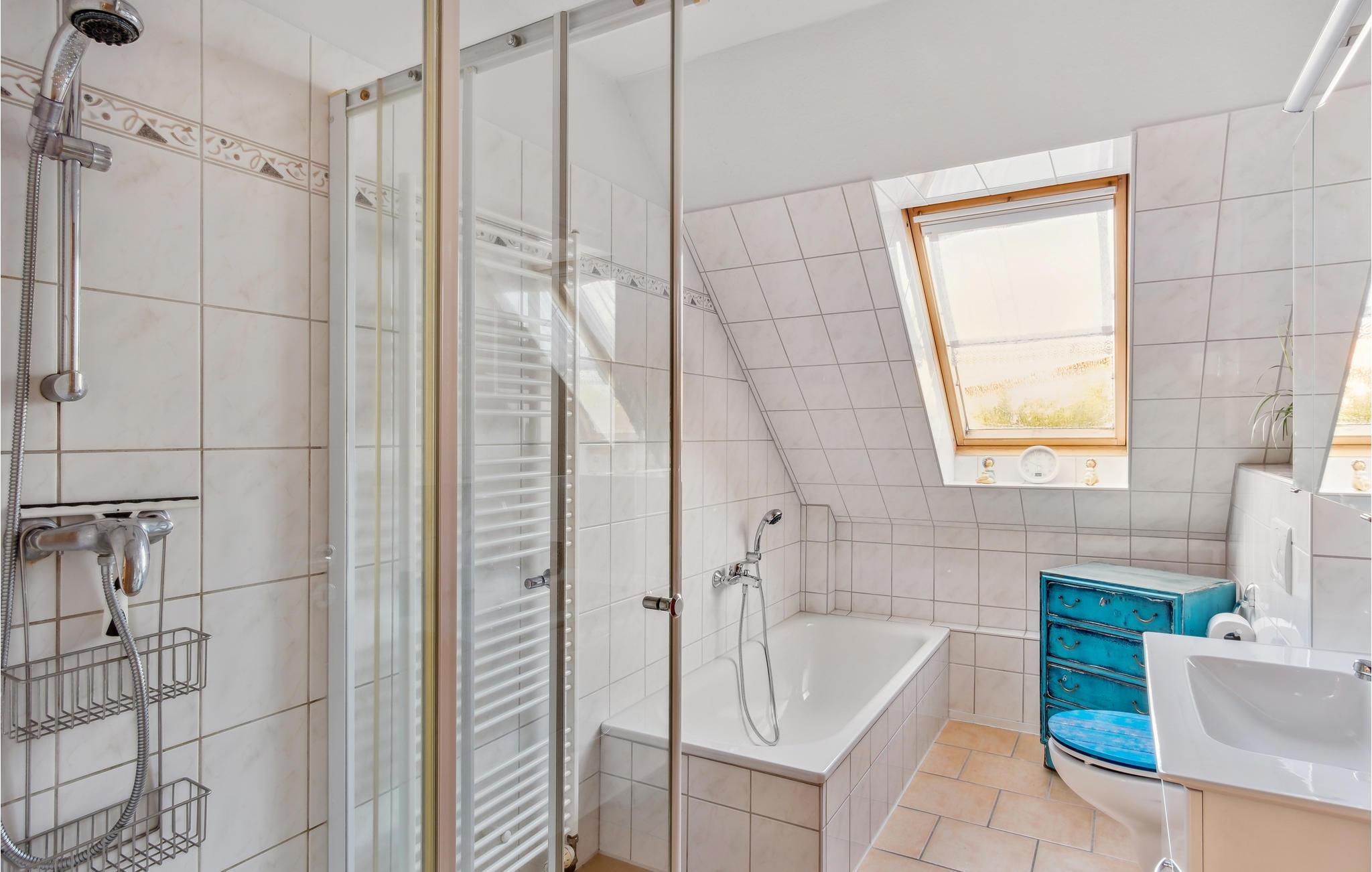 I badeværelset er der både brusebad og badekar. Desuden er der tre tv-er og trådløst internet.