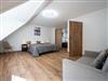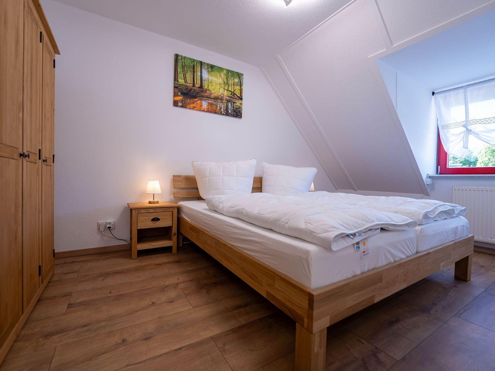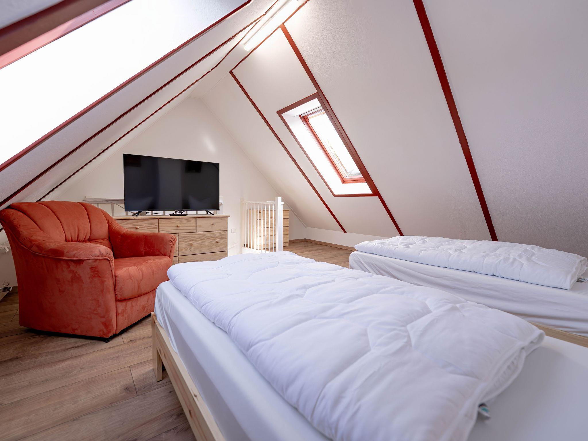 Im Obergeschoss befinden sich zwei Schlafzimmer mit jeweils einem Doppelbett. Eines davon verfügt zusätzlich über eine Schlafcouch (1,20 m). Die offene Galerie im Dachgeschoss ist mit zwei Einzelbetten ausgestattet und eignet sich perfekt als Rückzugsort für Kinder. Im Wohnzimmer ist eine Aufbettung auf dem Schlafsofa möglich. (1,40 m)