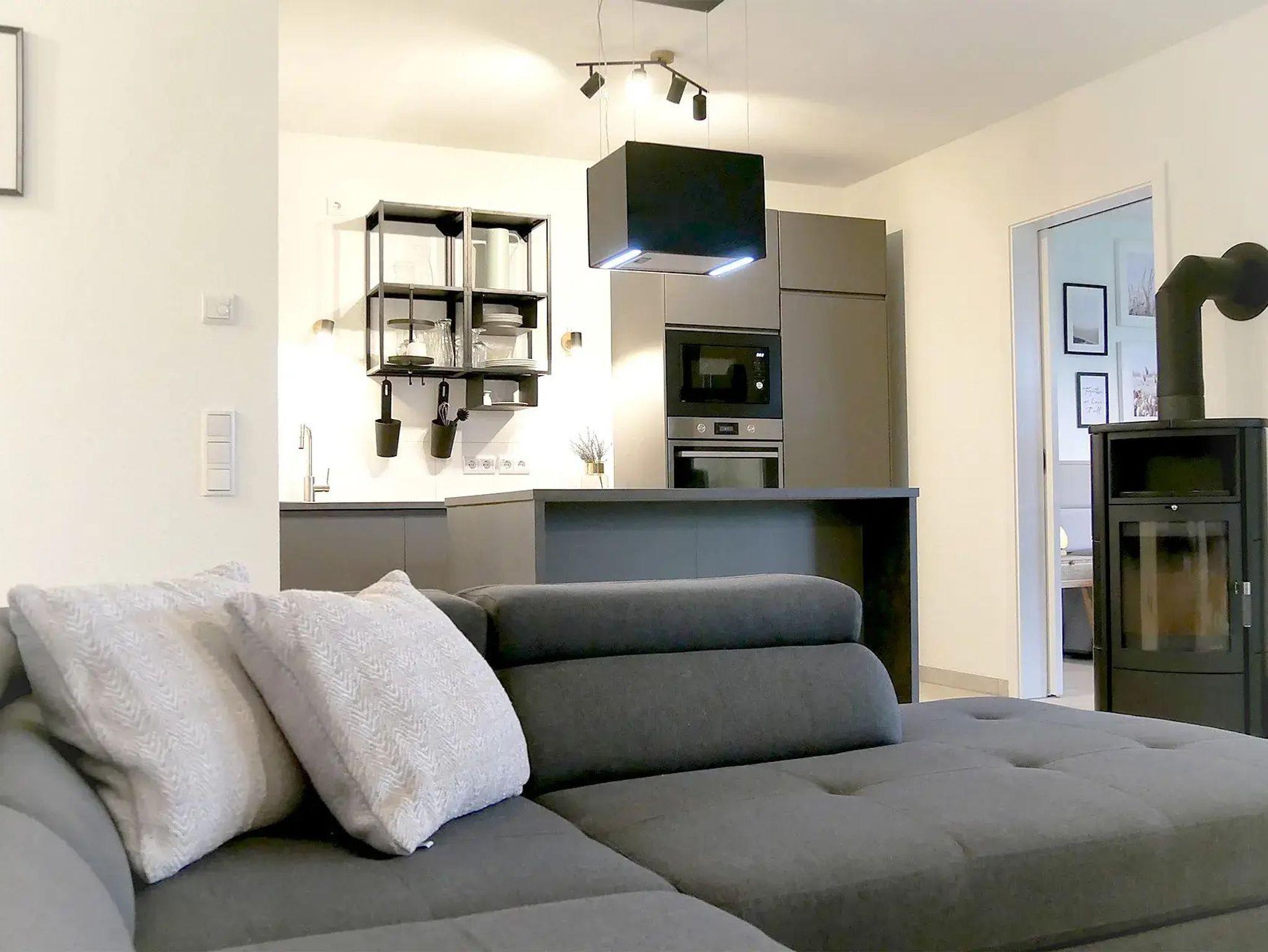 • Einbauküche mit Spülmaschine, Herd mit Backofen, Mikrowelle, Kühlschrank mit Tiefkühlfach, Kaffeemaschine, Wasserkocher, Toaster, Geschirr und Gläser für 6 Gäste