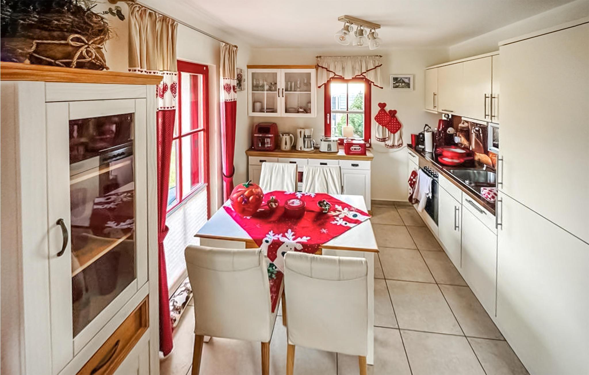 Havemøbler af høj kvalitet, en strandstol, liggestole og en grill er tilgængelige. Start din dag med en god morgenmad på terrassen, og afslut med en hyggelig grillaften. Det lyse badeværelse har spabad og intern sauna. Her kan du tage en dyb indånding og slappe af. En vindeltrappe fører til øverste etage med skråt loft, hvor du finder et rummeligt soveværelse med en dobbeltseng og et andet soveværelse med to enkeltsenge.