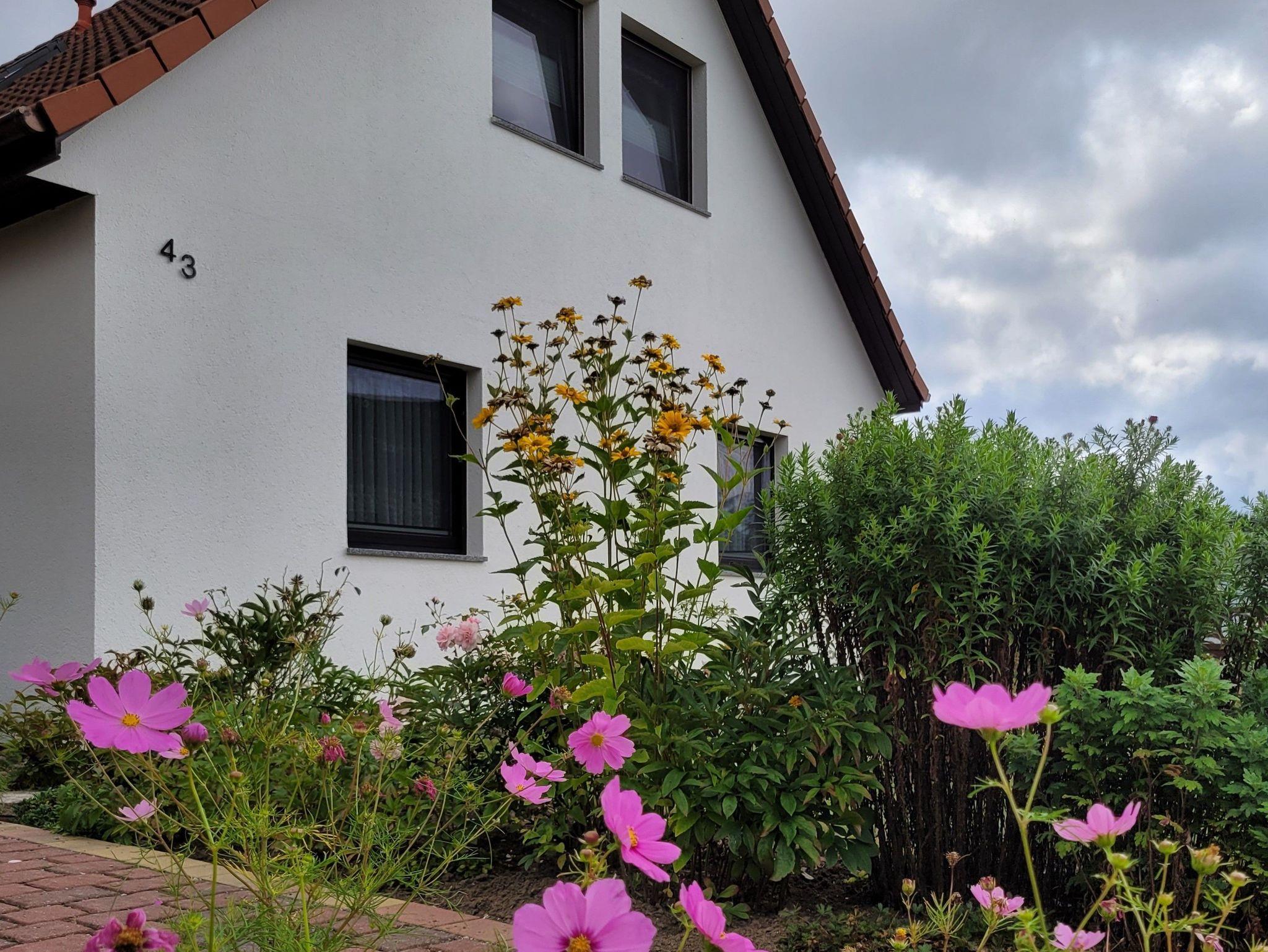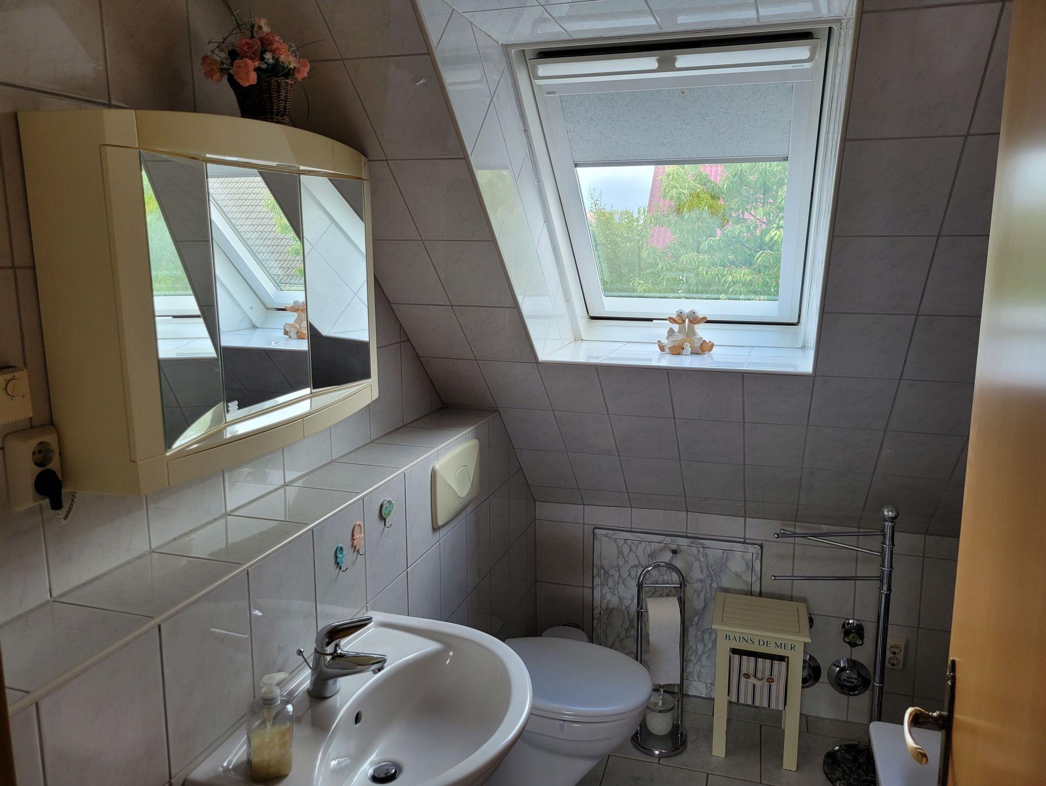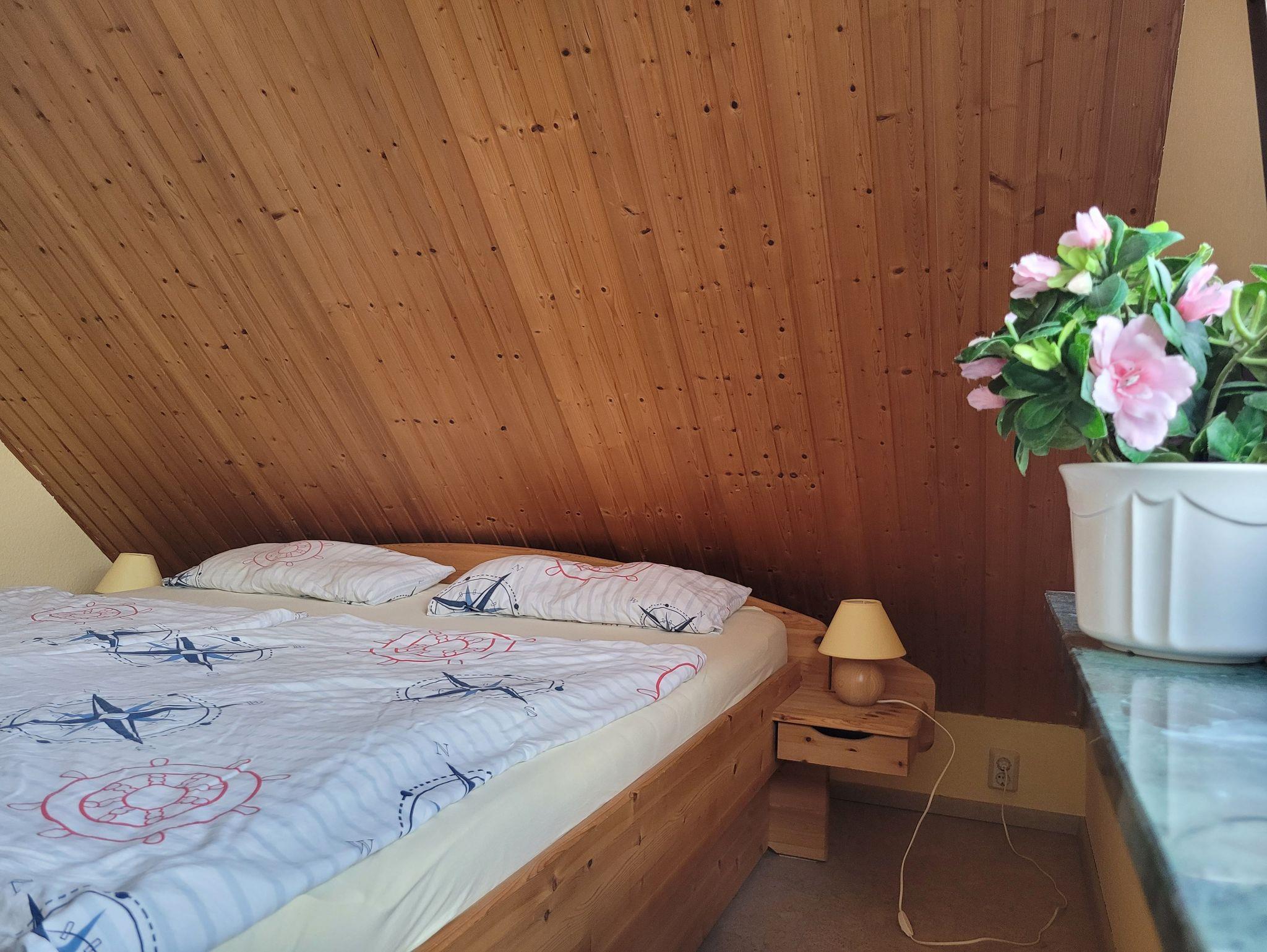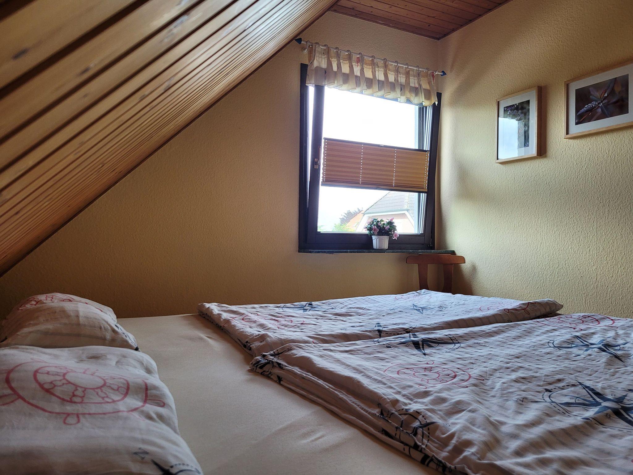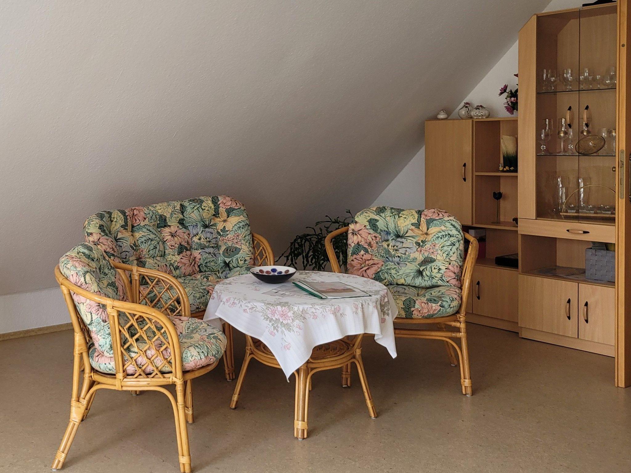 Unsere 61 qm große Ferienwohnung befindet sich im 1. Obergeschoß eines Einfamilienhauses in ruhiger Lage. Sie verfügt über zwei Schlafräume, einen Wohnraum mit Balkon, Küche, Bad und kann von maximal vier Personen bewohnt werden. Das funktionale Bad ist mit einer Dusche ausgestattet. Für Kinder bis 3 Jahre stellen wir Ihnen gern ein Kinderbett und / oder Hochstuhl zur Verfügung.