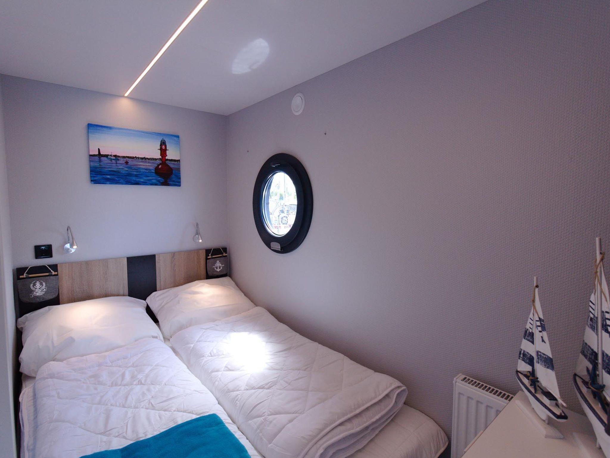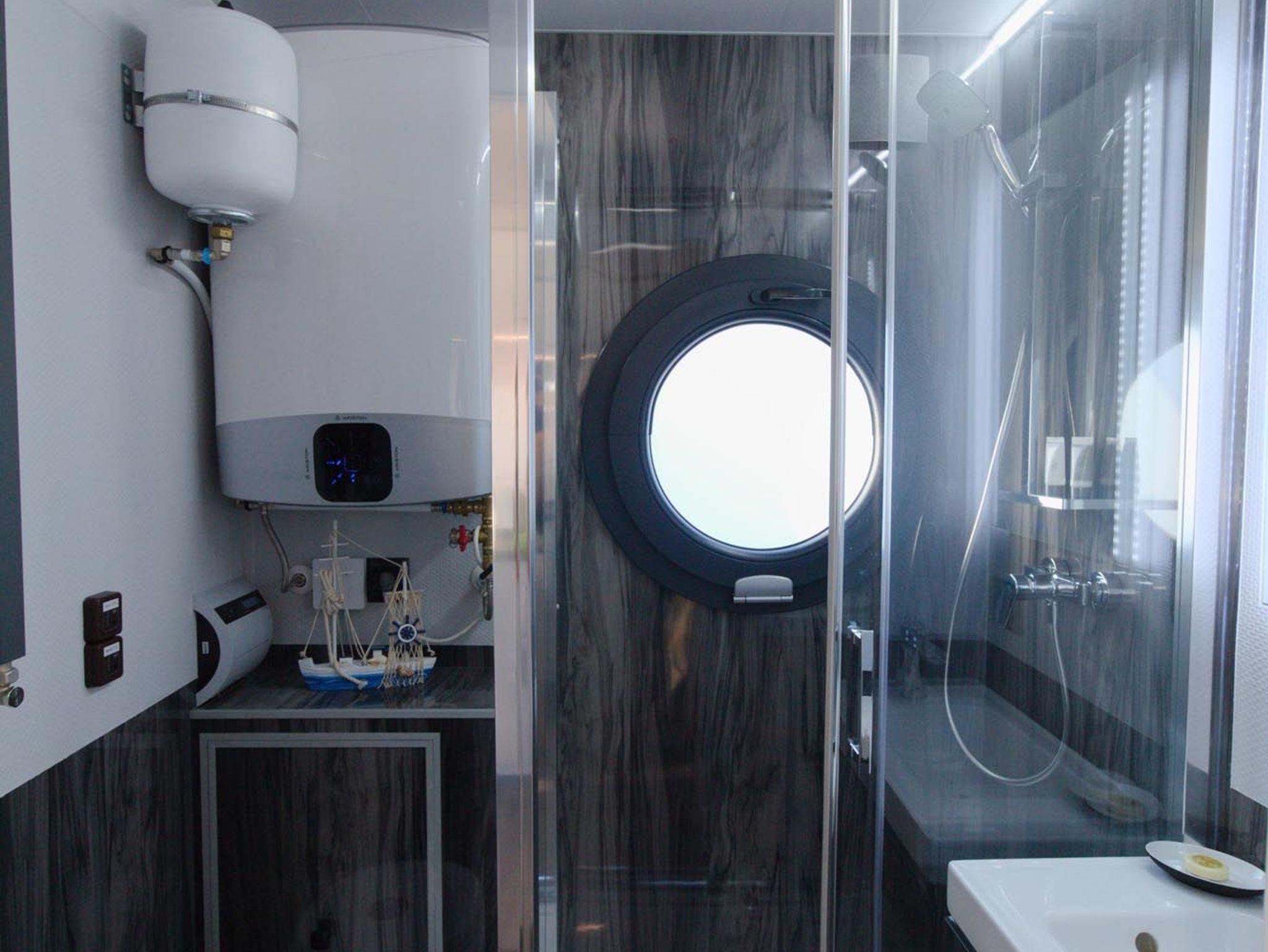 Im Inneren des Hausbootes finden Sie neben dem Wohnraum mit Fußbodenheizung für kalte Tage zwei Schlafräume mit je einem Doppelbett sowie ein modernes Duschbad. Zwei weitere Schlafmöglichkeiten befinden sich auf der ausziehbaren Couch im Wohnraum. Genügend Stauraum finden Sie in den Schränken sowie in den Schubladen unter den Betten.
