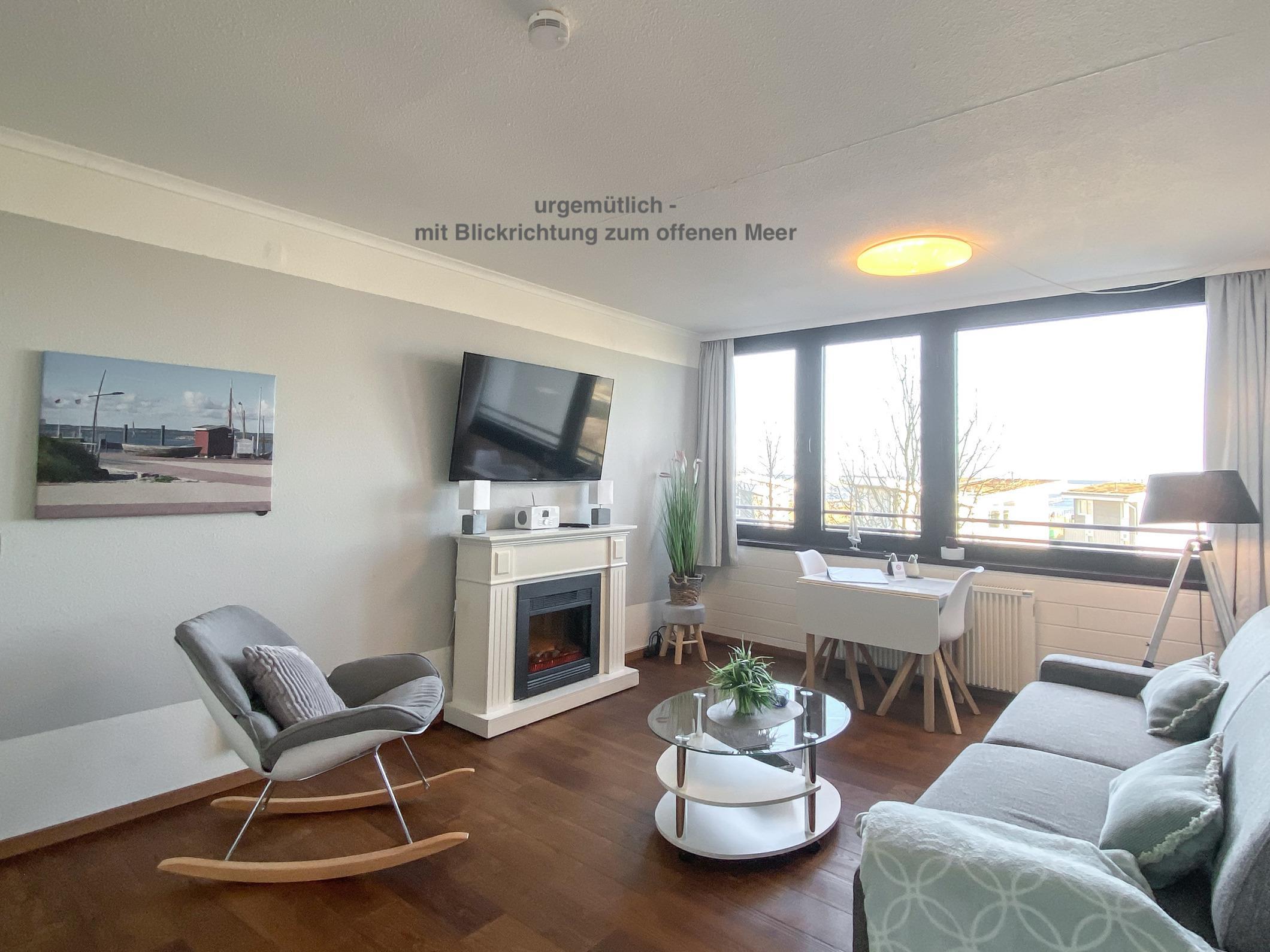 Apartment mit tollem Blick und Deko-Kamin gleich hinterm Deich; seeseitig. Gemütlich und modern eingerichtet für 2, Wannenbad, WLAN, max. 1 Hund. Strandentfernung ca. 200 m.