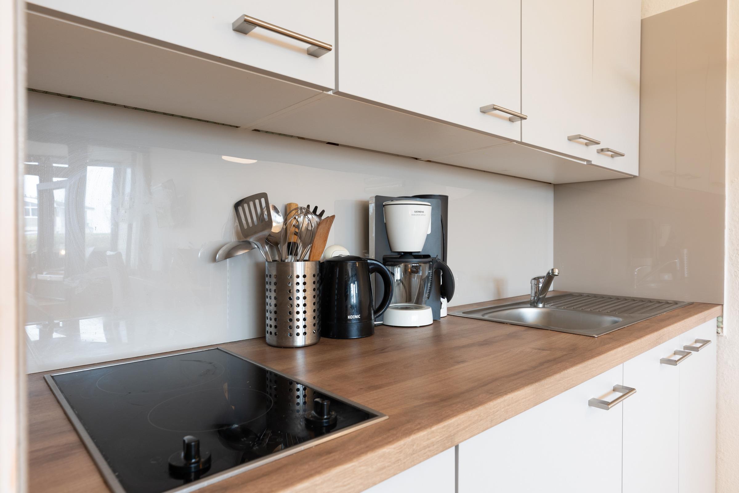 Das Appartement besitzt eine offene und gut ausgestattete Küchenzeile. Hier finden Sie ein 2-Platten-Ceranfeld, eine Mikrowelle, einen Kühlschrank, eine Filter-Kaffeemaschine, Geschirr und Besteck, sowie einen Toaster. Der Schlafbereich befindet sich im gleichen Raum und ist mit einem Doppelbett (Größe 1,80m x 2,00m) und einem Fernseher ausgestattet. Für genügend Stauraum sorgen die Schubladen unter dem Bett, sowie ein Regal. Das Highlight ist die dem Wohnzimmer angegliederte Loggia, welche zu gemütlichen Stunden und ruhigen Momenten einlädt. Von dort aus schauen Sie auf die offene See in der Ferne und zu den Abendstunden in den Sonnenuntergang hinein. Hier können Sie Ihre Seele baumeln lassen. Das voll ausgestattete Badezimmer verfügt über eine Dusche, eine Toilette, ein Waschbecken, sowie einen Föhn. Kostenlose Parkplätze befinden sich in direkter Umgebung zum Haus, in der sich das Apartment befindet.