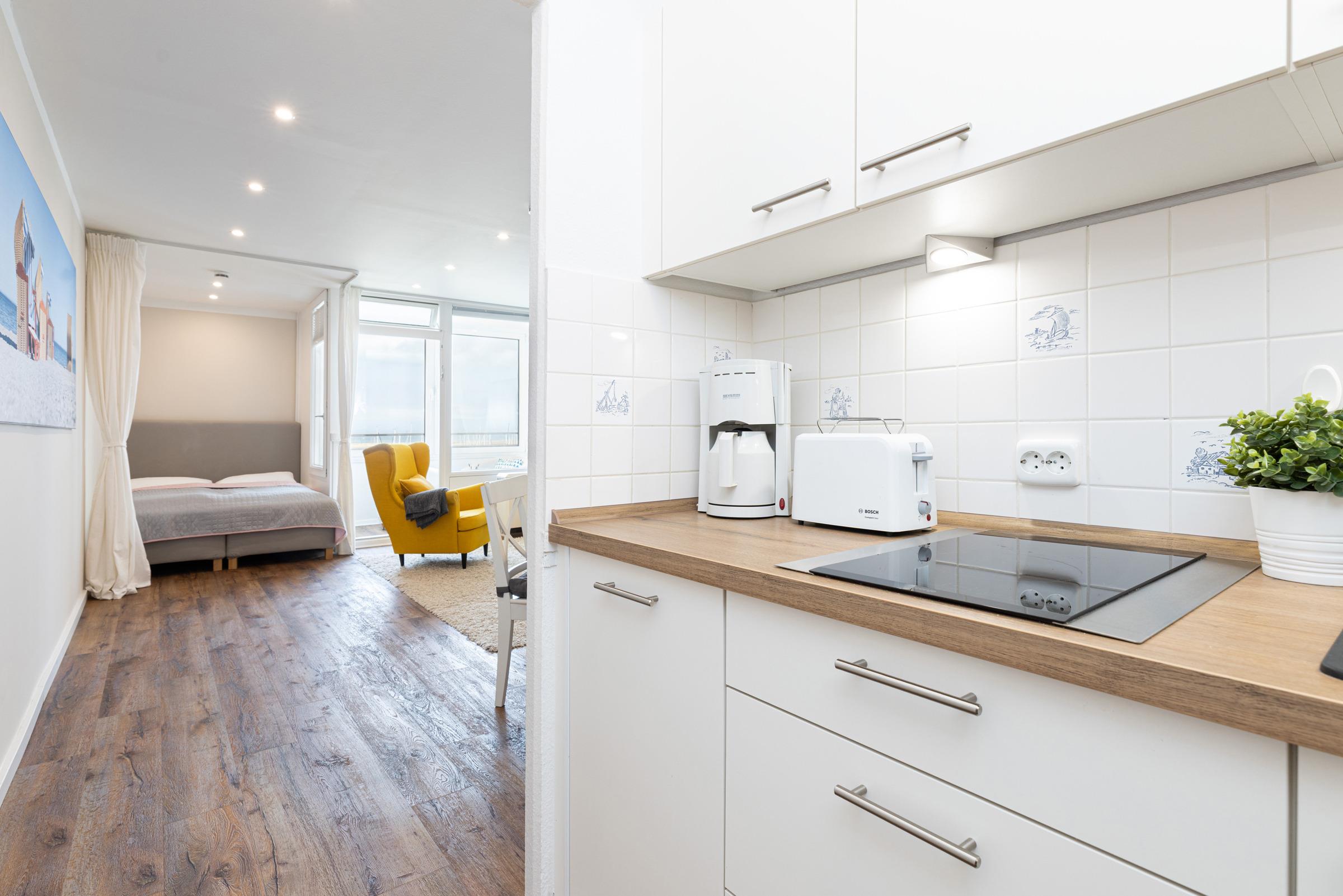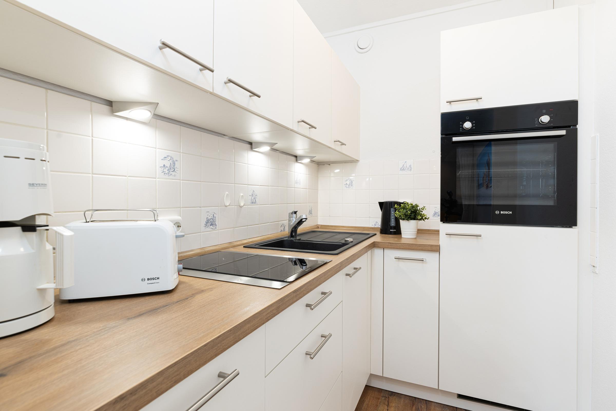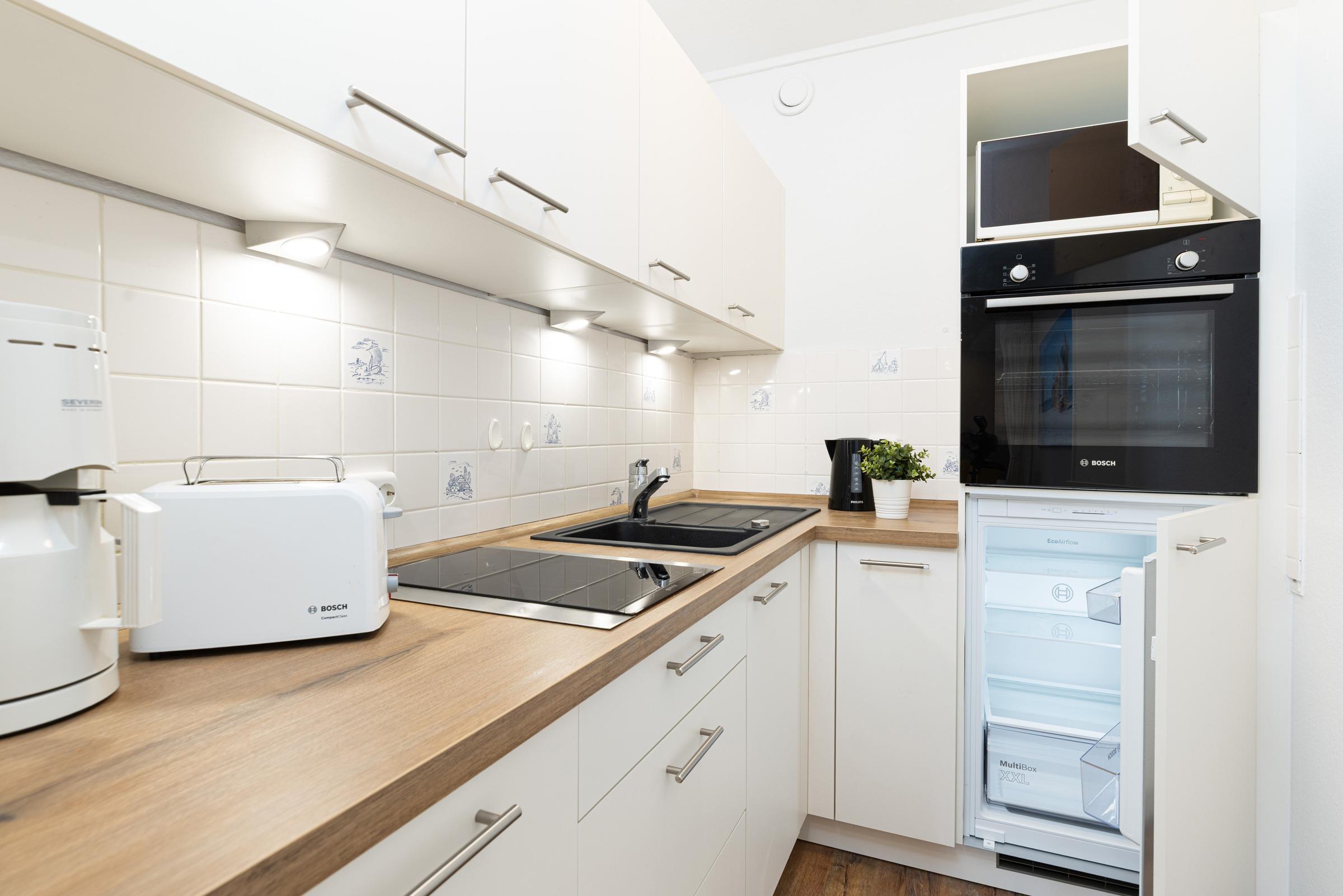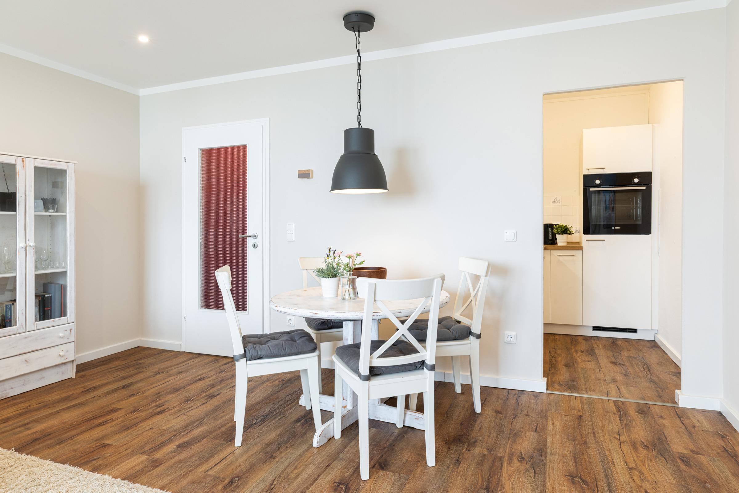 Die Wohnung besteht aus einem großen Wohn-Schlafzimmer, wobei das Doppelbett platzsparend und maßgenau in einer Nische untergebracht ist. Mittels Vorhang kann dieser Bereich sowohl tagsüber, als auch nachts wahlweise abgetrennt werden. Daneben finden Sie einen Wohnraum mit erweiterbarem Esstisch, sowie eine Sitzecke und eine einfach ausgestattete Küchenzeile. Das vorhandene Sofa kann bei Bedarf in eine Schlafcouch (Breite: 140cm) umgeklappt werden, ist allerdings nur für Kinder geeignet. Das moderne Badezimmer verfügt über eine Handtuchheizung und eine große, fast ebenerdige Dusche. Von hier aus kann man wunderbare Radtouren oder Wanderungen entlang der Küste oder durch die bezaubernden Salzwiesen mit Schafen, Kühen und Pferden unternehmen. In der Marina besteht die Möglichkeit, sich bei vorhandenem Sportbootführerschein, ein Motorboot zu chartern. Für Anhänger des FKK finden sie nicht weit entfernt einen entsprechend zugelassenen Strandabschnitt.