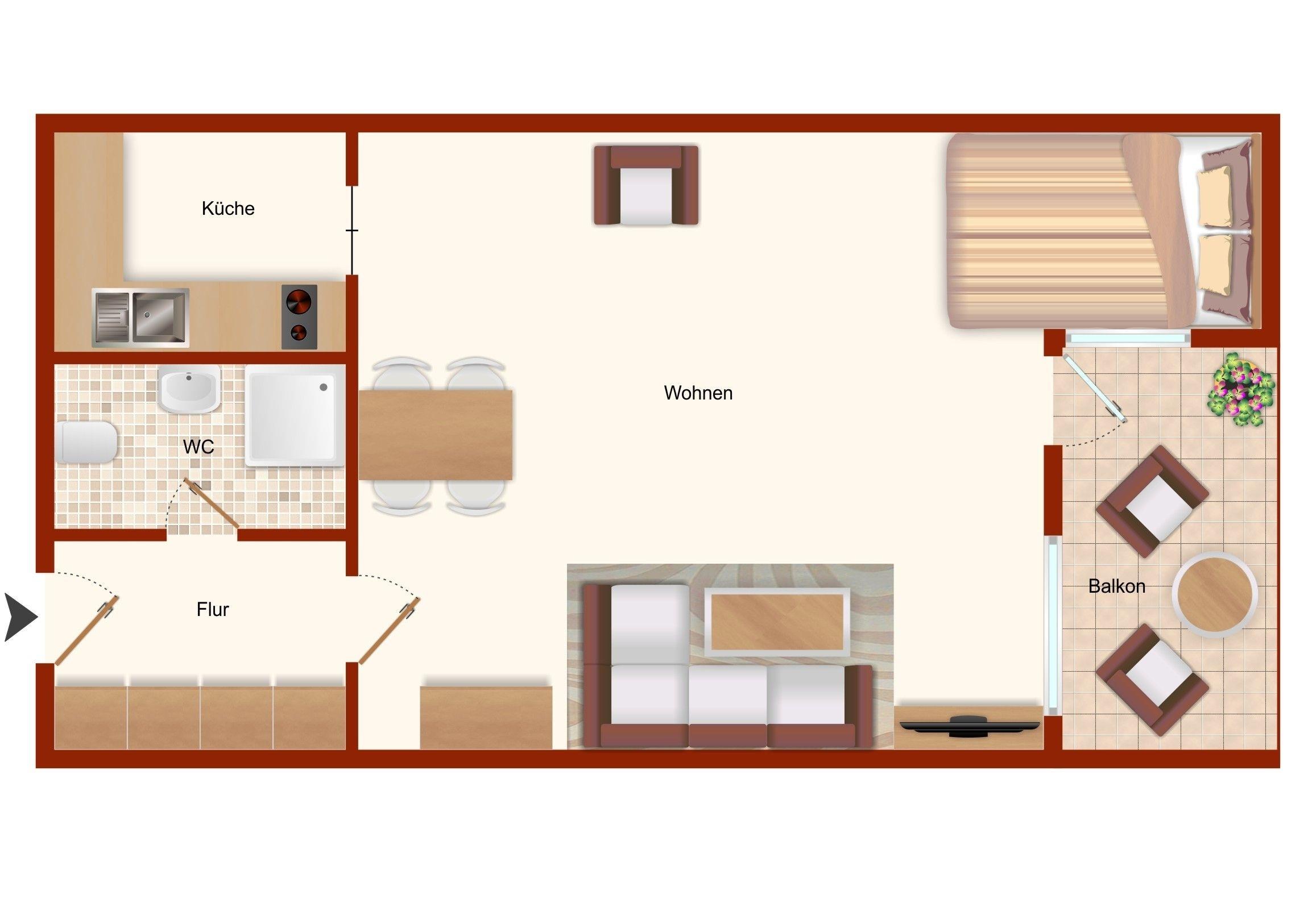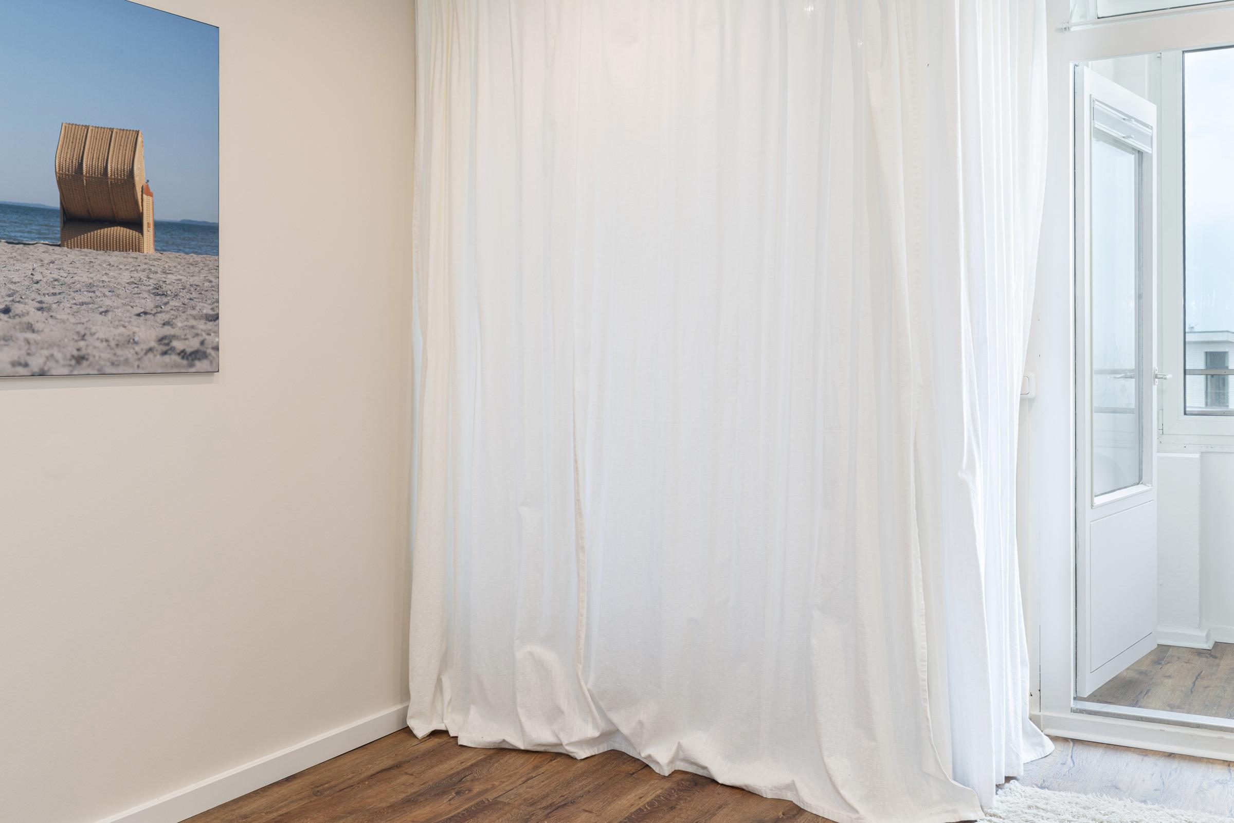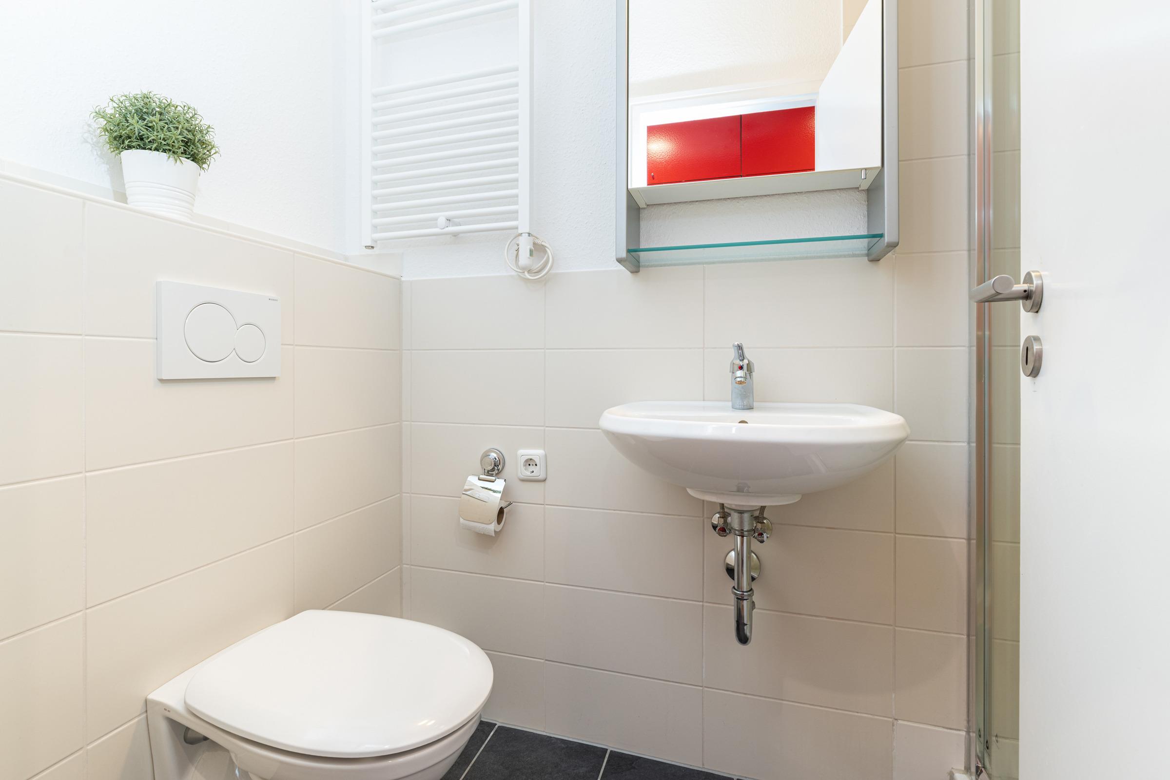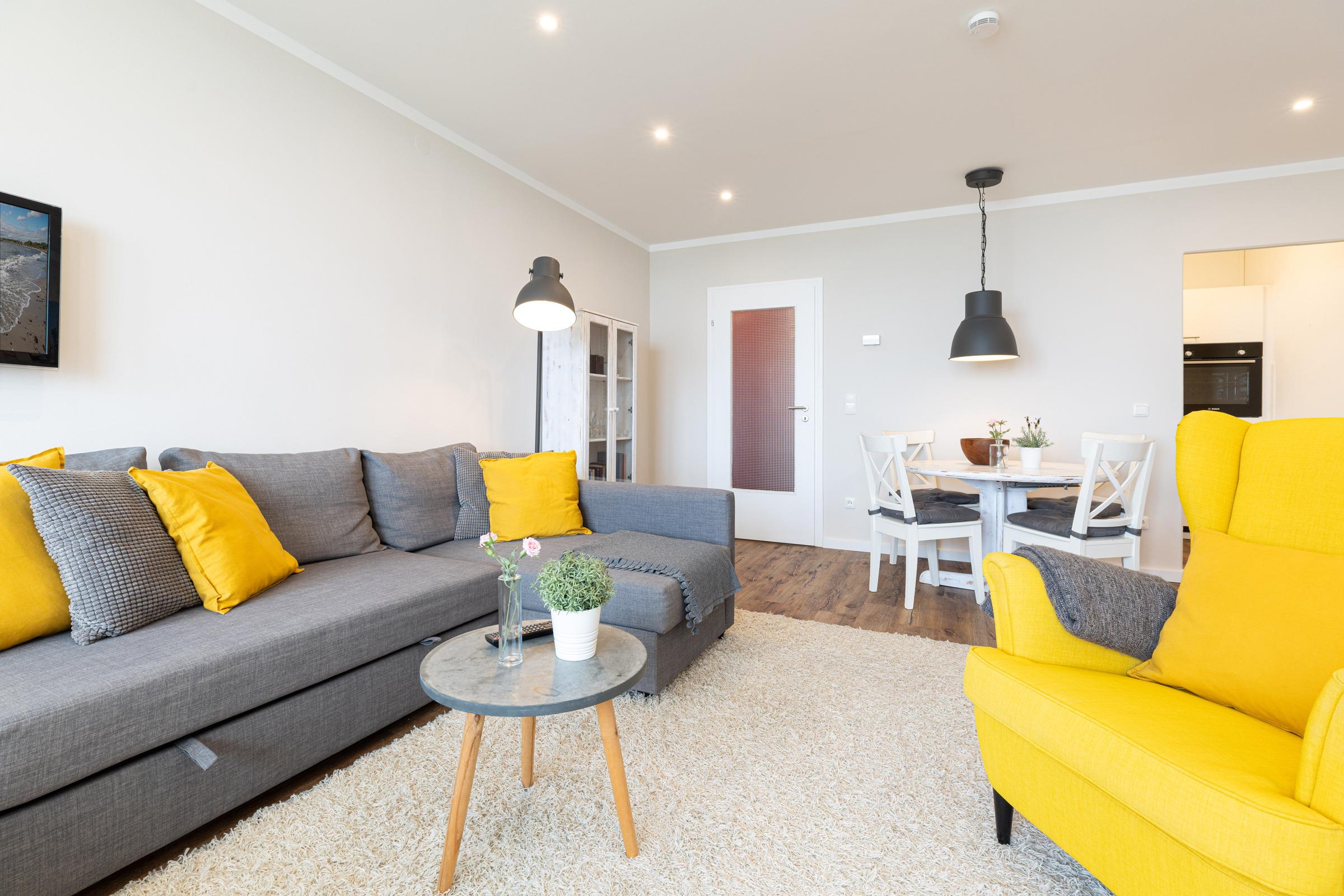 Die Wohnung besteht aus einem großen Wohn-Schlafzimmer, wobei das Doppelbett platzsparend und maßgenau in einer Nische untergebracht ist. Mittels Vorhang kann dieser Bereich sowohl tagsüber, als auch nachts wahlweise abgetrennt werden. Daneben finden Sie einen Wohnraum mit erweiterbarem Esstisch, sowie eine Sitzecke und eine einfach ausgestattete Küchenzeile. Das vorhandene Sofa kann bei Bedarf in eine Schlafcouch (Breite: 140cm) umgeklappt werden, ist allerdings nur für Kinder geeignet. Das moderne Badezimmer verfügt über eine Handtuchheizung und eine große, fast ebenerdige Dusche. Von hier aus kann man wunderbare Radtouren oder Wanderungen entlang der Küste oder durch die bezaubernden Salzwiesen mit Schafen, Kühen und Pferden unternehmen. In der Marina besteht die Möglichkeit, sich bei vorhandenem Sportbootführerschein, ein Motorboot zu chartern. Für Anhänger des FKK finden sie nicht weit entfernt einen entsprechend zugelassenen Strandabschnitt.