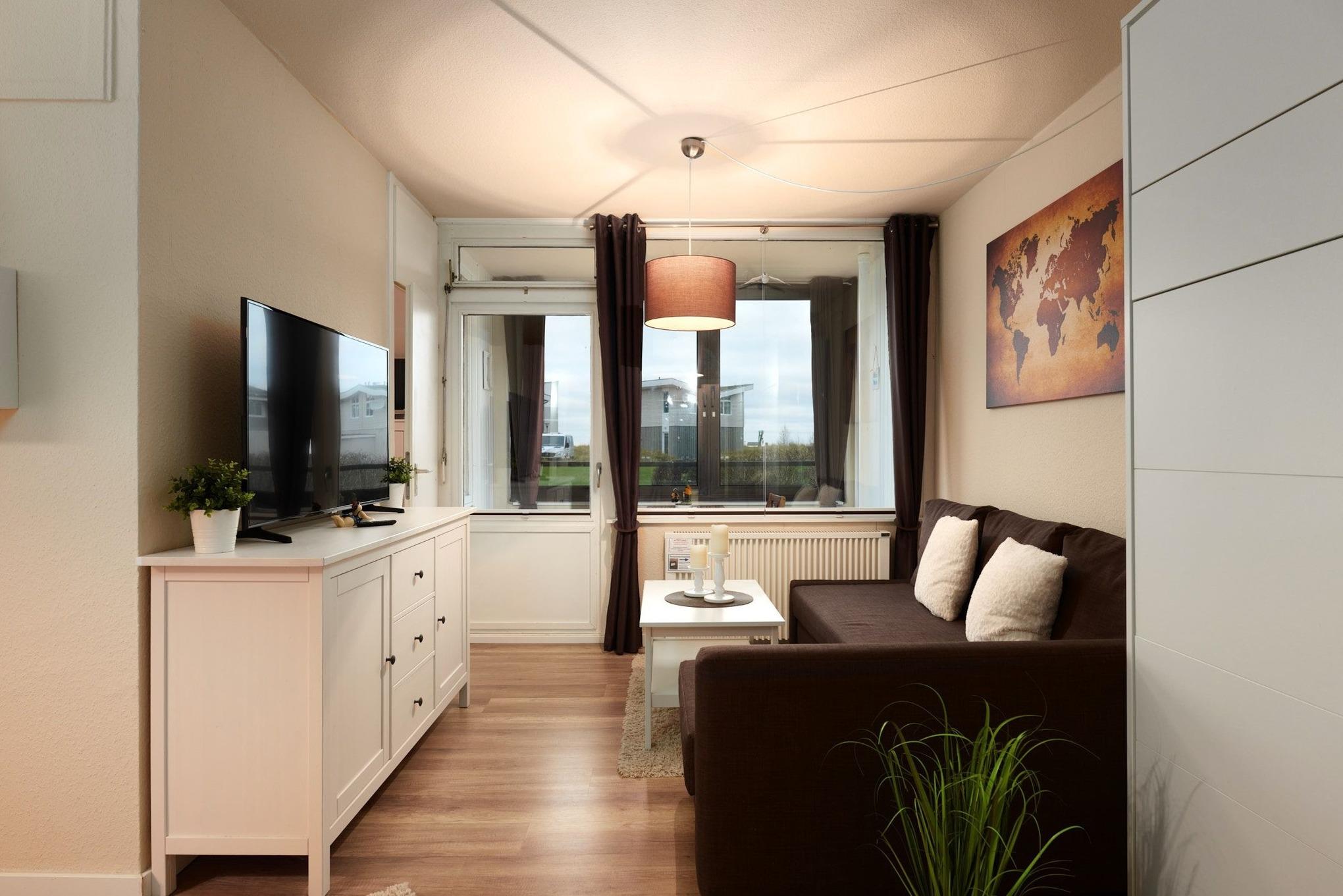 Diese einladende 2-Zimmer-Ferienwohnung für bis zu 4 Personen befindet sich im Erdgeschoss seeseitig im Haus Flying Dutchman an der Marina Wendtorf und ist stufenlos zu erreichen.