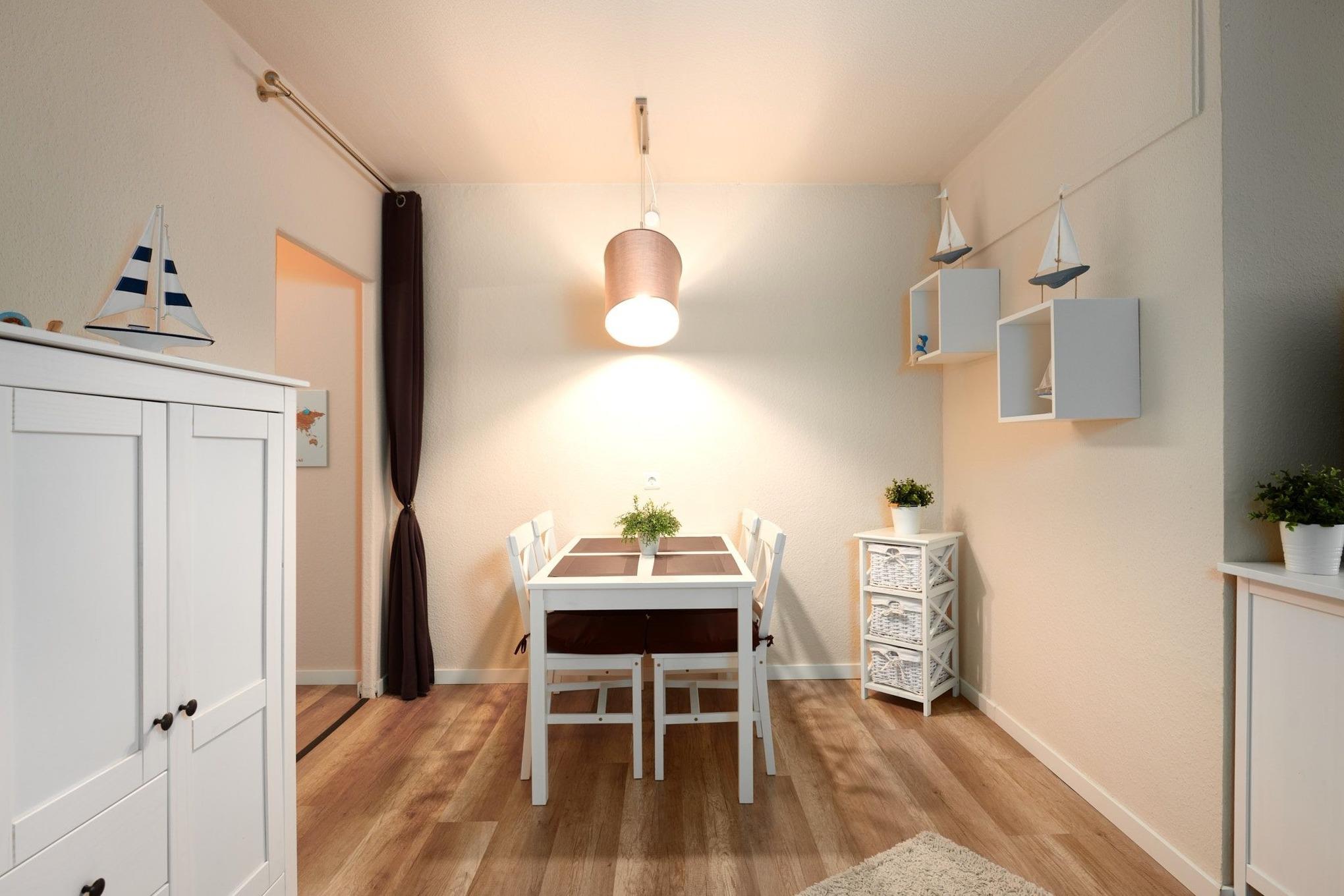 Die Wohnung besticht durch ihre gradlinige, moderne Einrichtung und ist ideal für den Familienurlaub: Im Wohn-/Schlafbereich erwartet Sie neben einer bequemen Sofaecke ein komfortables Schrankbett (Liegefläche 160x200 cm), während es sich zwei weitere Personen im Etagenbett (je 90x200 cm) im separaten Schlafzimmer gemütlich machen. Den Mittelpunkt bildet der gemütliche Essplatz mit großem Tisch vor der offenen Küche. Diese ist ausgestattet mit reichlich Geschirr, Ceranfeld, Backofen, Mikrowelle, Kühlschrank/Gefrierfach, Kaffeemaschine, Wasserkocher und Toaster.