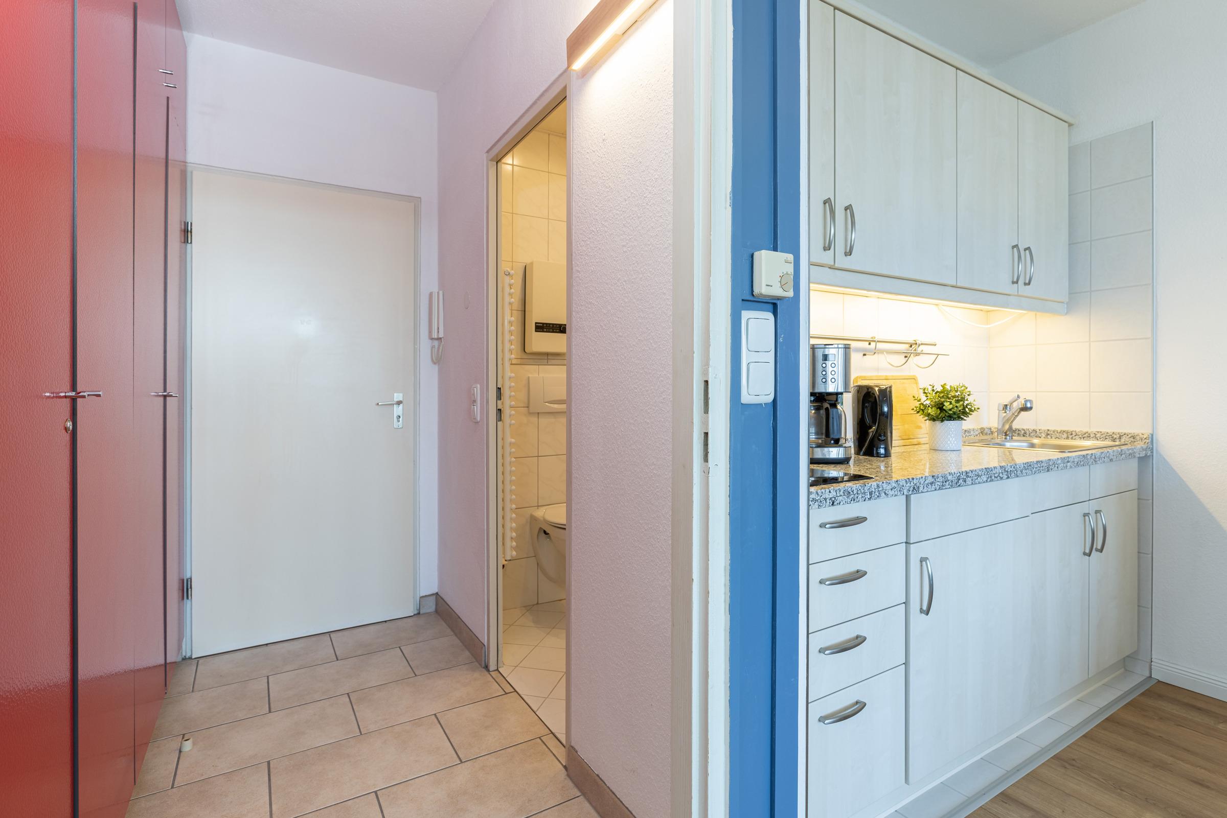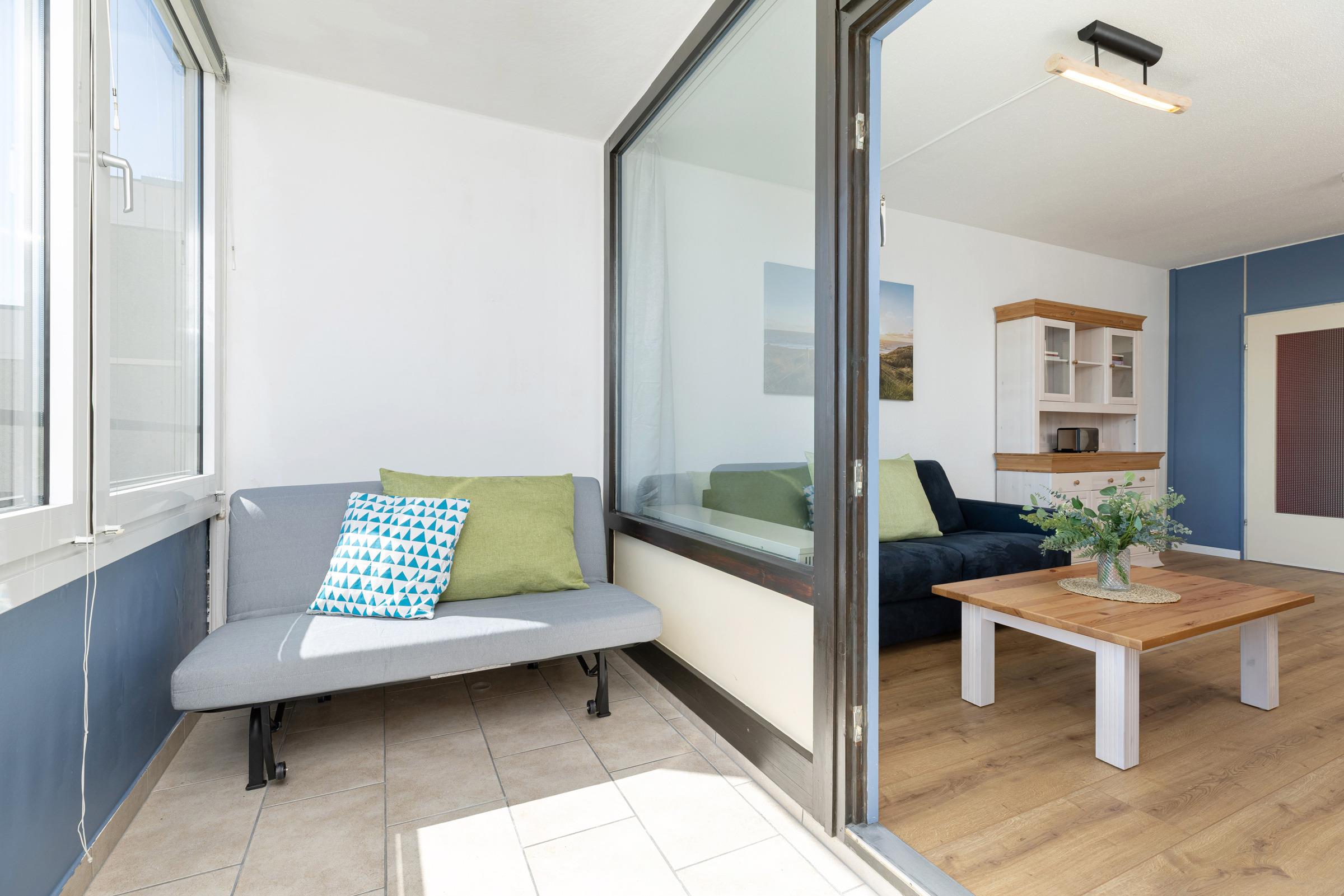 Der offene Wohnraum ist mit einer praktischen Pantryküche ausgestattet, die alles bietet, was man für die Zubereitung kleiner Mahlzeiten benötigt. Außerdem befindet sich hier ein Schlafsofa, das komfortabel Platz für zwei Erwachsene bietet. Der geschlossene Balkon wurde zu einem Schlafraum umgewandelt. Hier steht eine kleine Schlafcouch, die Platz für zwei Kinder bietet. Das Badezimmer ist funktionell gestaltet und verfügt über eine Dusche und ein WC. Diese Wohnung ist perfekt für kleine Familien oder Paare, die eine entspannte Auszeit am Meer genießen möchten.