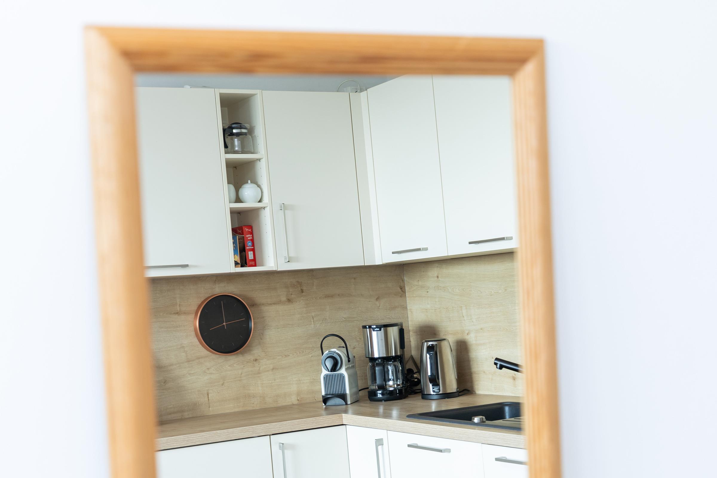 Die integrierte Einbauküche ist mit hochwertigen Marken-Geräten wie einem 2-Platten-Induktionsherd, Geschirrspüler sowie Backofen/Mikrowelle ausgestattet. Das bequeme Bett (140x200 cm) lädt zum erholsamen Schlafen oder zum Fernsehen ein. Für eine entspannte Workation an der Küste steht Ihnen ein Arbeitsplatz mit Monitor und ergonomischem Bürostuhl zur Verfügung. Der moderne Esstisch bietet viel Fläche zum Essen, Arbeiten oder Spielen und mit Hilfe der dimmbaren Beleuchtung ist eine gemütliche Atmosphäre vorprogrammiert.