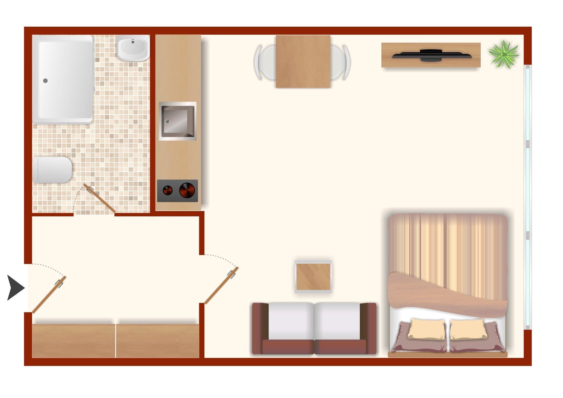 Das Appartement bietet alles, was man für einen Urlaub am Meer benötigt: ein helles Badezimmer mit Dusche, eine kleine Küchenzeile und ein bequemes Doppelbett sowie eine Schlafcouch, einen Kleiderschrank und einen Fernseher. Auch ein Kinderreisebett lässt sich noch gut unterbringen.