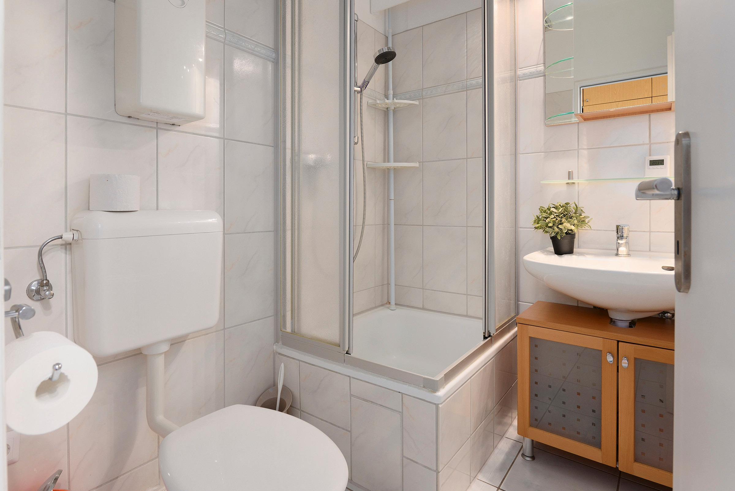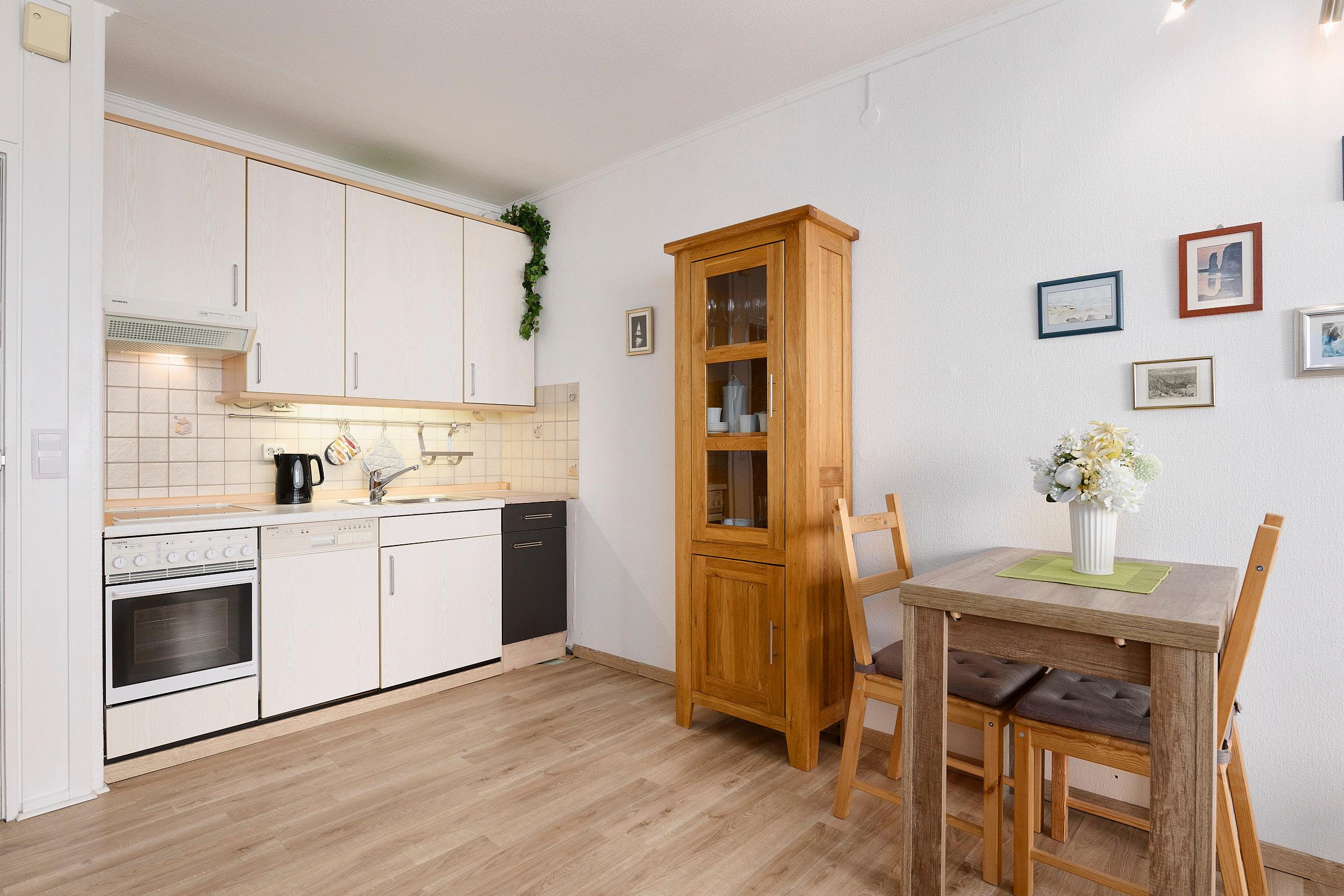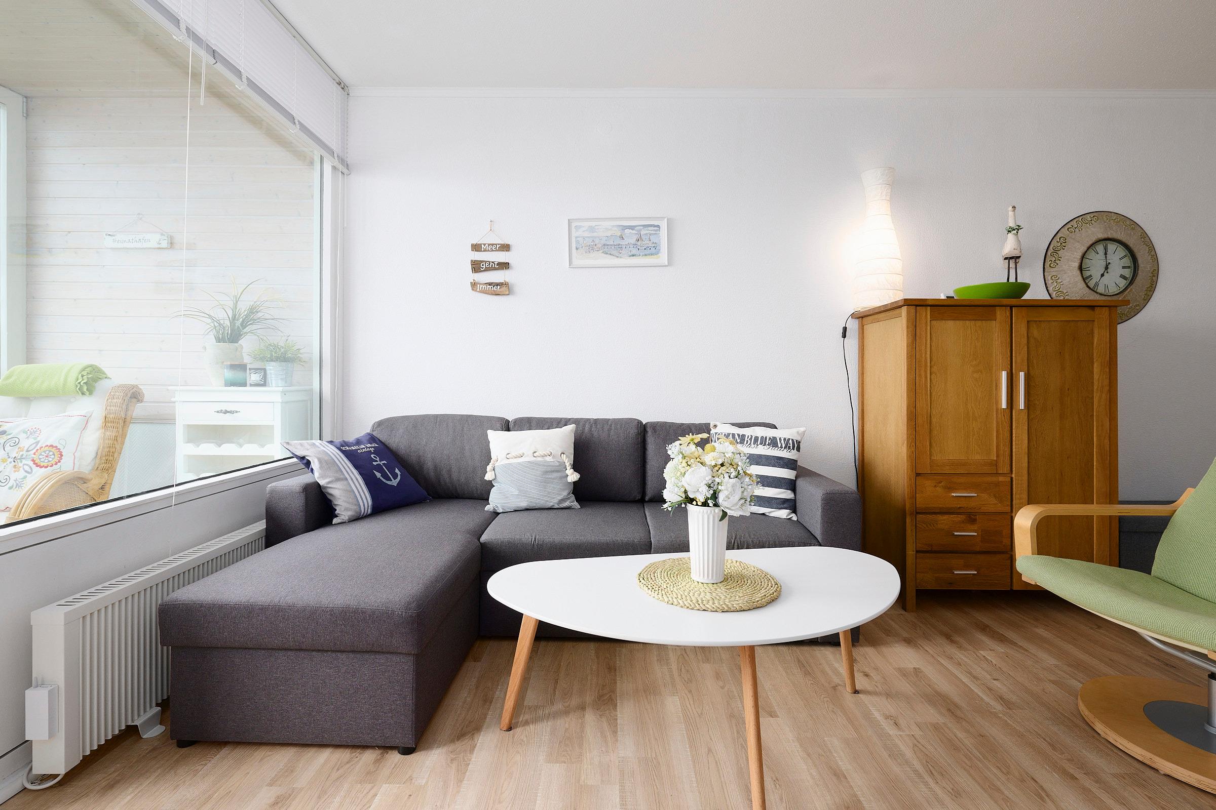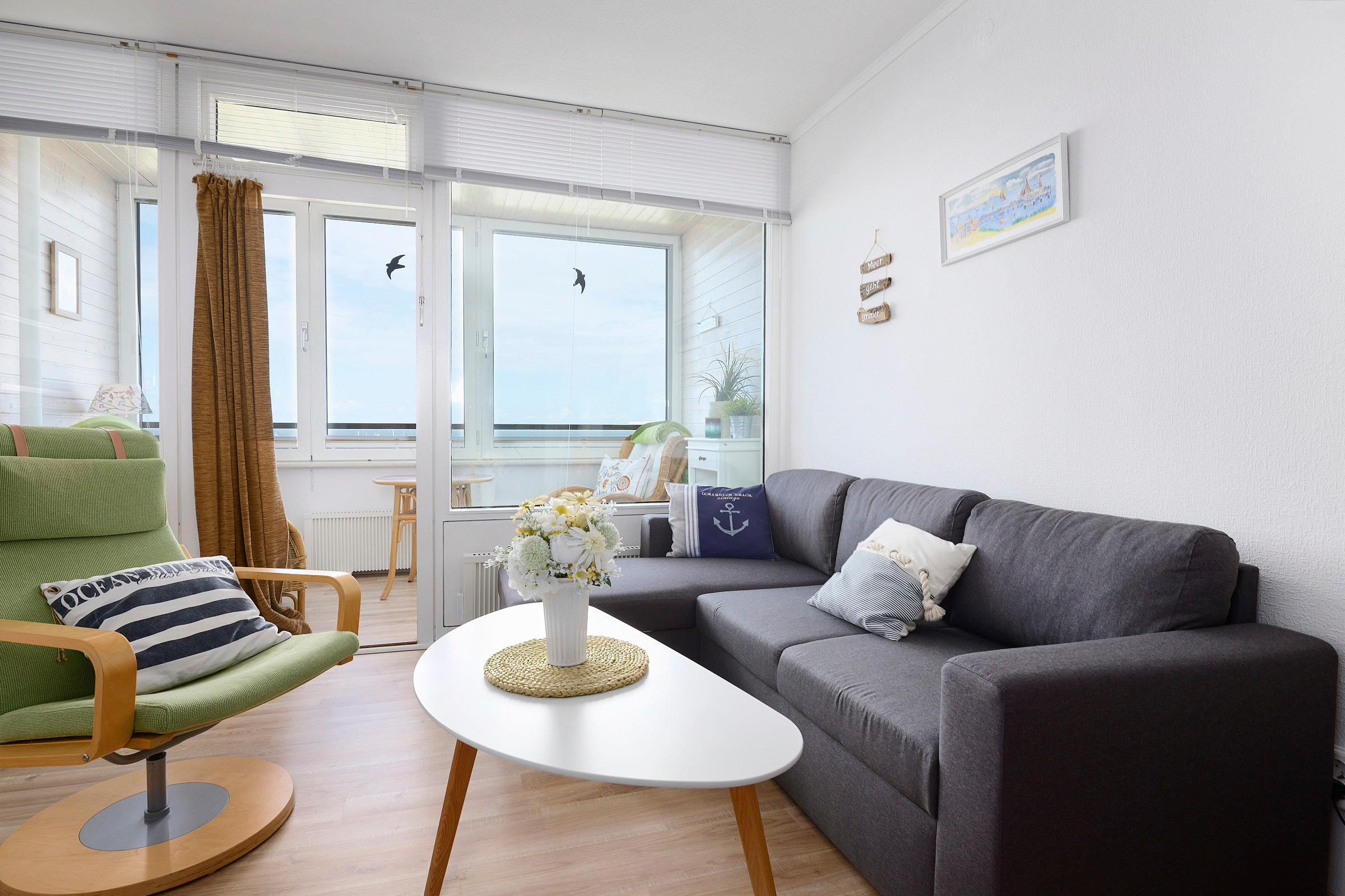 Schon beim Betreten der lichtdurchfluteten Ferienunterkunft werden Sie mit einem schönen Blick auf das Meer begrüßt. Die kleine Küchenzeile wartet mit einem Ceranfeld, Backofen, einer Spülmaschine und guter Küchengrundausstattung auf Sie. Genießen Sie Ihren frisch aufgebrühten Morgenkaffee entweder am ausziehbaren Tisch im kombinierten Wohn- und Schlafbereich mit L-förmigen Sofa oder auf der verglasten Loggia mit zu öffnenden Fenstern und wundervollem Ausblick auf die Ostsee und die Kieler Förde. Auf dem gemütlichen Sofa, das sich für die Nacht schnell in eine gemütliche Schlafstätte (Liegefläche: 140x200cm) verwandeln lässt, können Sie alternativ zum Blick auf die Ostsee auch das TV-Programm auf dem Smart-TV genießen. Zum Verdunkeln der Ferienunterkunft dienen sowohl die Plissees der Loggiafenster als auch die Jalousien an den Innenfenstern. Für Ihre Urlaubsgarderobe nutzen Sie den Kleiderschrank im Wohnraum. Für Jacken und Mäntel steht Ihnen zusätzlich eine Garderobe bereit. Das kleine Duschbad verfügt über eine Spiegelfläche auf der Innenseite der Badezimmertür und einen Glasspiegelschrank mit Stauraum für Ihre Kosmetikartikel.