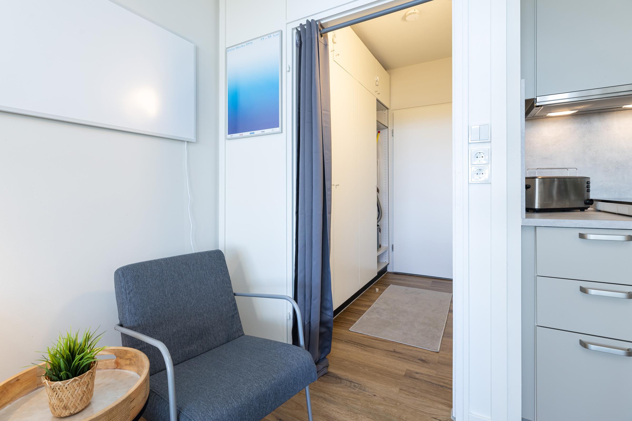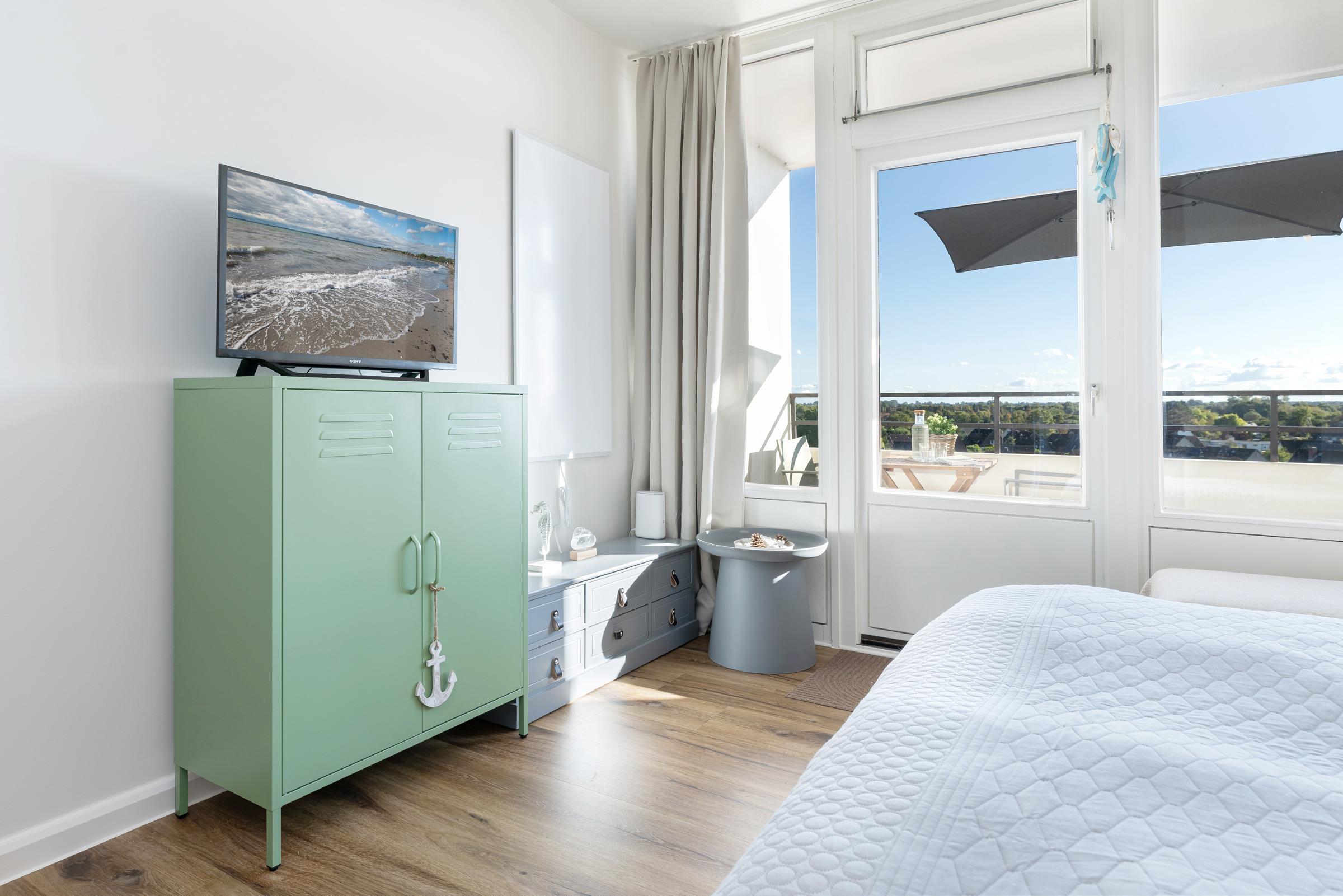 Der offene Wohn- und Schlafbereich ist gemütlich eingerichtet und verfügt über ein komfortables Doppelbett, einen Flachbild-TV sowie eine große Fensterfront, die viel Licht hereinlässt und den Blick auf die traumhafte Landschaft Schleswig-Holsteins freigibt. Vom Wohnbereich aus gelangen Sie auf den Balkon mit Südausrichtung, der mit Sitzmöbeln ausgestattet ist – perfekt, um Tage in der Sonne zu genießen.