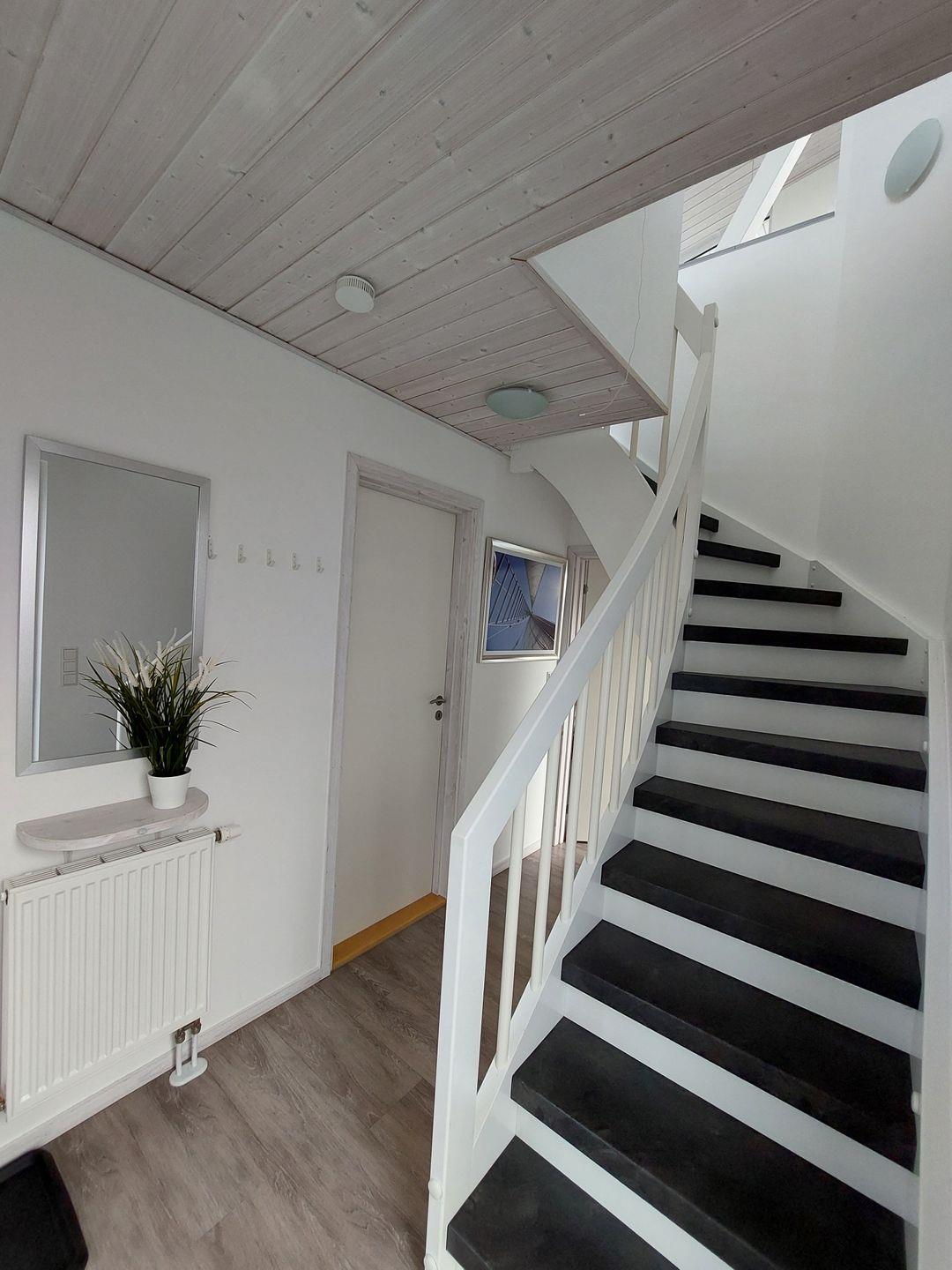 Im ersten Obergeschoss erwartet Sie ein offener, lichtdurchfluteter Wohn- und Essbereich mit Schlafcouch für 2 Kinder und angrenzender vollausgestatteter Küche. Der gemütliche Wohnbereich bietet ausreichend Sitzgelegenheiten, einen 50-Zoll-SmartTV, einen Bioethanol-Kamin und den Zugang zum Balkon. Die vorhandene Klimaanlage verspricht ein angenehmes Innenraumklima zu jeder Zeit. Im Außenbereich befinden sich Sitzmöglichkeiten, ein Sonnenschirm, Sonnenliegen sowie ein Holzkohlegrill. Ebenfalls befindet sich am Haus ein kostenfreier PKW Stellplatz und ein abschließbarer Fahrradschuppen. Vom Balkon aus genießen Sie den Blick Richtung Meer. Ob laue Sommerabende, stürmische Herbstnachmittage oder kühle Wintertage: diese Doppelhaushälfte besticht mit seiner Ausstattung sowie einer naturnahen Umgebung zu jeder Jahreszeit.
