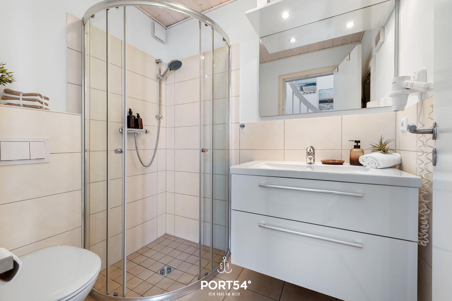 Im Erdgeschoss befinden sich zwei Schlafzimmer. Eines davon bietet zwei zusammengeschobene Einzelbetten (zusammen 180x200cm) und das andere zwei Einzelbetten (je 90x200cm). Eines der Schlafzimmer verfügt über einen TV, sowie beide über verdunkelbare Fenster. Ebenfalls im Erdgeschoss gelegen: das Badezimmer mit ebenerdiger Dusche, WC, Waschbecken und Trockensauna.