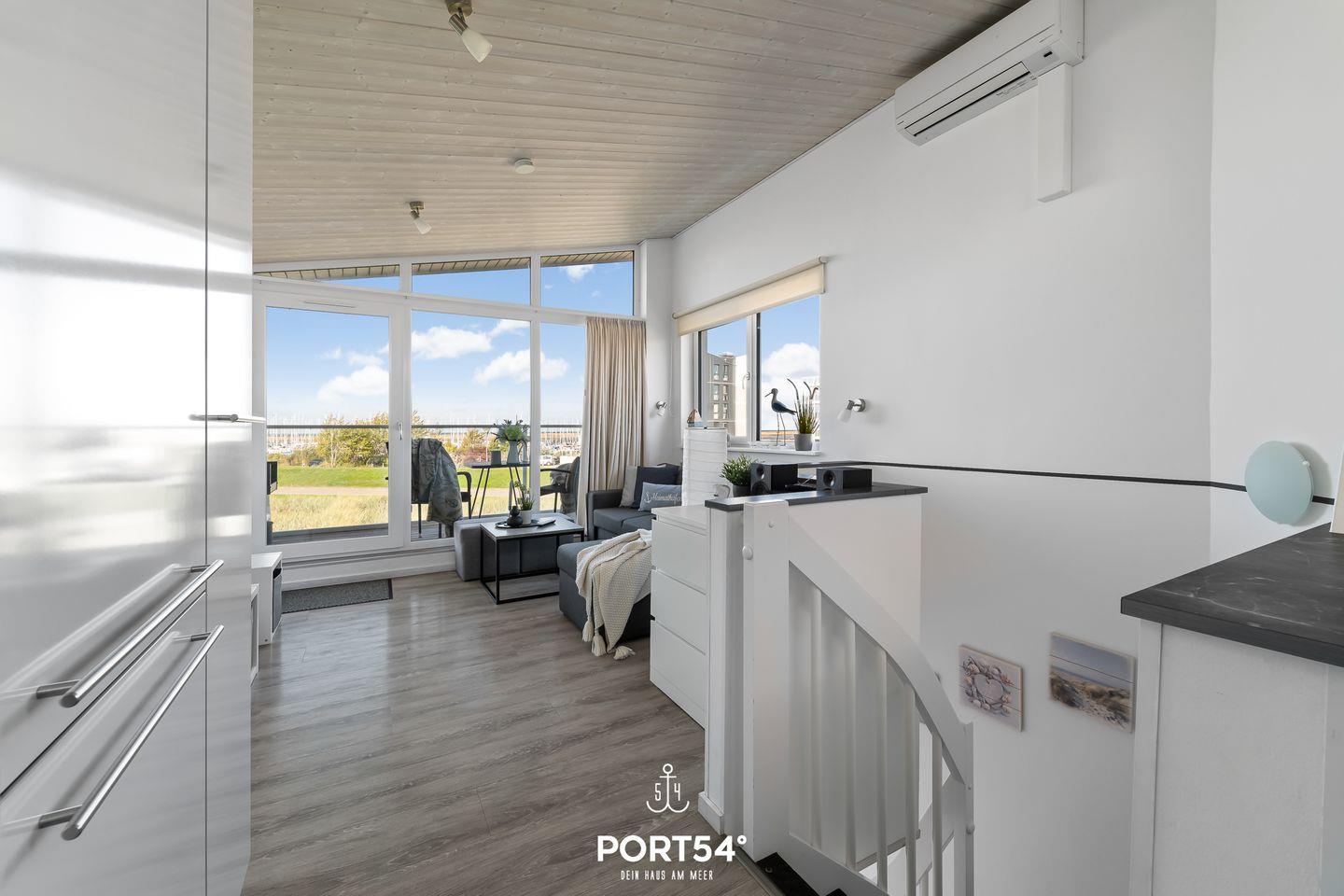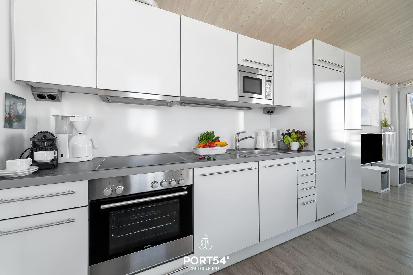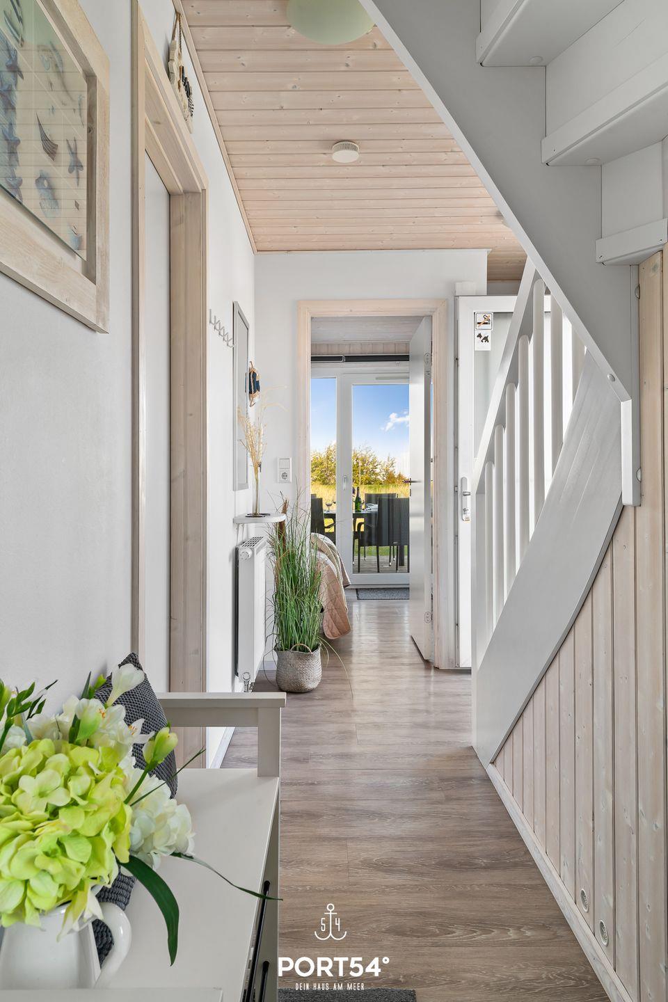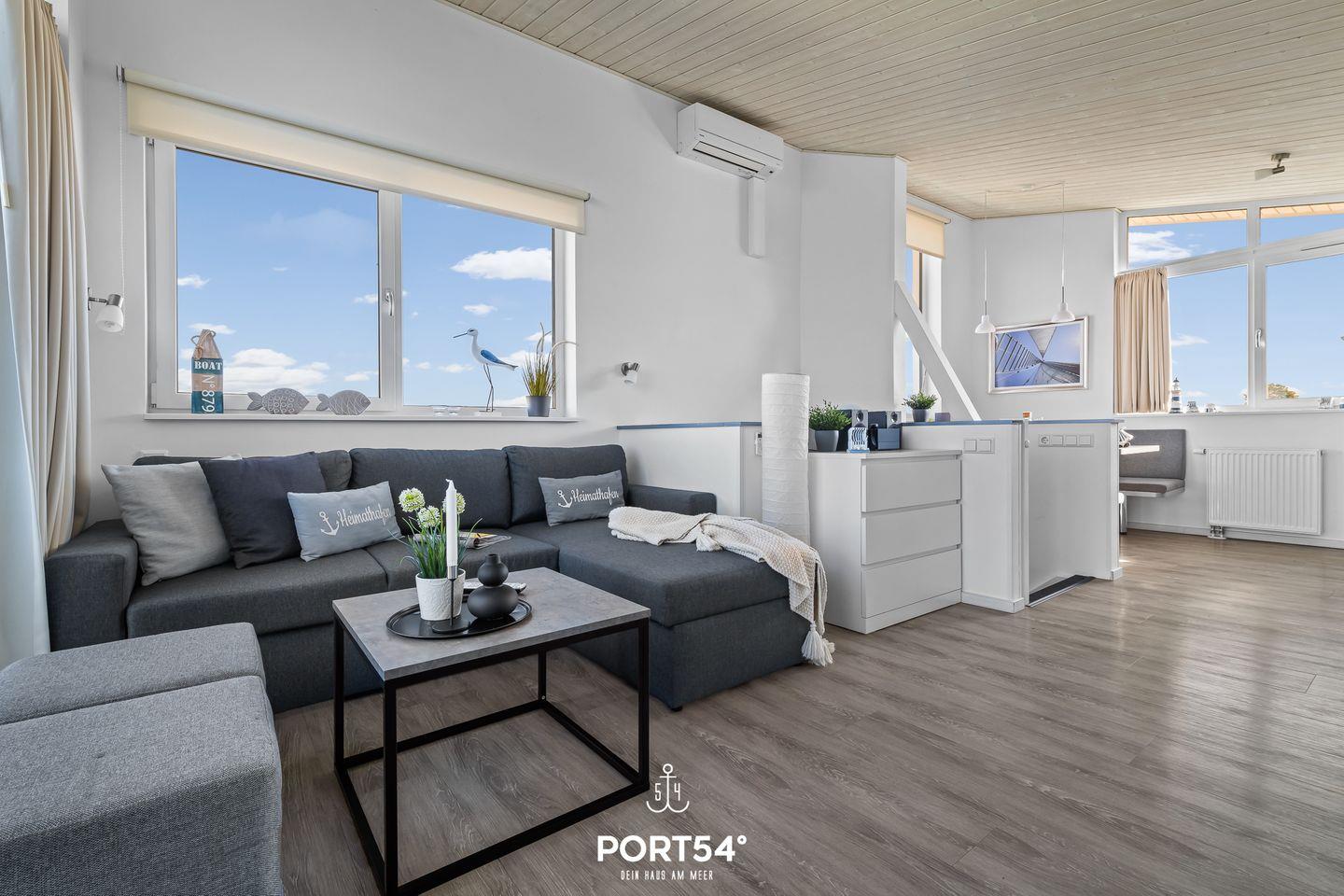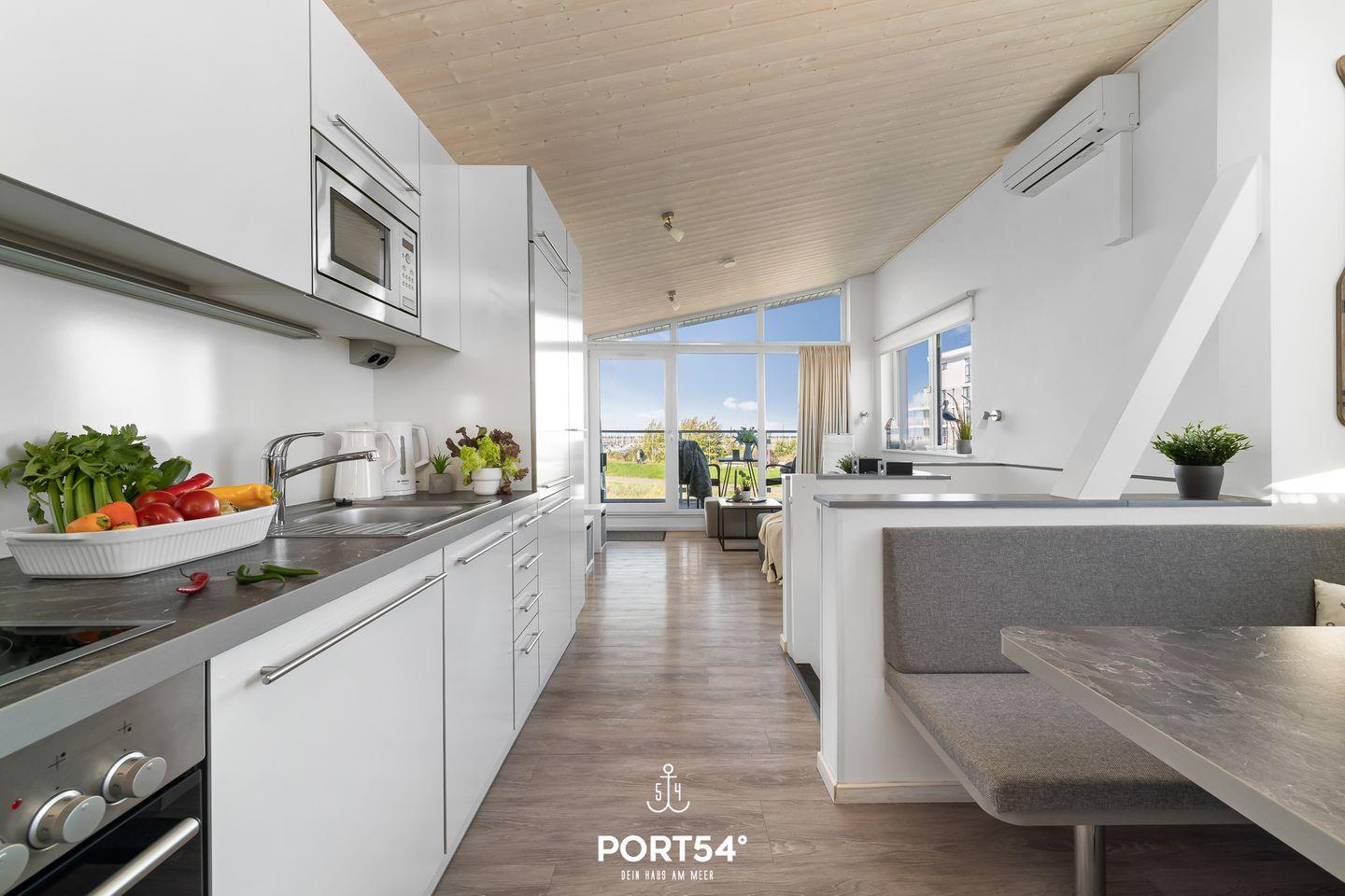 Im ersten Obergeschoss erwartet dich ein offener, lichtdurchflutetet Wohn- und Essbereich mit angrenzender vollausgestatteter Küche. Der gemütliche Wohnbereich bietet ausreichend Sitzgelegenheiten, einen 50-Zoll-SmartTV, einen Bioethanol-Kamin und den Zugang zum Balkon. Die vorhandene Klimaanlage verspricht ein angenehmes Innenraumklima zu jeder Zeit. Im Außenbereich befinden sich Sitzmöglichkeiten, ein Sonnenschirm, Sonnenliegen sowie ein Weber-Elektrogrill. Ebenfalls befindet sich am Haus ein kostenfreier PKW Stellplatz und ein abschließbarer Fahrradschuppen. Vom Balkon aus genießen Sie den Blick auf die Ostsee und den Yachthafen.